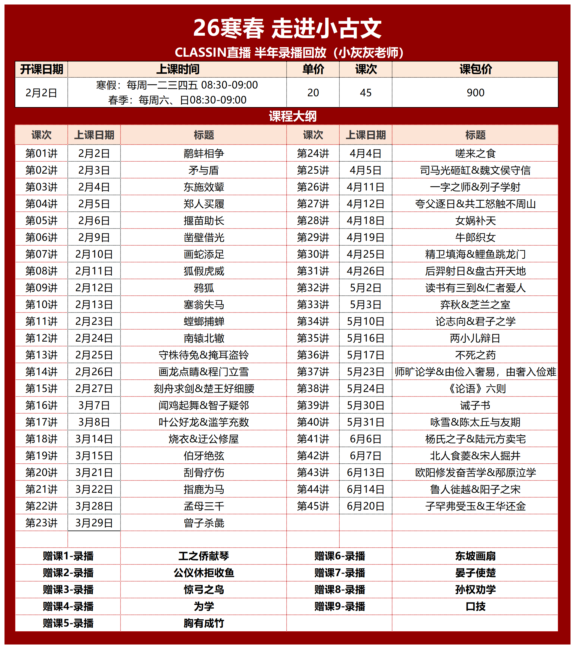 一共45讲 20元/30分钟/讲,课包900