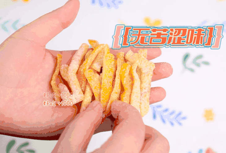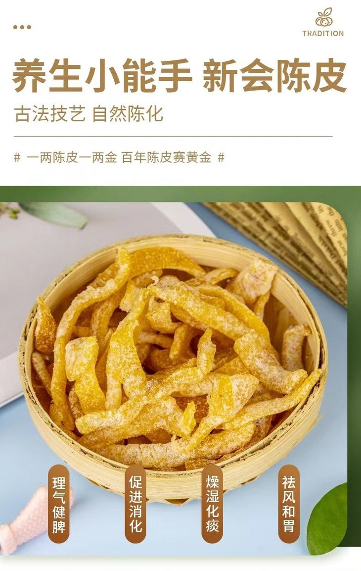 蜜饯类单吃容易腻❌ 但加入陈皮真就是黄金CP ~ 🔥0-5年的陈皮,非常润甜,适合入膳~ 🔥5-10年的陈皮,口舌回甘,适合日常泡水喝~ 🔥10年以上的陈皮,已完全陈化为药香味,药用价值极高! 👍陈皮当属新会陈皮最为上乘! 传统手工开皮,自然生晒! 所产陈皮乏清香却无苦涩味~ 🐮严选适宜入膳的陈皮切丝! ❗❗切丝工艺必须讲究~ 精制过程中去白襄和果蒂 加入甘草糖渍☀恒温烘烤48小时!! ❗❗既锁住了风味,也兼顾了内里湿柔~