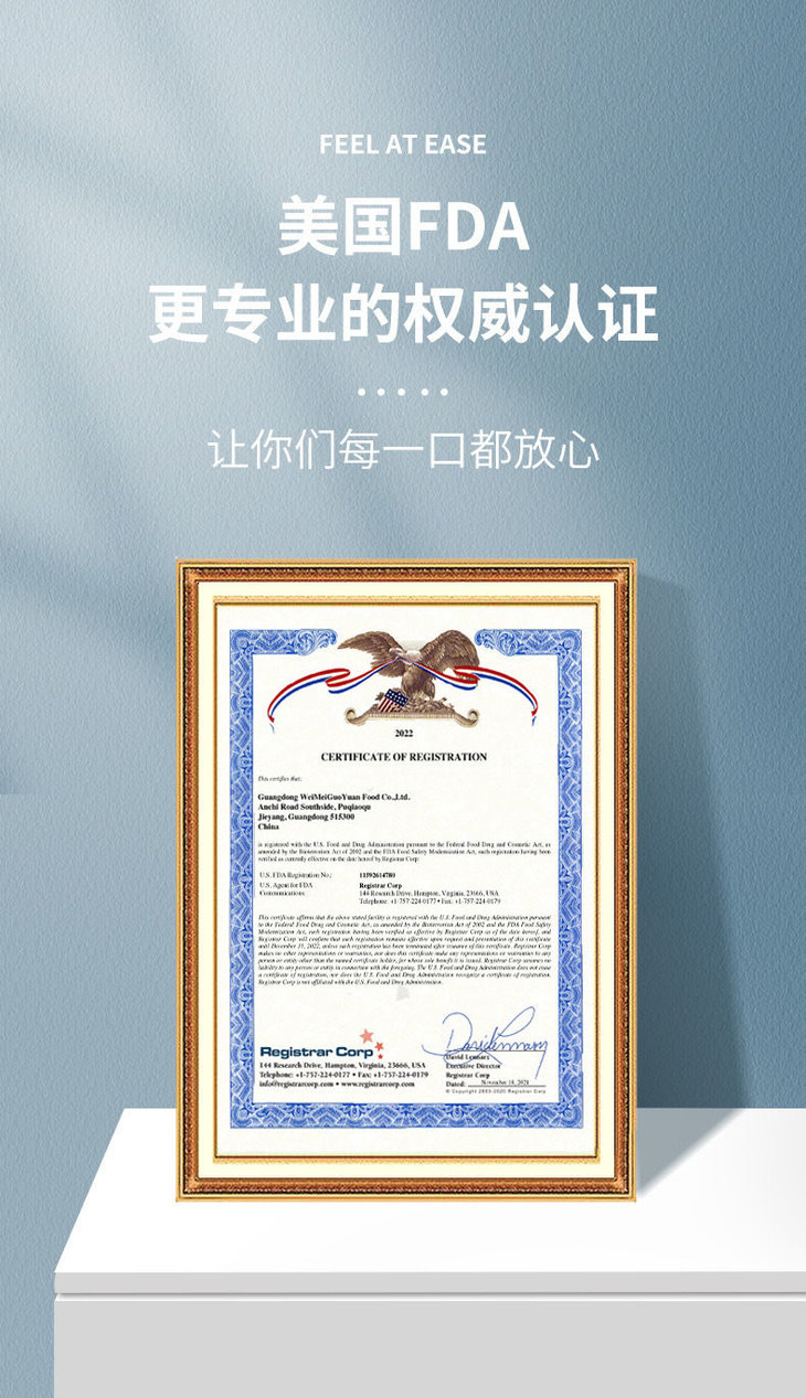 👏好吃的蜜饯当然来自于靠谱的工厂~ 国内许多知名品牌代工厂,具有代表性的有良品铺子等众多品牌! ❗❗中国龙头企业,独家加工工艺,厂家直供果物蜜饯! 自有生产基地4个,合作种植基地2个,生产总面积达86000多平米! 40年企业沉淀,产品畅销于海内外,港澳台和东南亚各国, 产品辐射广州,深圳,上海,南京,武汉,杭州,西安等全国200多个城市! 更是斩获了“❤美国人健康守护神”之称的FDA认证书! 👉真实做到对食品供应安全、干净、新鲜的保证! 👍这样严谨的产品才敢拿给老人小孩吃啊!