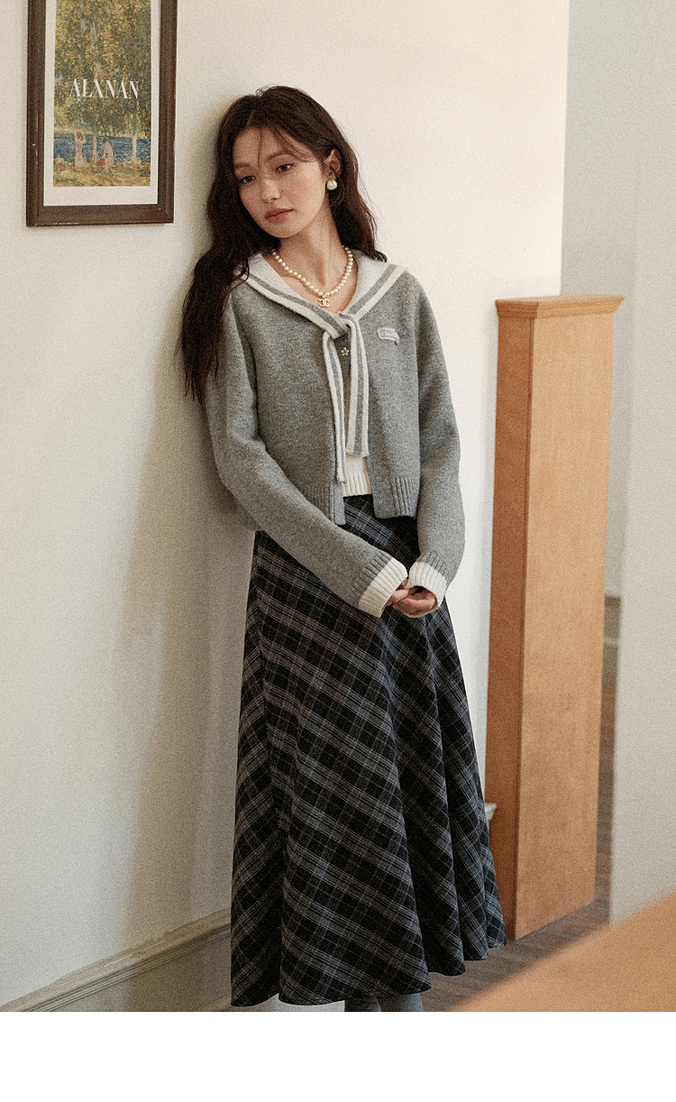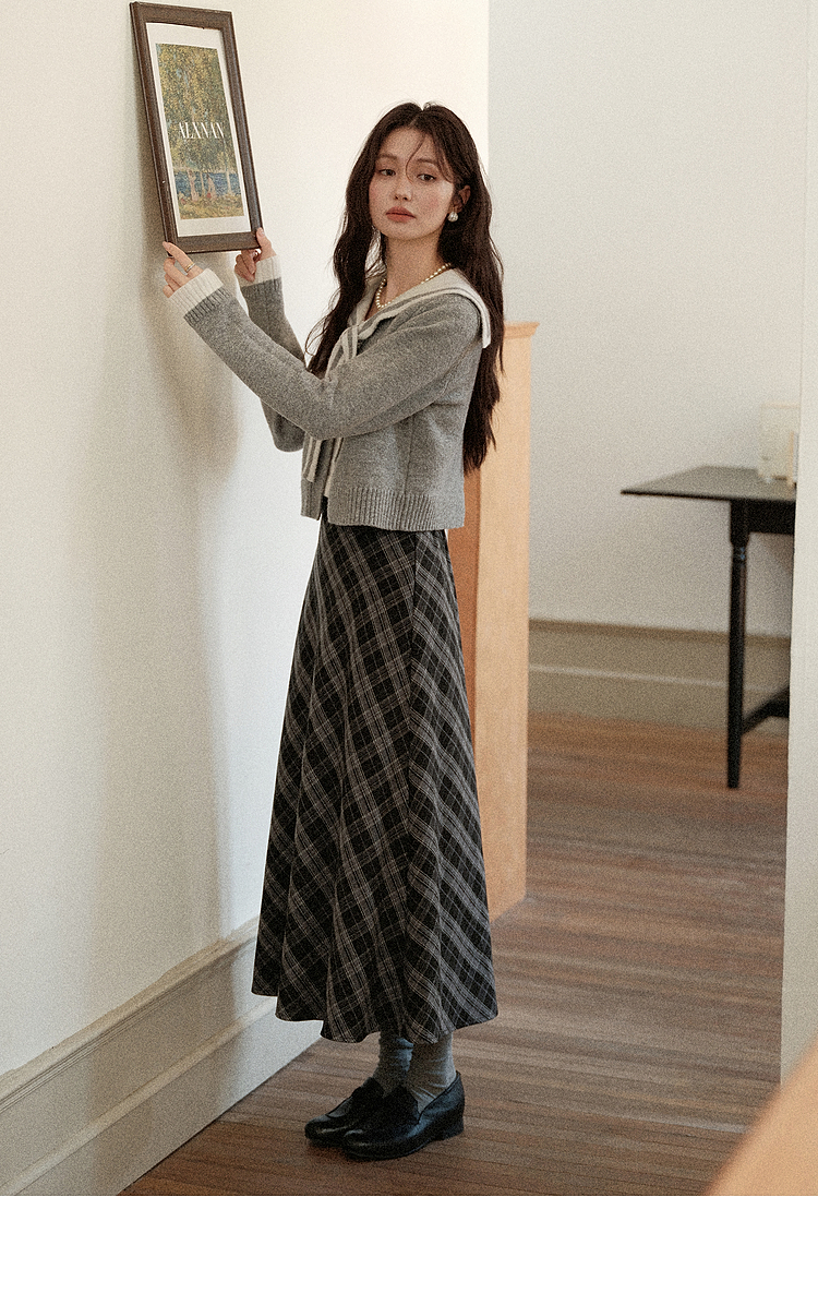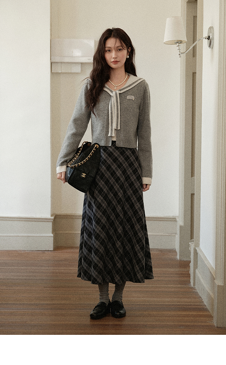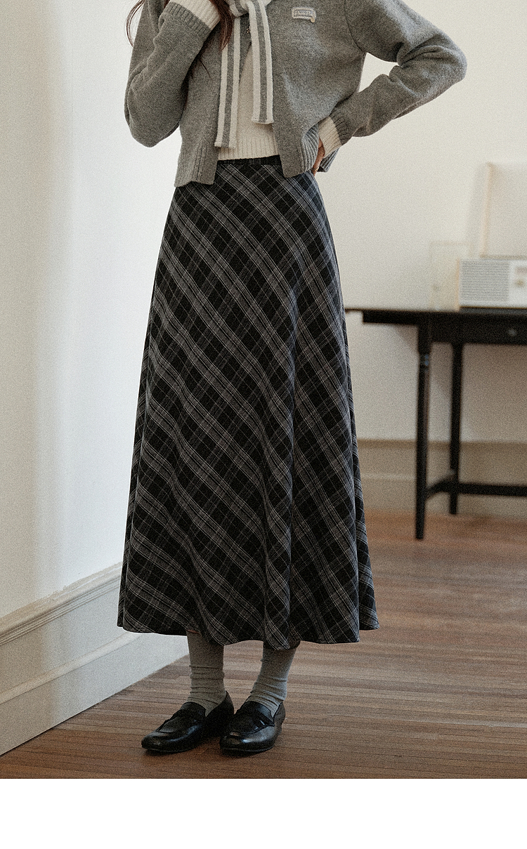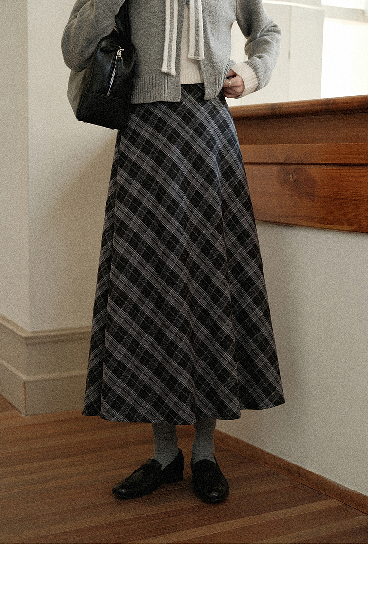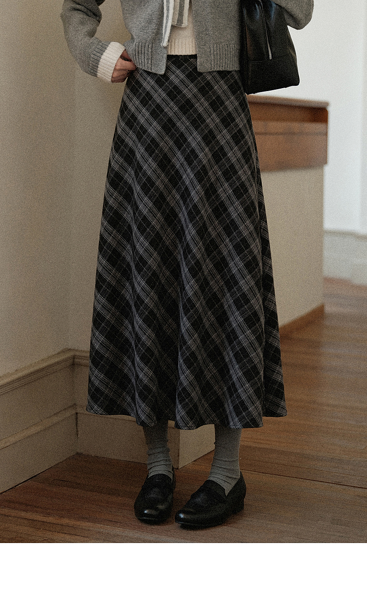 鹿向南「灰绮格语」黑灰色格纹高腰半身裙女初秋斜纹显瘦A字长裙