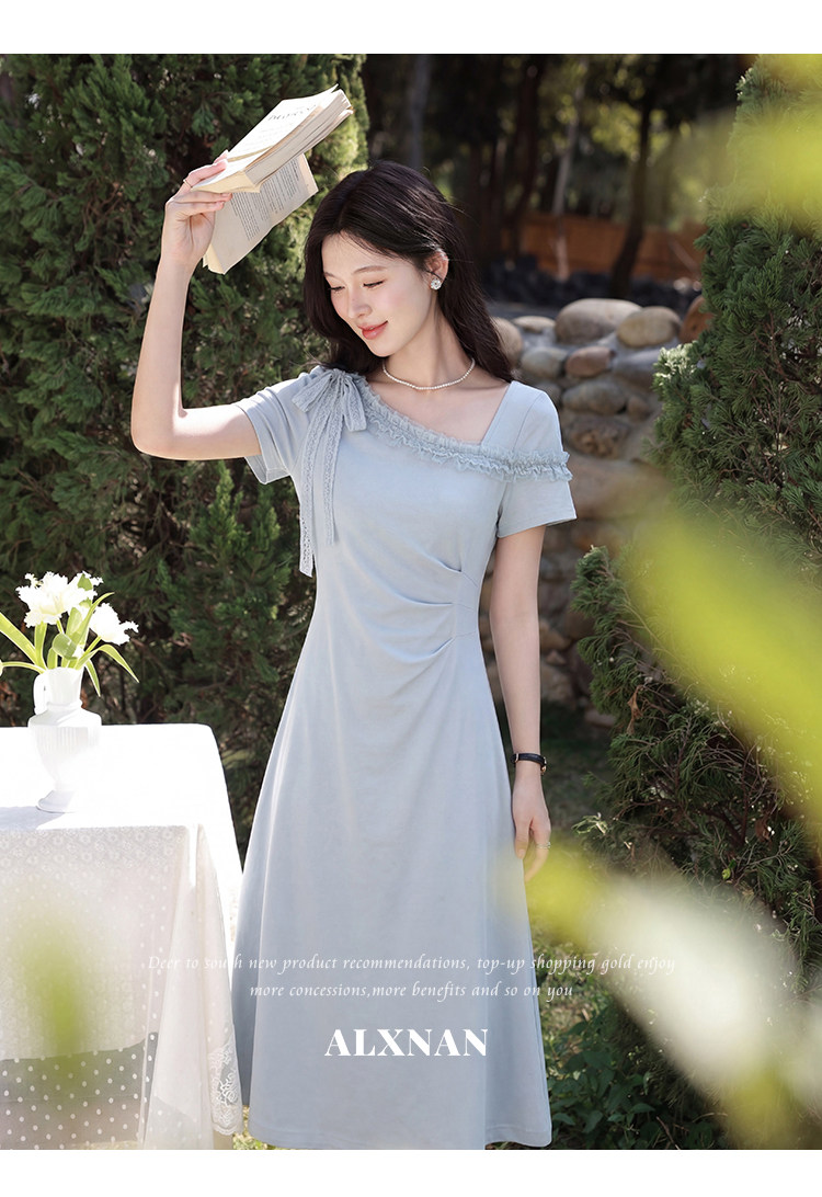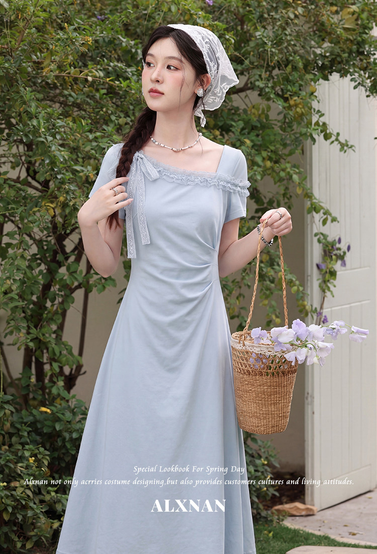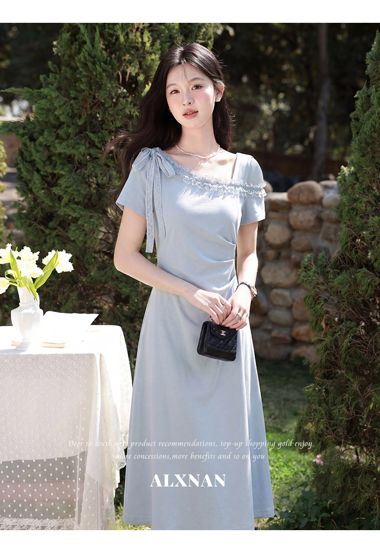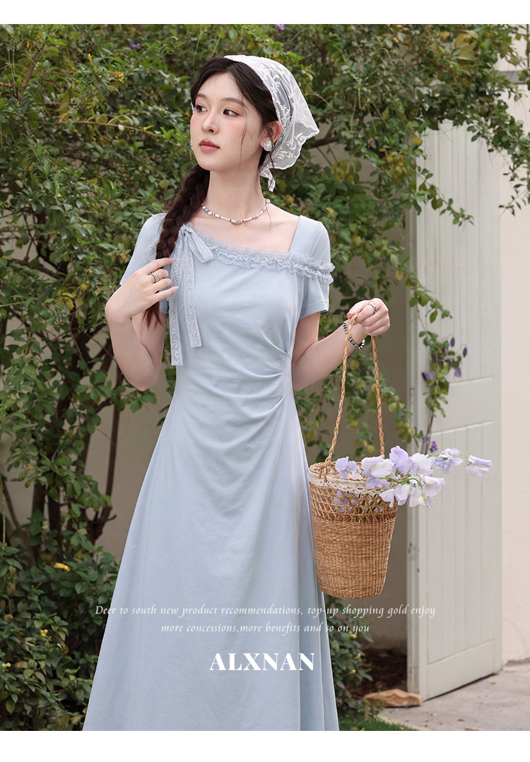 鹿向南【雾里温柔】法式斜领蓝色连衣裙女夏新款气质修身显瘦裙子