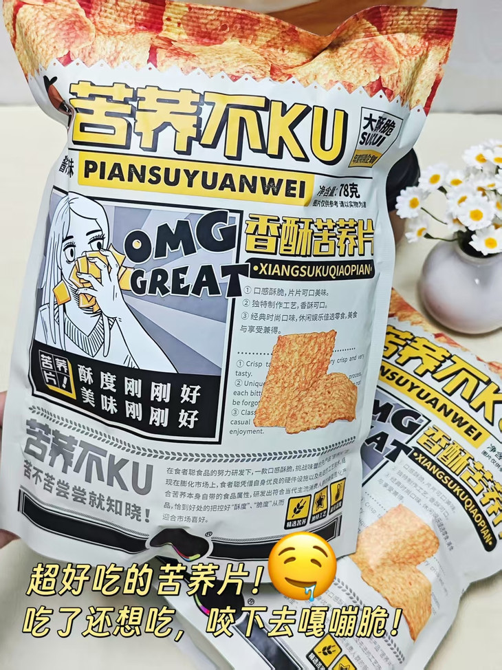 追剧总忍不住想吃点啥?这款香酥苦荞片就是你的 “追剧搭子”! 📺 浓郁的酱汁牛排味一吃就上头, 🥩 酥度刚刚好,不会因为太硬硌得腮帮子疼,也不会一拿就碎, 每一片都完整裹满调味料,嚼着超入味~ 配料里的苦荞粉带来淡淡的谷物香,搭配小麦粉和食用玉米淀粉,口感更有层次, 独特制作工艺让美味更持久,不知不觉就能炫完一大包,根本停不下来!😜