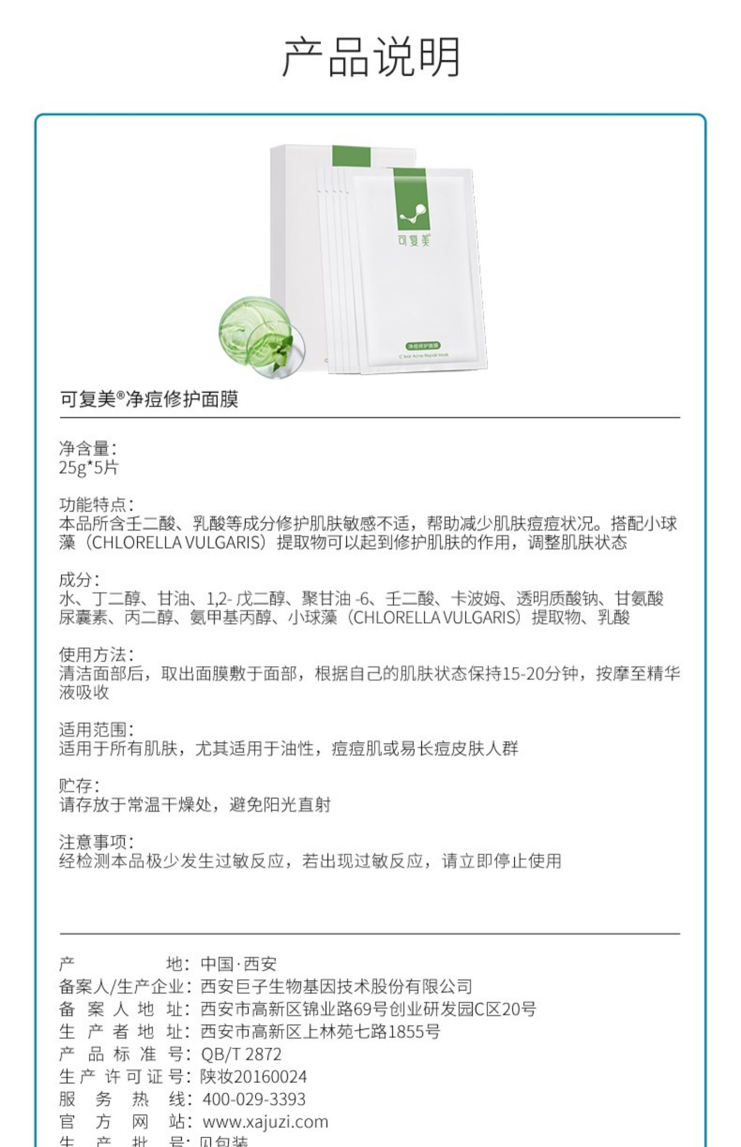 可复美净痘修护面膜 净痘小绿膜 5片/盒