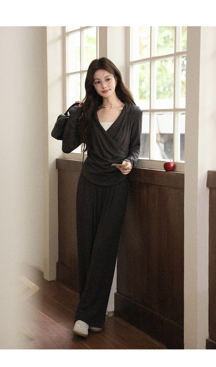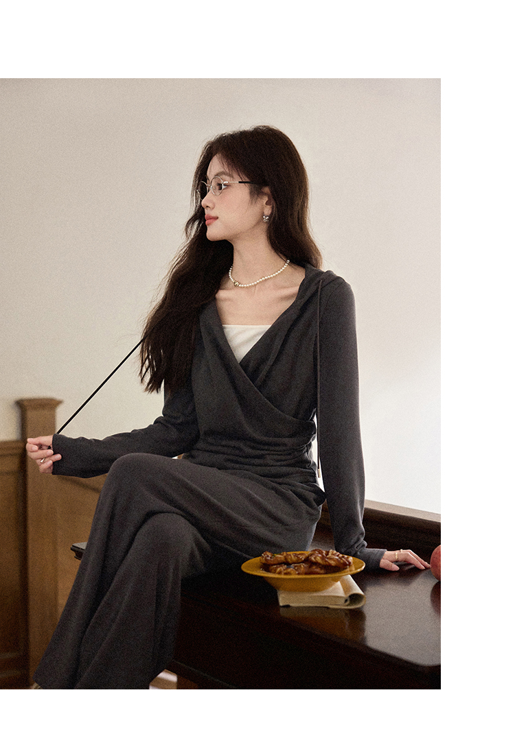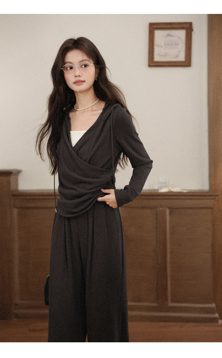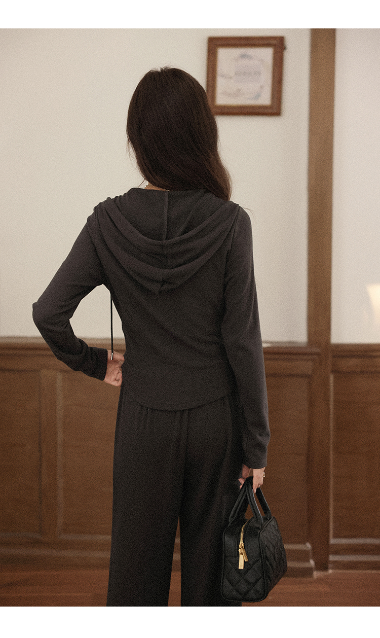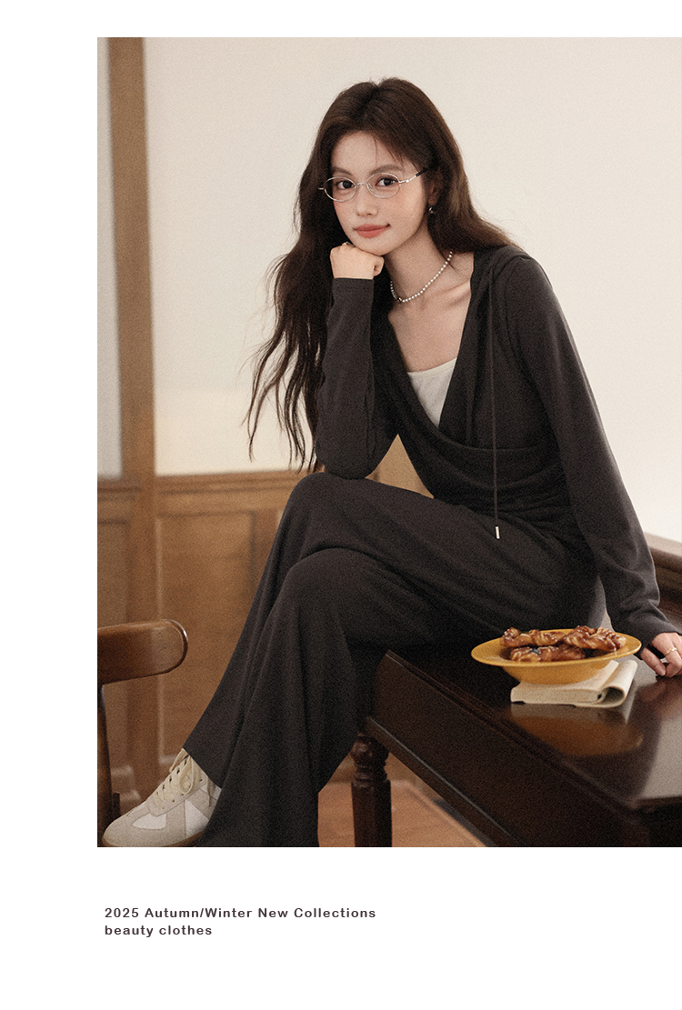 鹿向南「贝加尔岸」深灰色长袖连帽T恤休闲裤套装女秋新款两件套