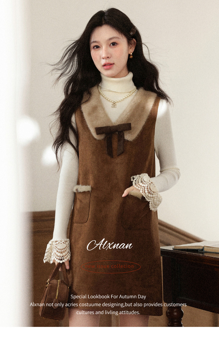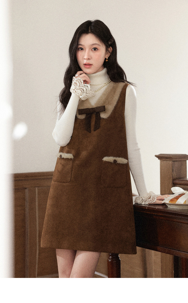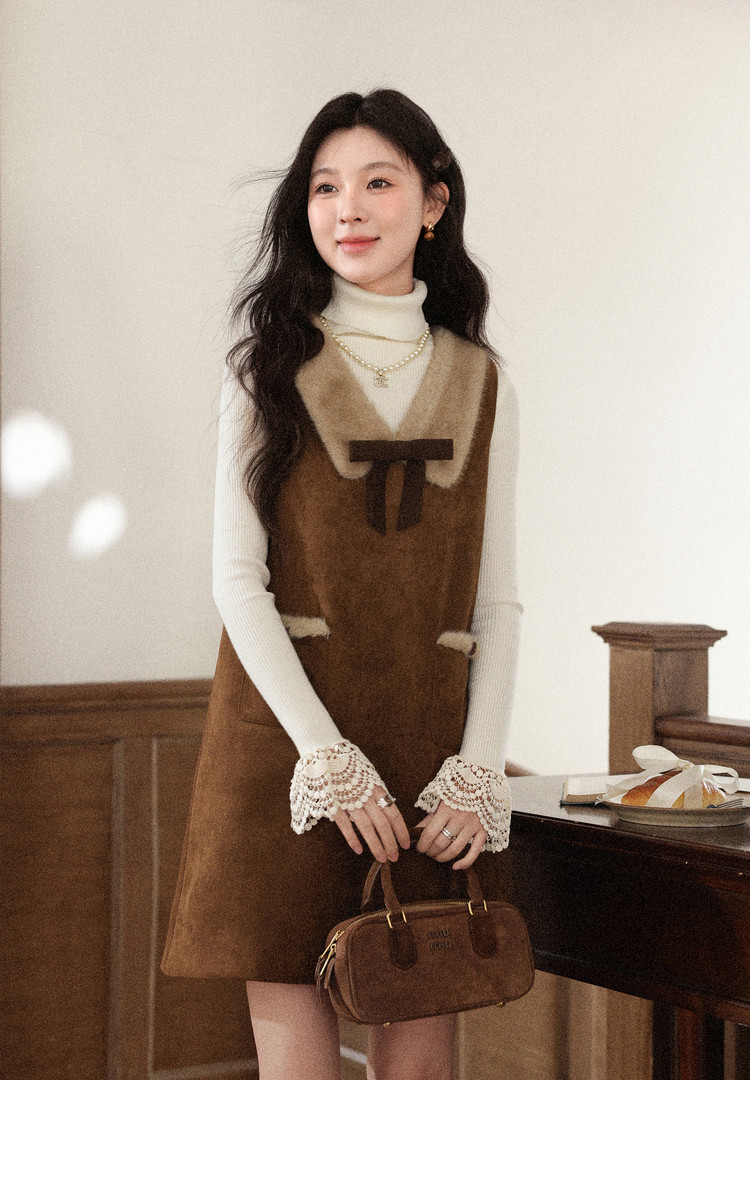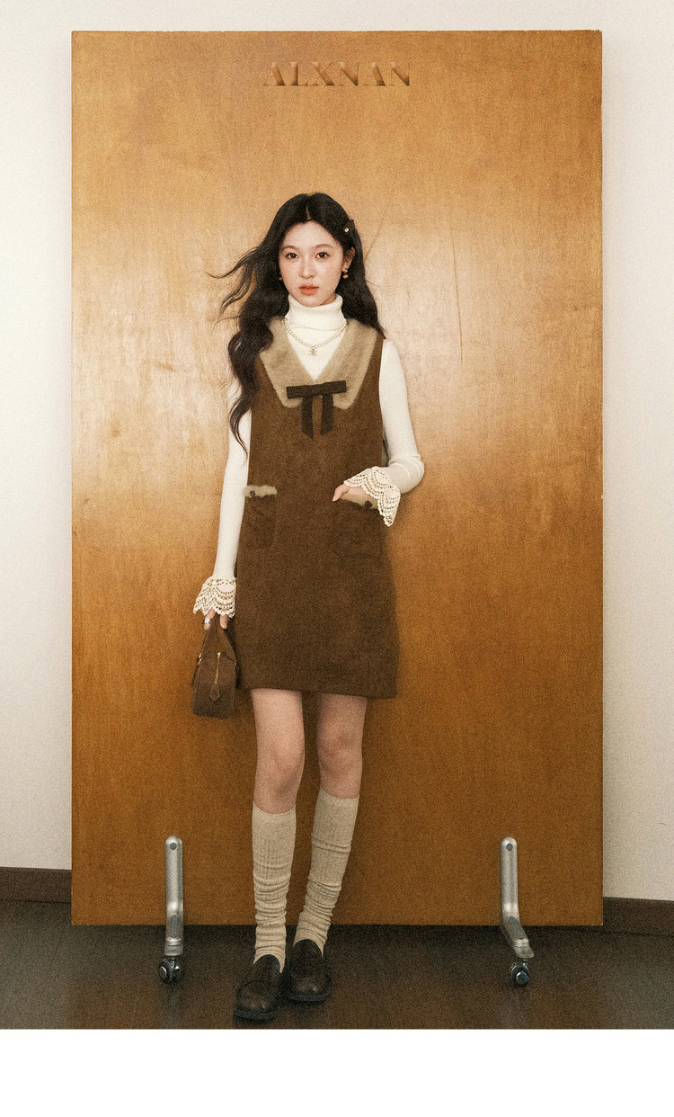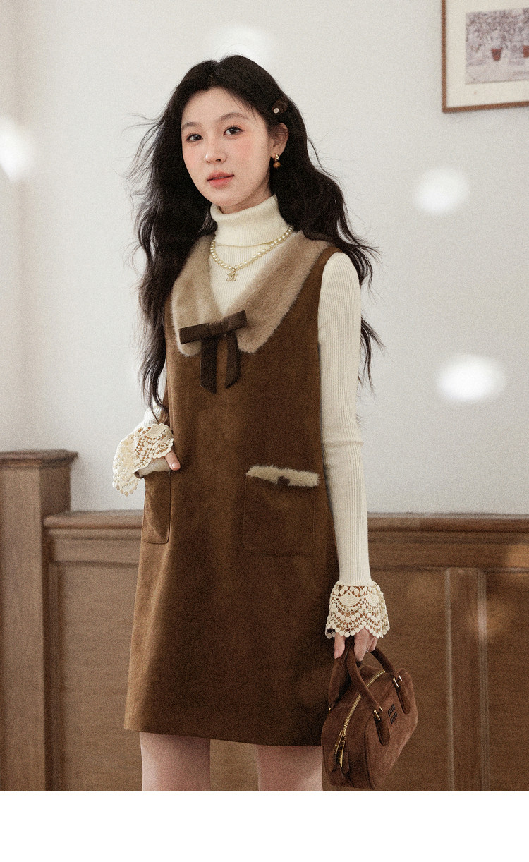 鹿向南「梧桐雨下」千金风气质咖色背心连衣裙女冬季新款叠穿裙子