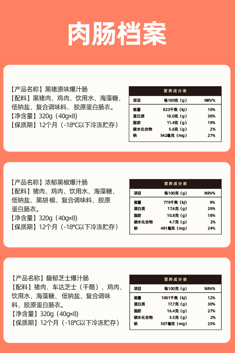 【追肉记】盐糖双减纯肉爆汁烤肠40g*8根/盒-含赠品