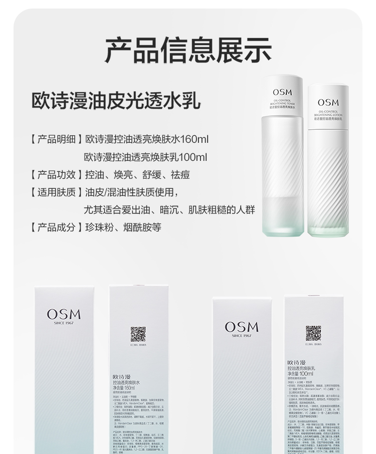 【油皮挚爱】欧诗漫控油水乳套组:2.0发光泥膜50g+控油焕肤水160ml+控油焕肤乳100ml+控油透亮焕肤乳20ml(软管版)+控油透亮焕肤水20ml+澎澎水光保湿面膜5片*1盒