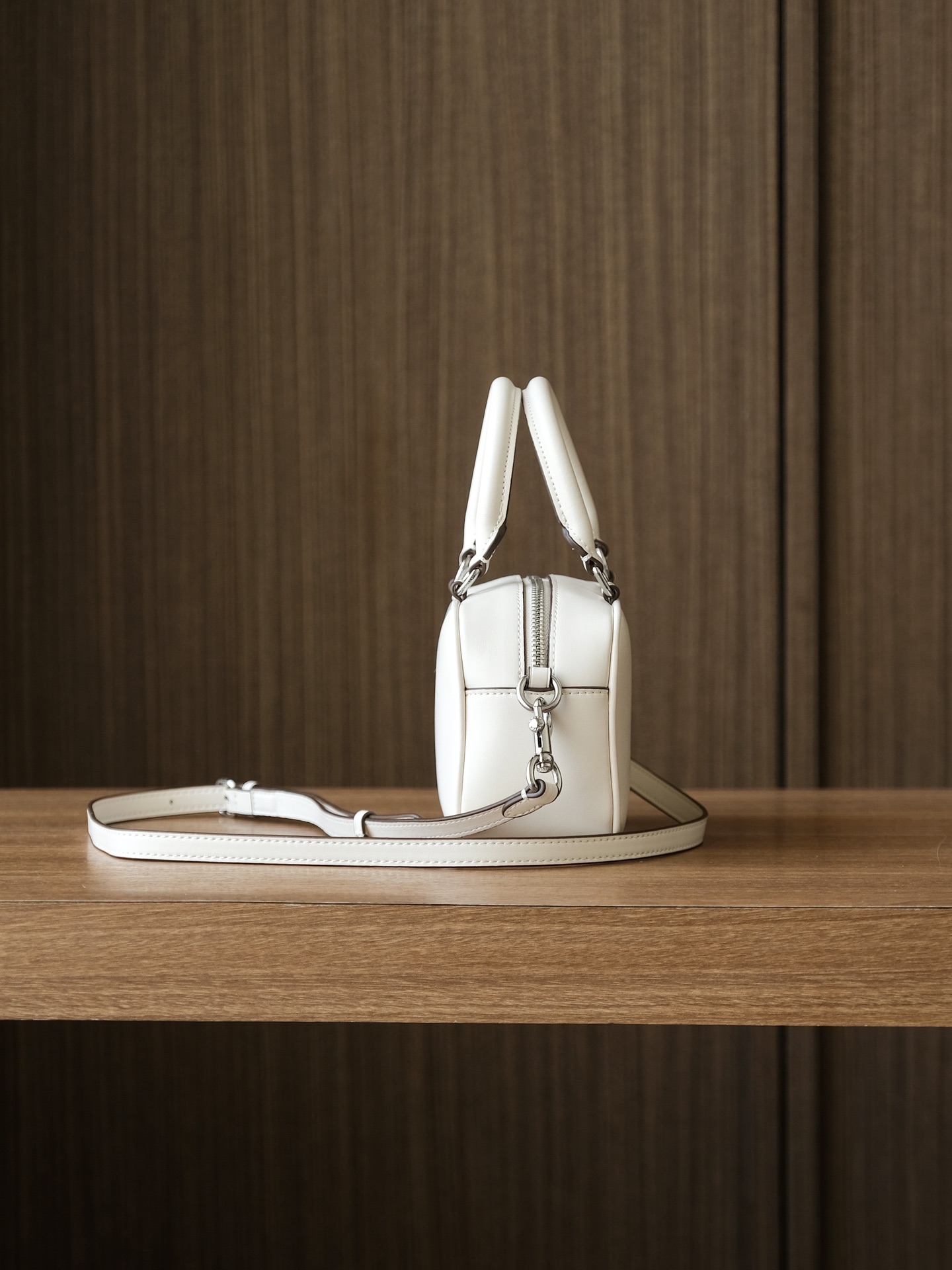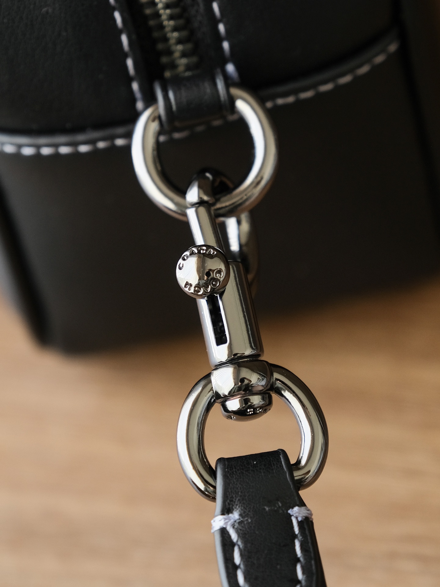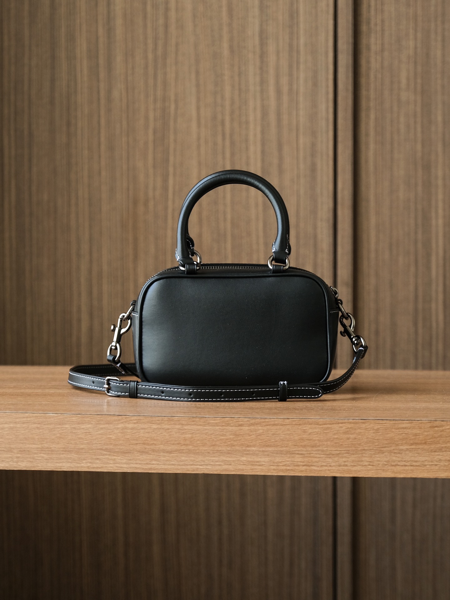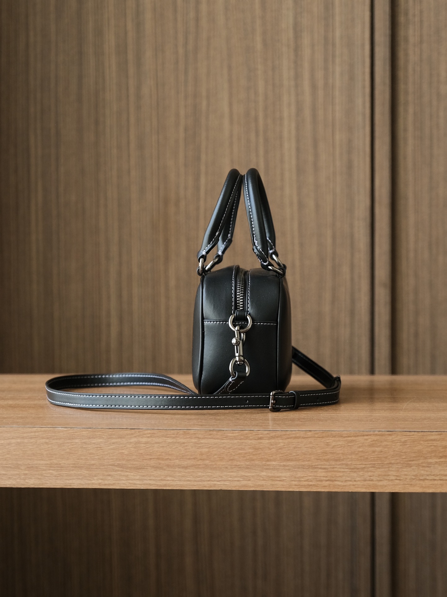 它配有可调节的斜挎肩带和皮革包裹的顶部手柄