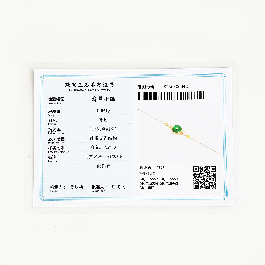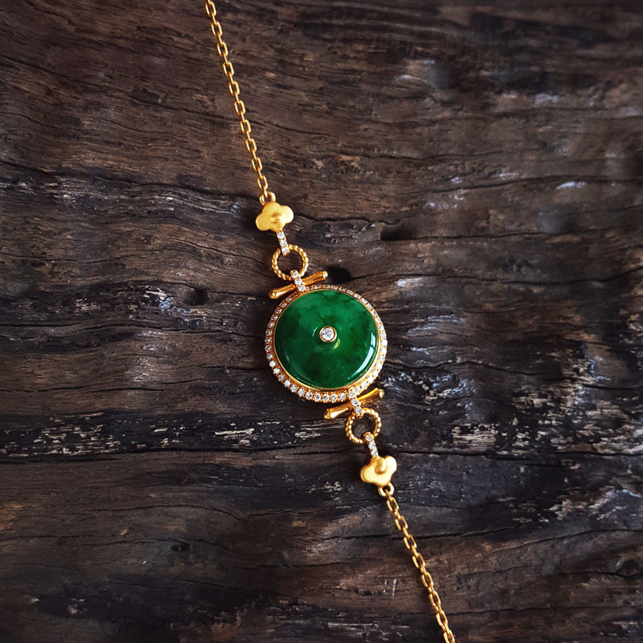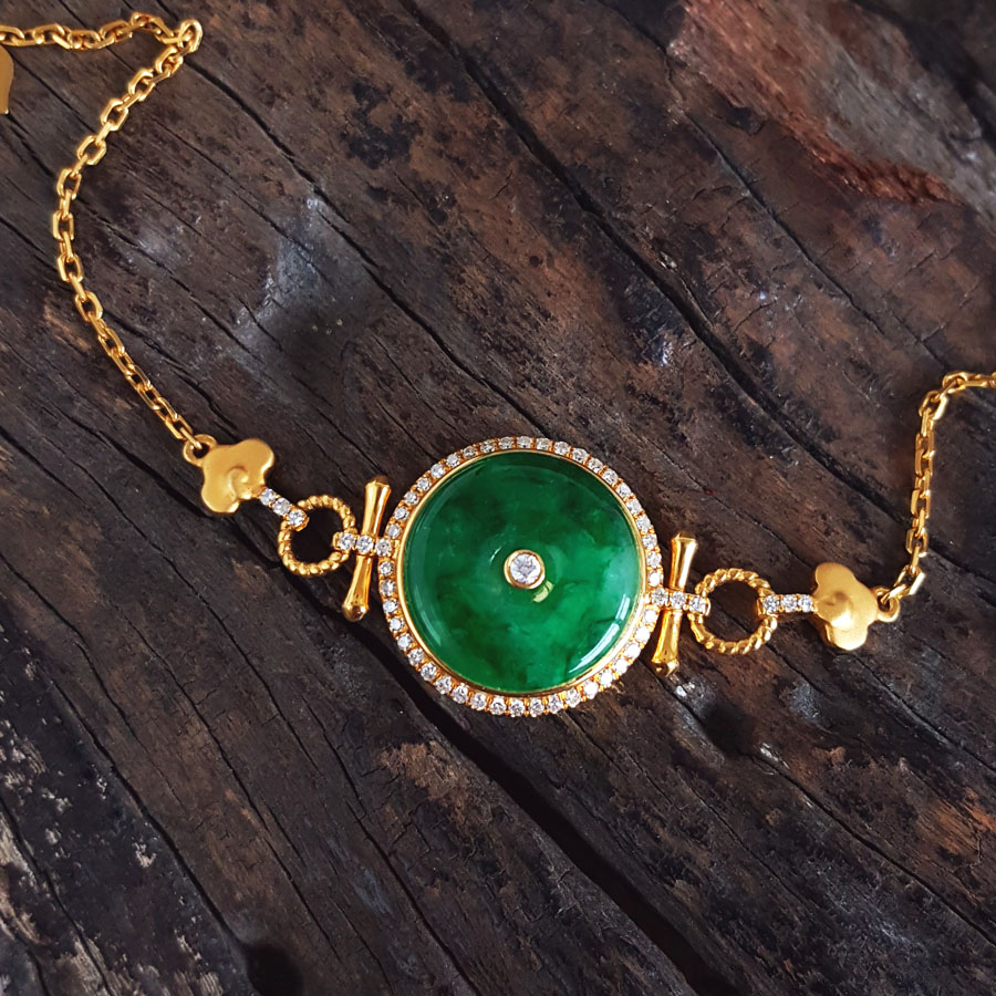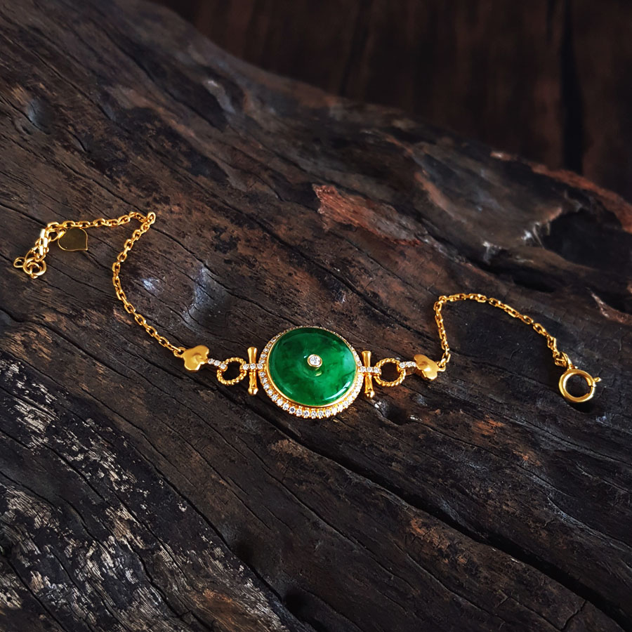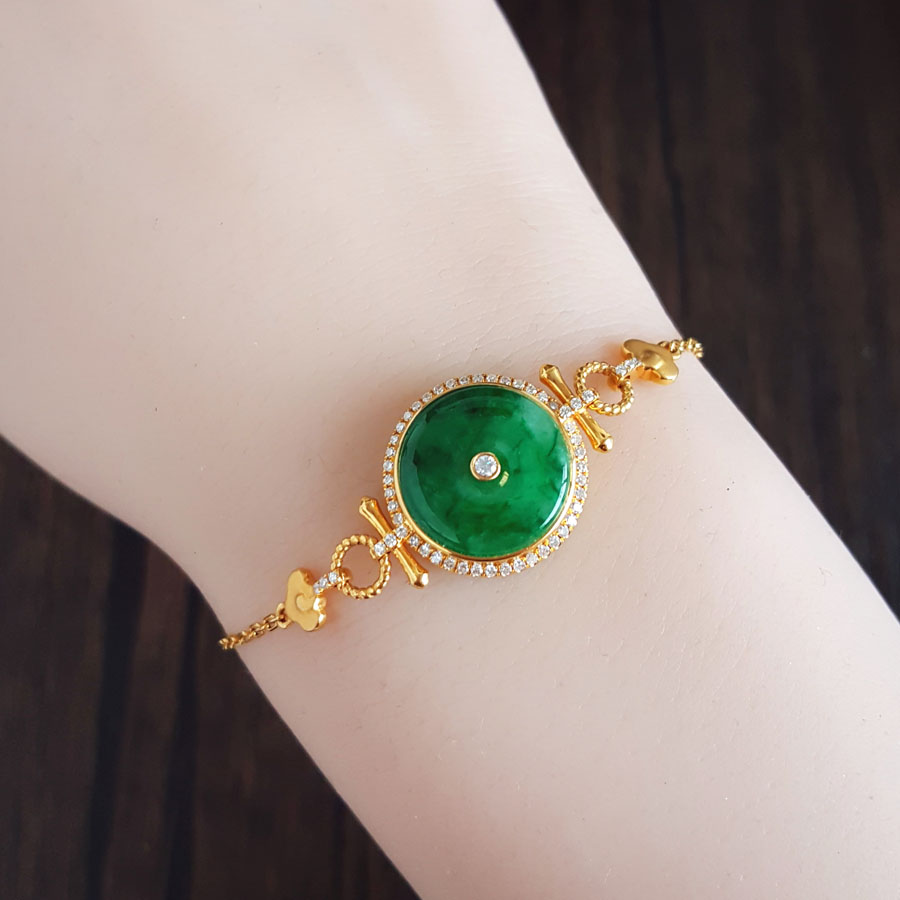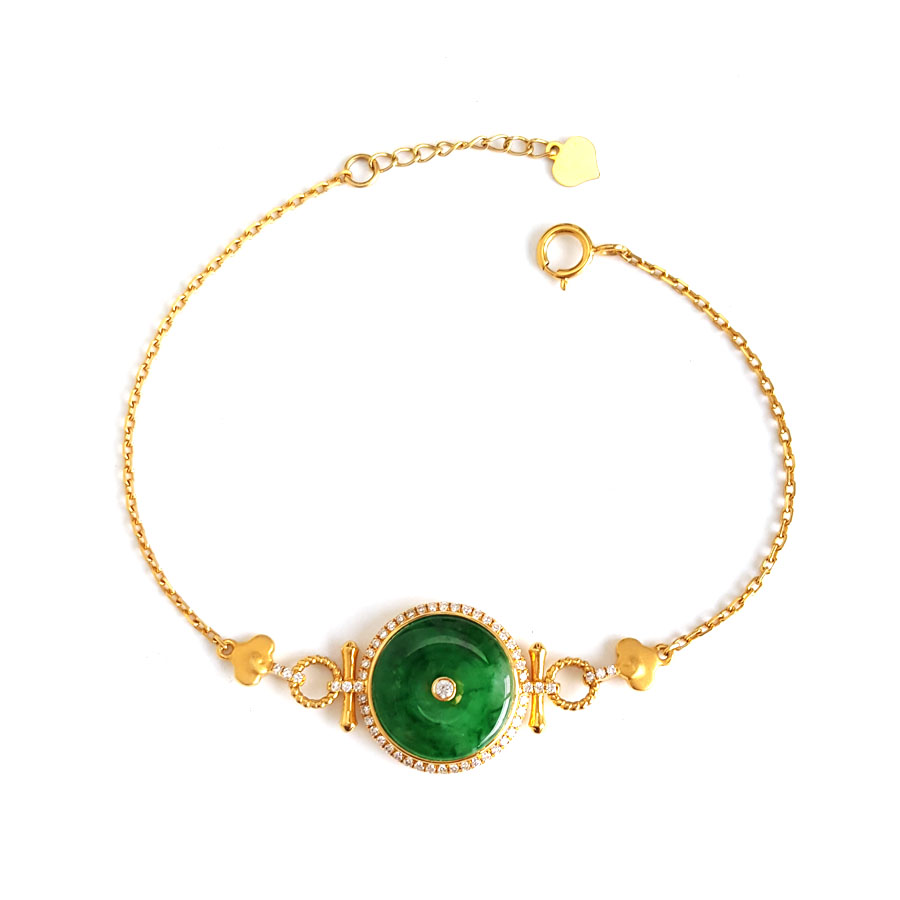 名称 | AU750黄金镶钻镶天然细腻满绿糯冰种平安扣翡翠手链 |