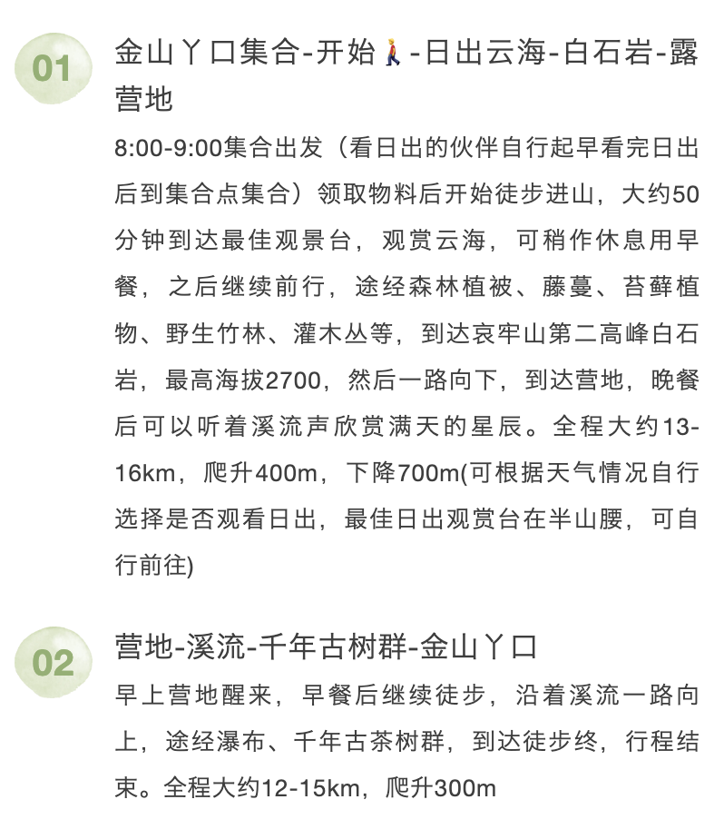 1.全程1晚住宿,住宿需要两人一间,单人住宿需要补差价(单日花山徒步不含此项)