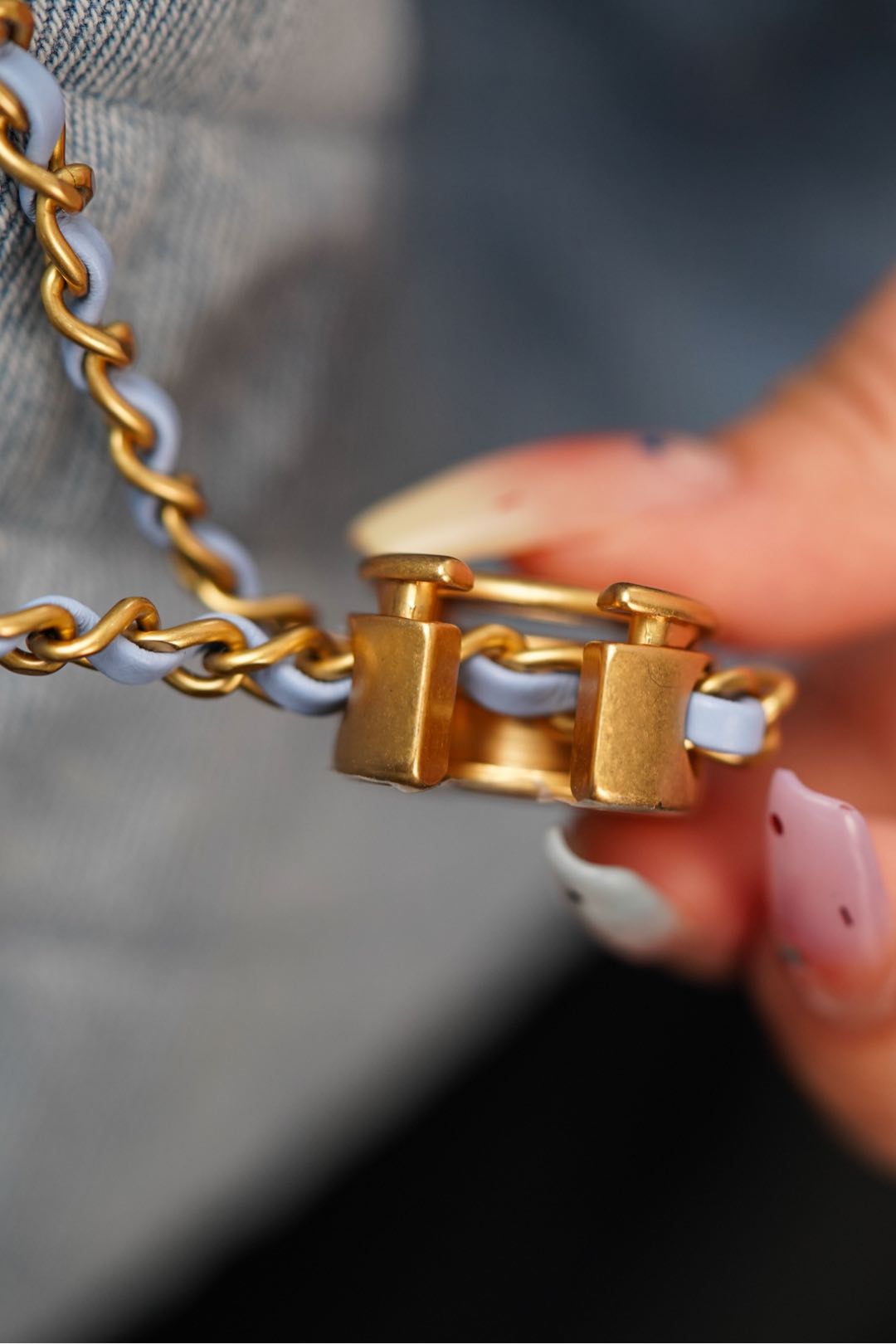 双C扣细节鉴赏‼️🉑抽拉式皮穿金属链; 复古砂金配件; 需要先按住双C扣再抽拉、超丝滑的体验感!