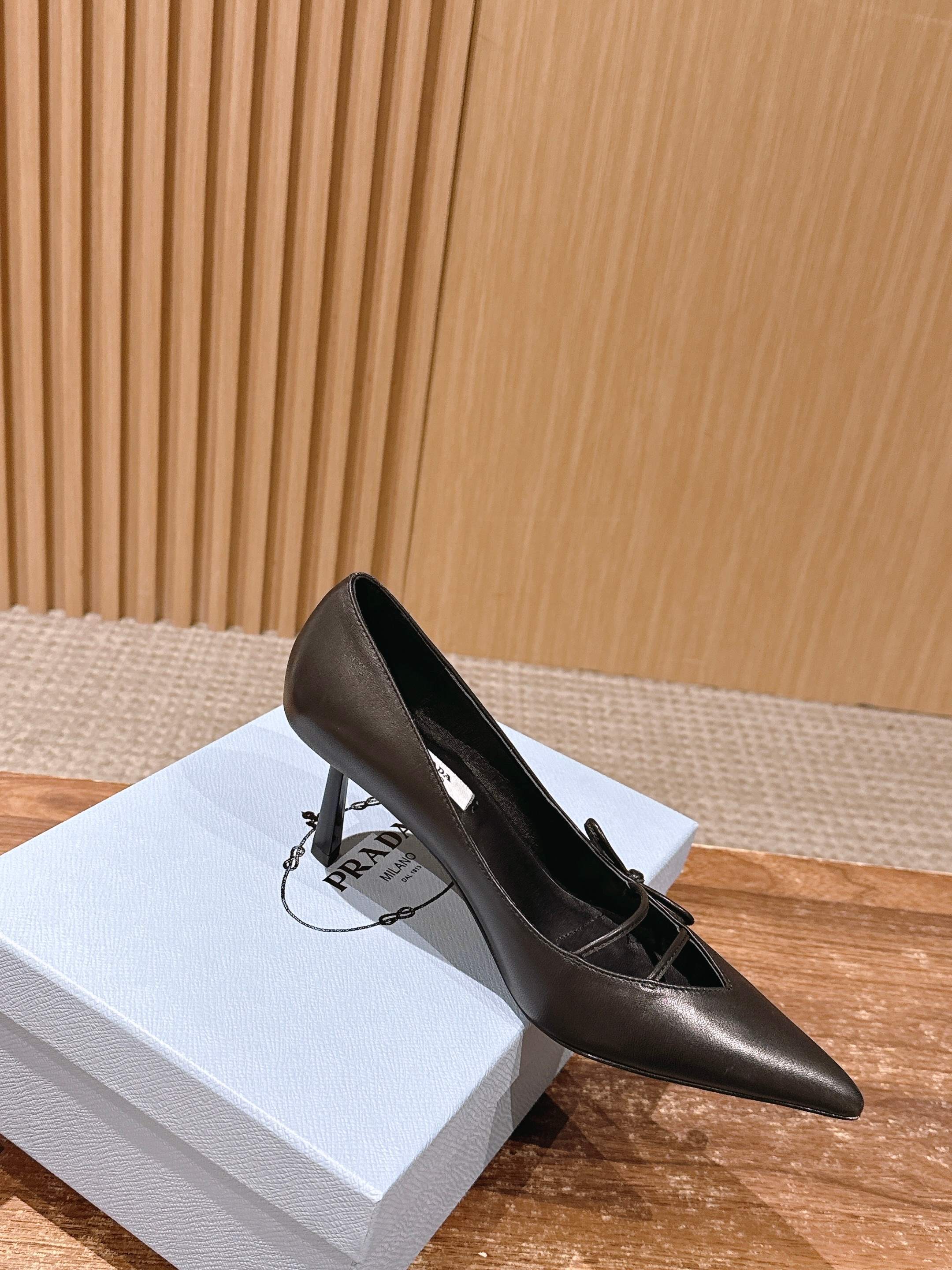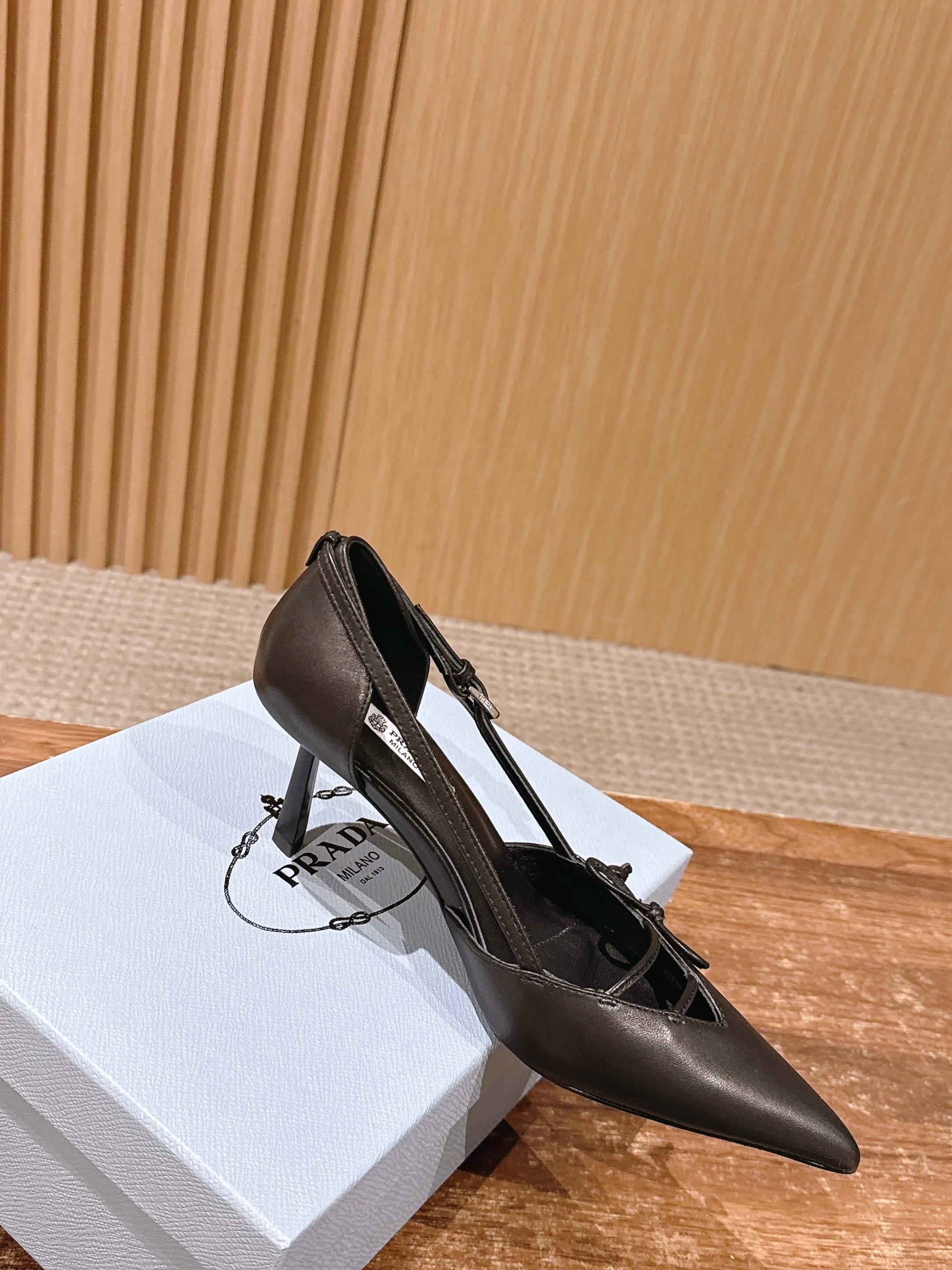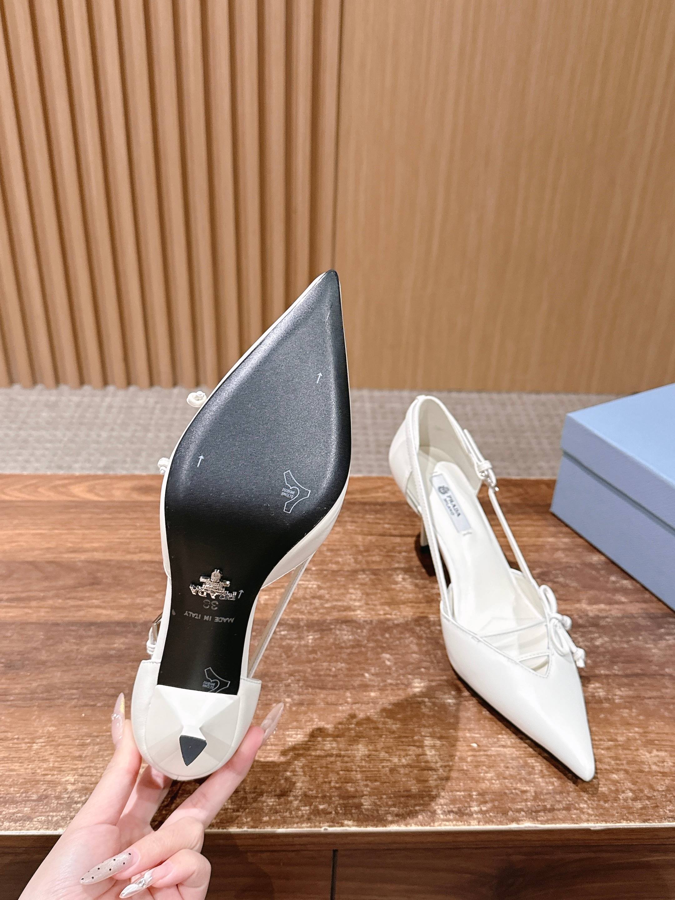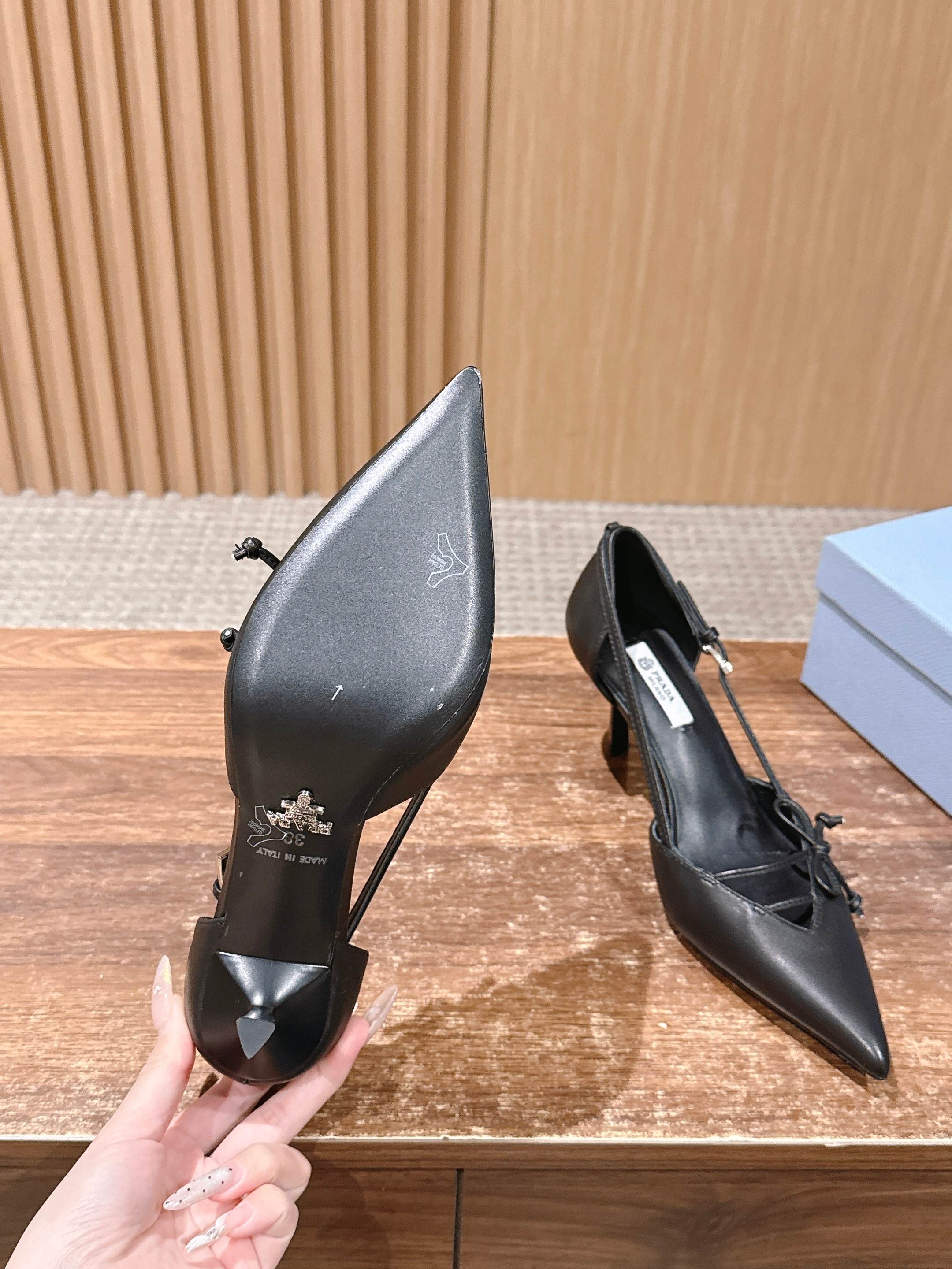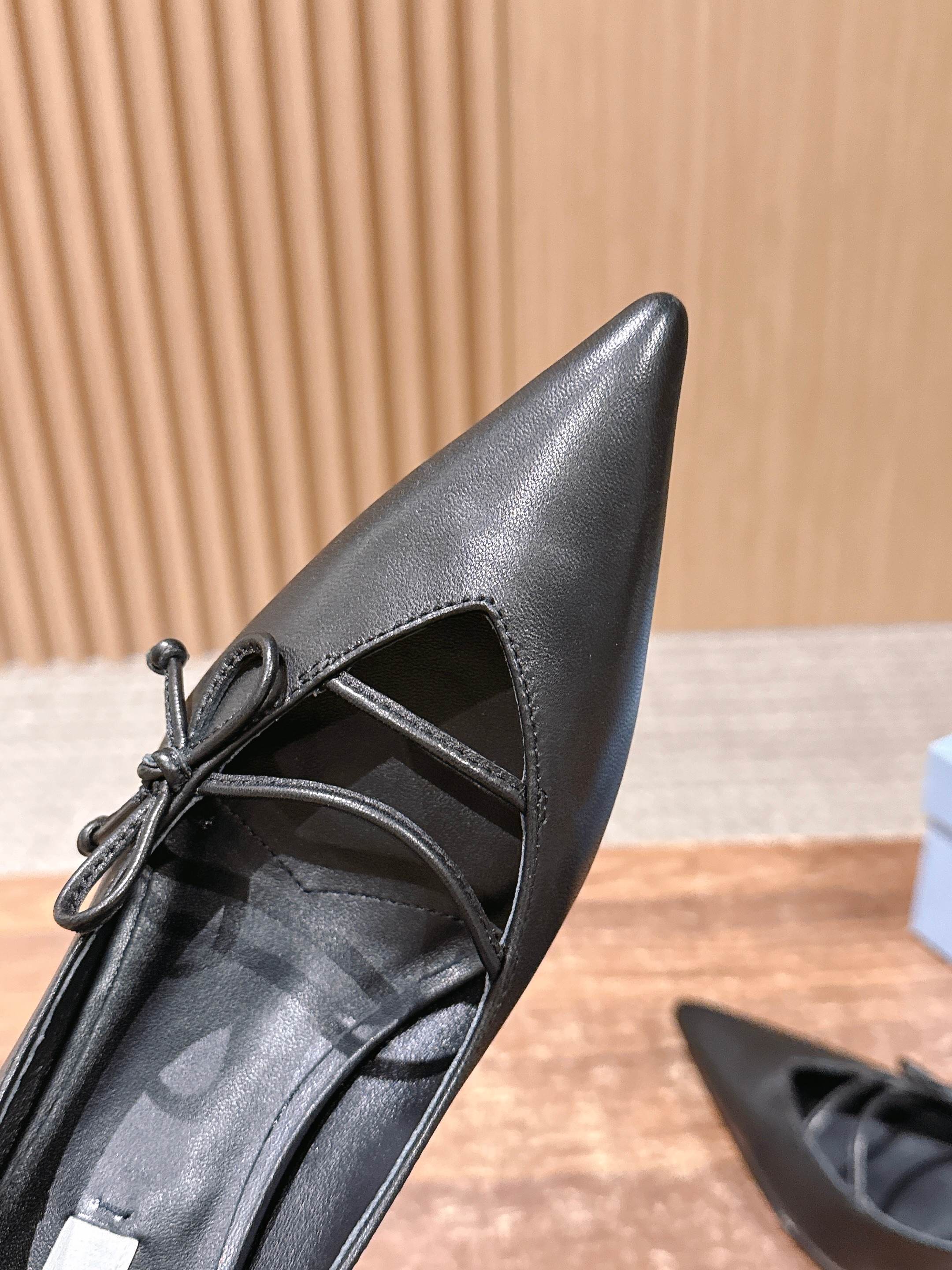 PRADA 普拉达2026早春新品尖头 中空凉鞋高跟鞋 尖头设计不止是拉长腿型的巧思 后饰带与蝴蝶结细节在刚柔之间找到平衡。 它挣脱了“舒适即奢侈”的惯性认知 却以羊皮内里的亲肤质感 实现心灵与身体的双重自由。 从通勤西装到晚宴礼裙 它无缝适配多元场景 让女性在干练与柔美中自主切换。 每一次落脚都是金属徽标与地面的轻语 是先锋设计与日常功能的共鸣 更是当代女性不被定义的底气与锋芒。 面料定制小羊皮材质 真皮大底 跟高7.5cm,5.5cmSize:35-39(40/41定制)