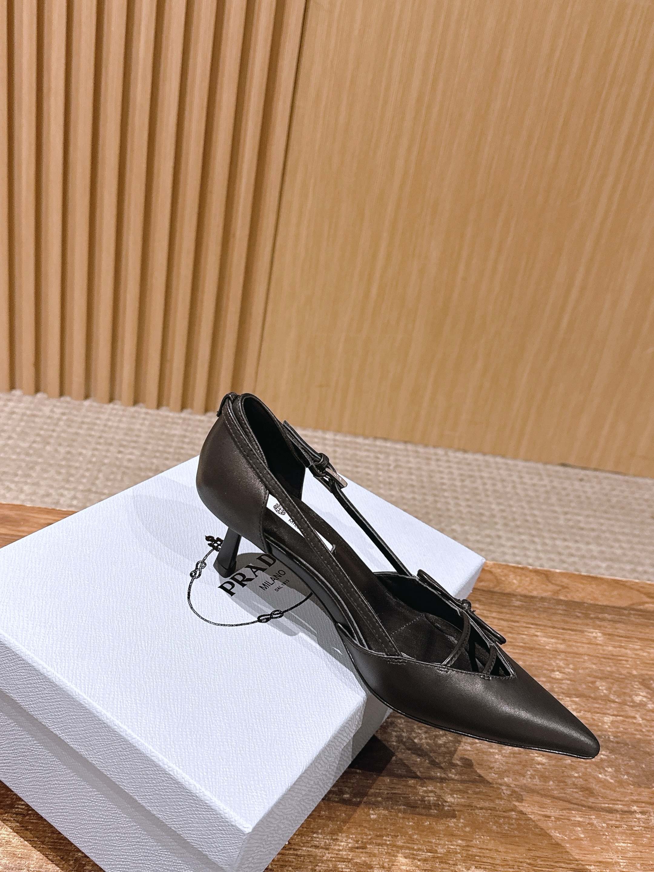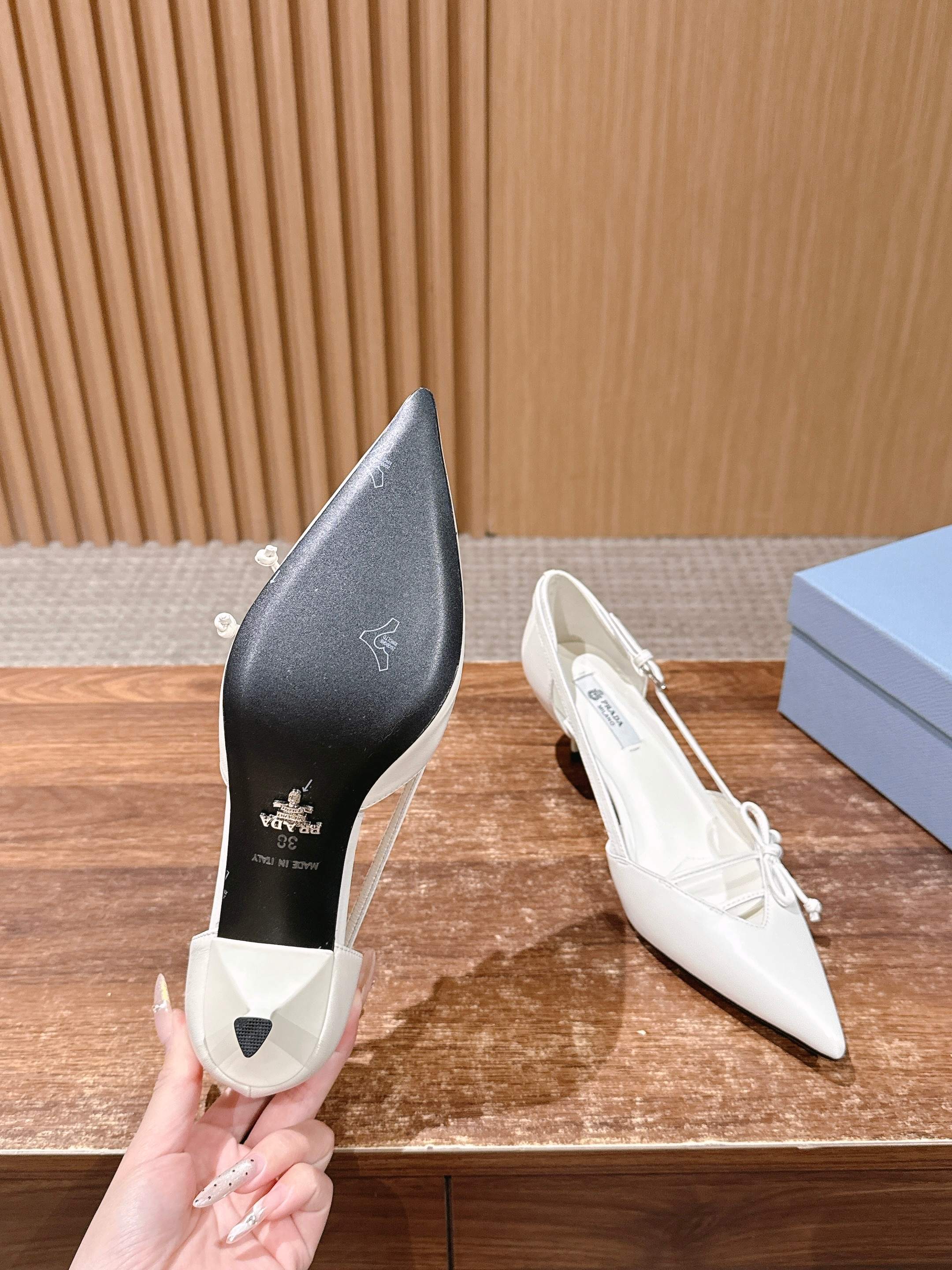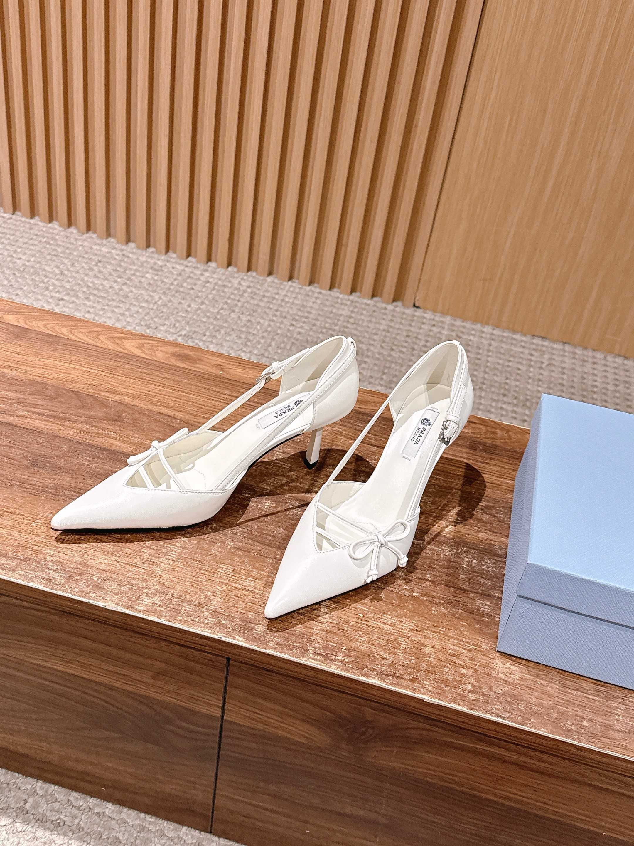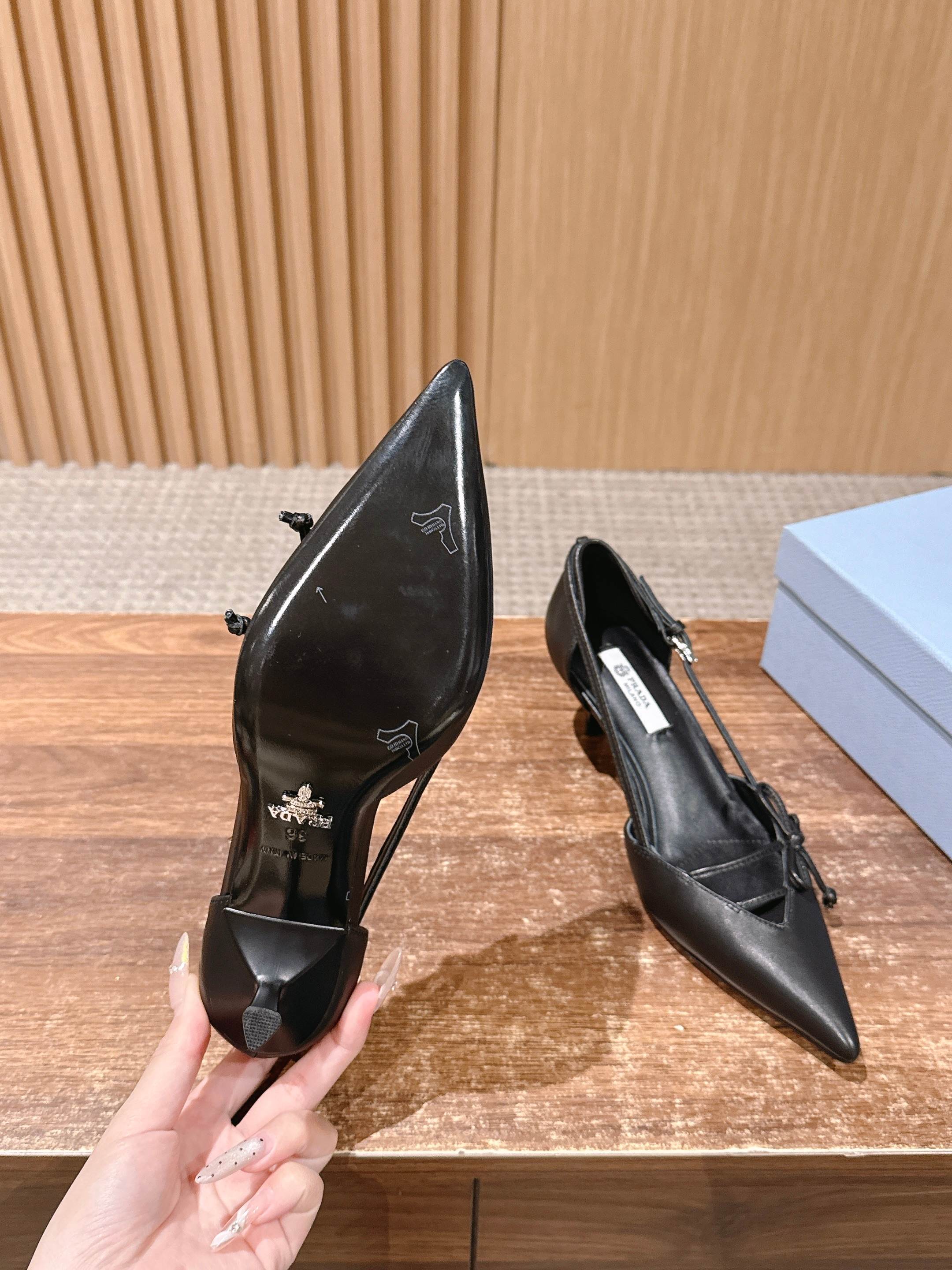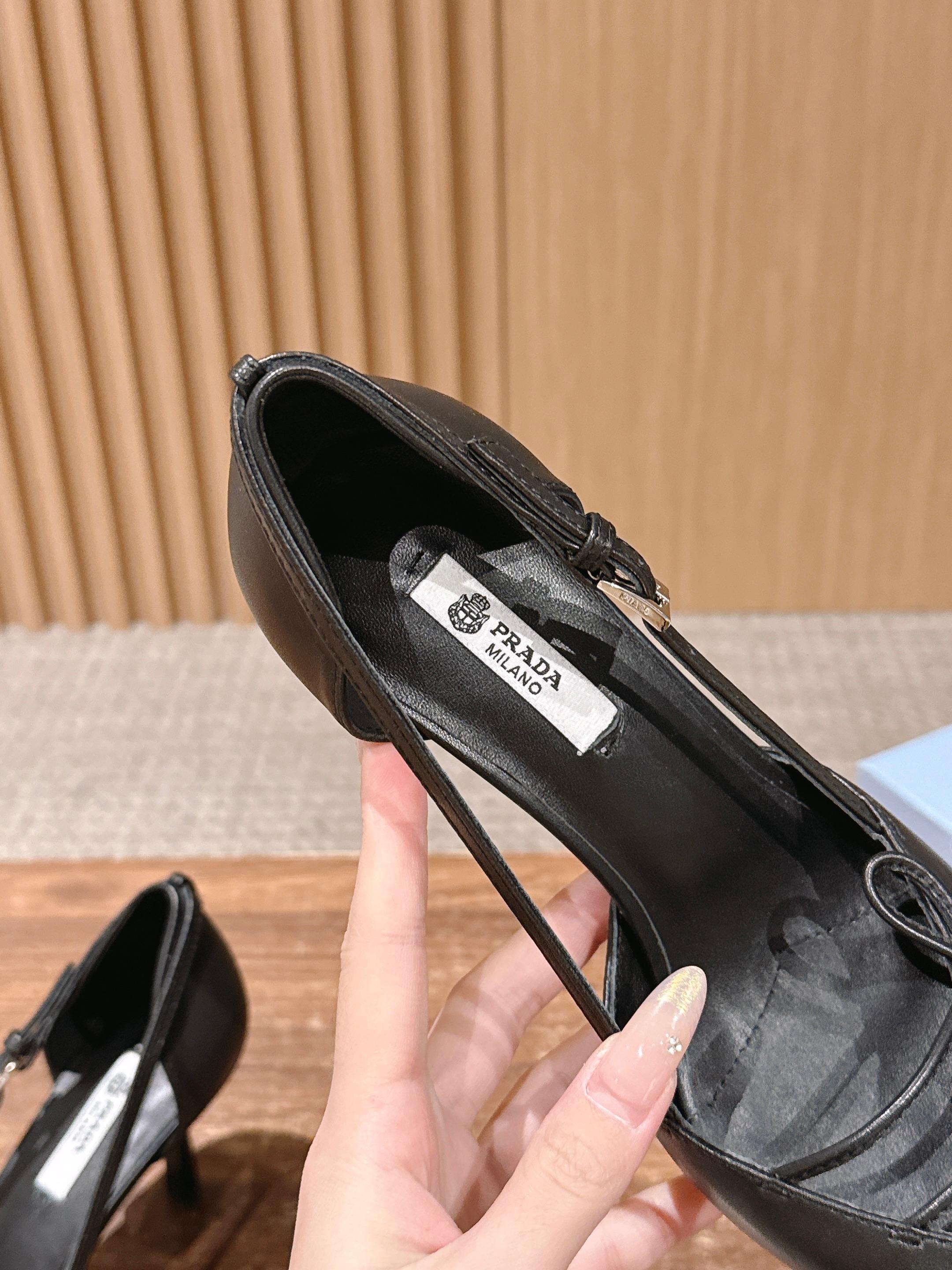 PRADA 普拉达2026早春新品尖头 中空凉鞋高跟鞋 尖头设计不止是拉长腿型的巧思 后饰带与蝴蝶结细节在刚柔之间找到平衡。 它挣脱了“舒适即奢侈”的惯性认知 却以羊皮内里的亲肤质感 实现心灵与身体的双重自由。 从通勤西装到晚宴礼裙 它无缝适配多元场景 让女性在干练与柔美中自主切换。 每一次落脚都是金属徽标与地面的轻语 是先锋设计与日常功能的共鸣 更是当代女性不被定义的底气与锋芒。 面料定制小羊皮材质 真皮大底 跟高7.5cm,5.5cmSize:35-39(40/41定制)