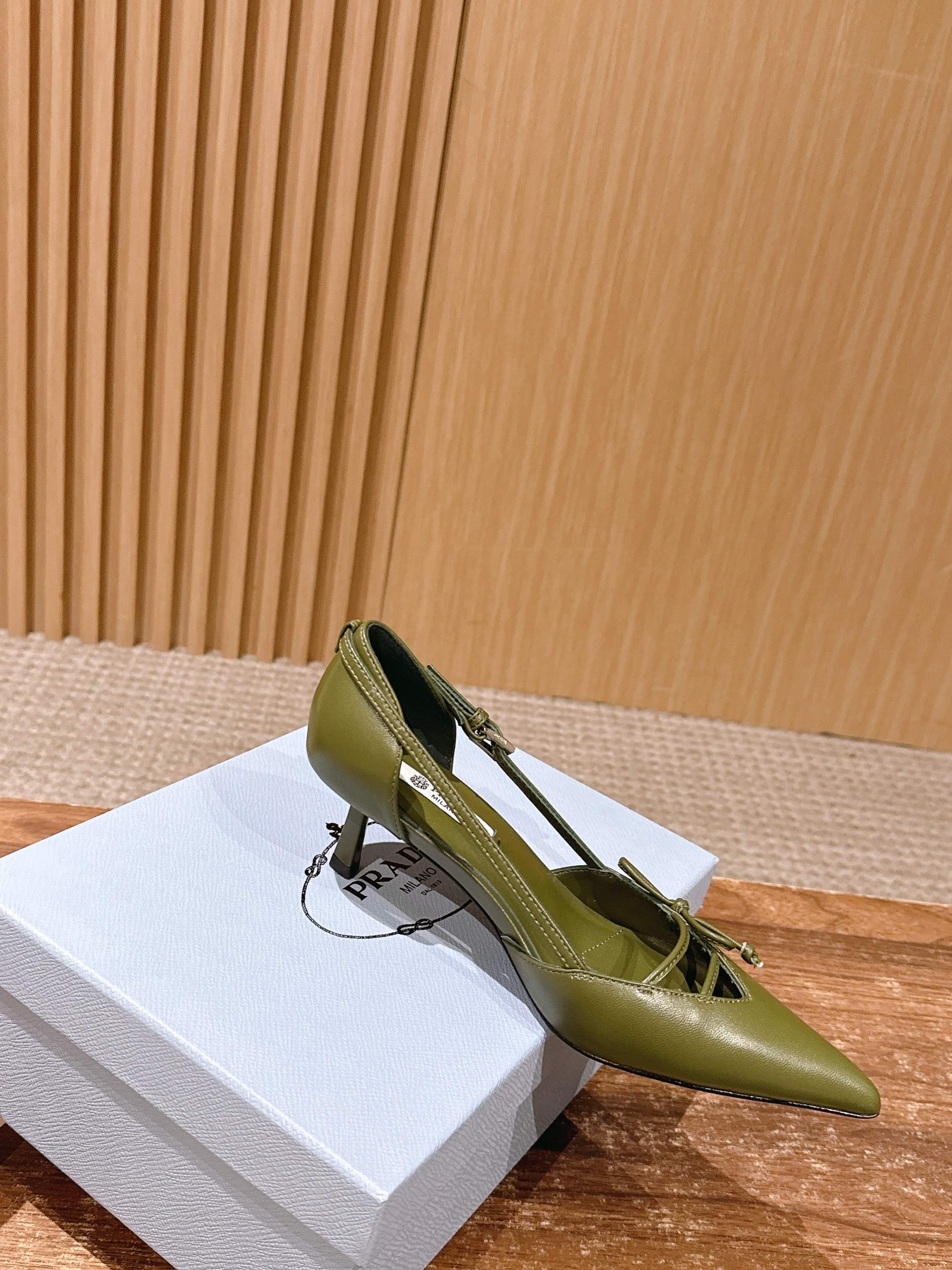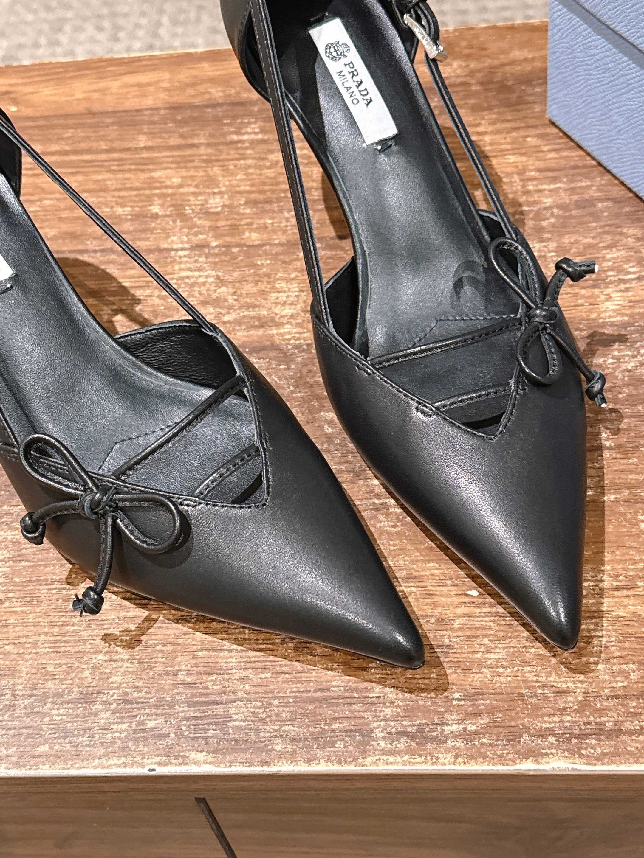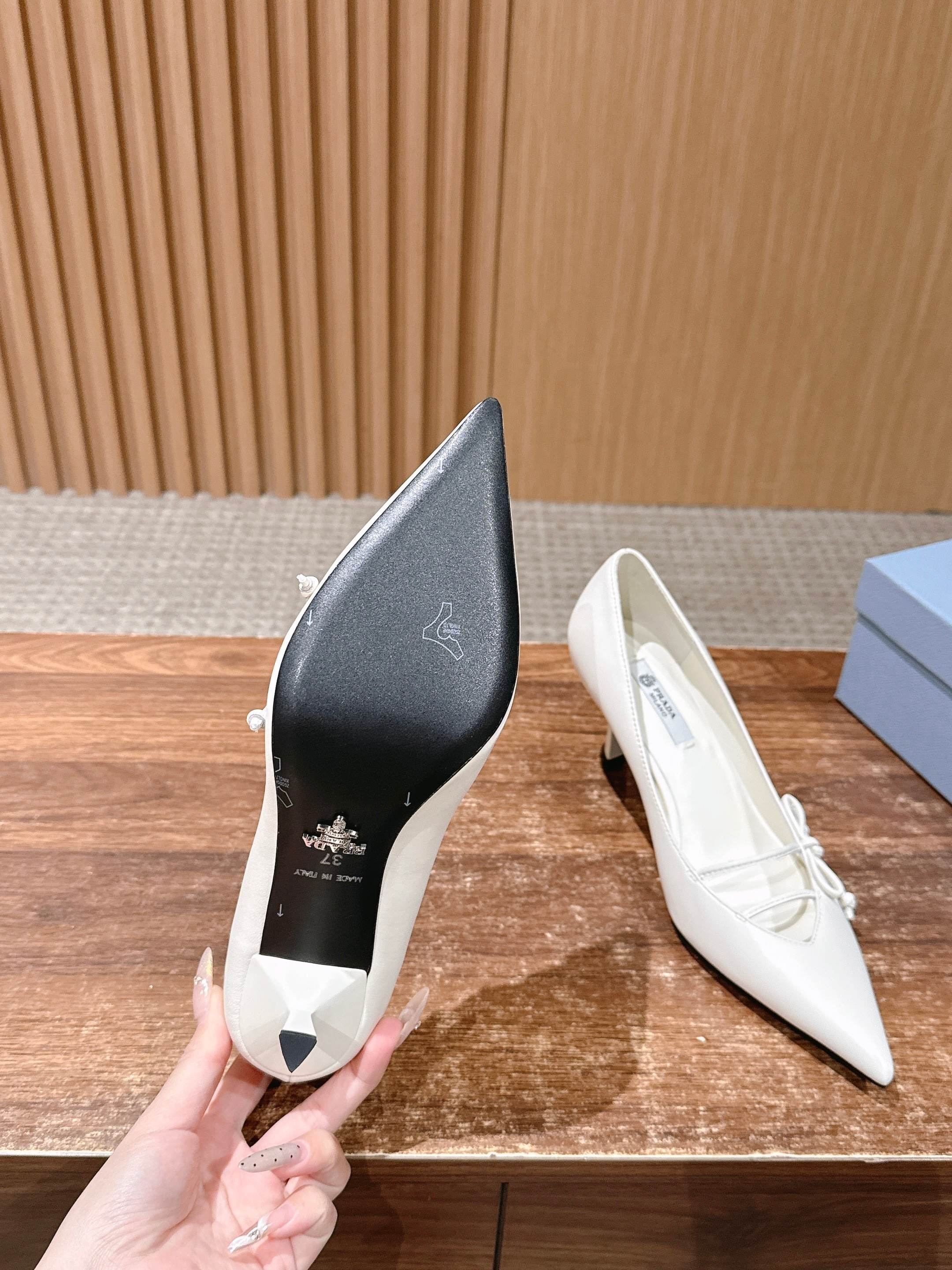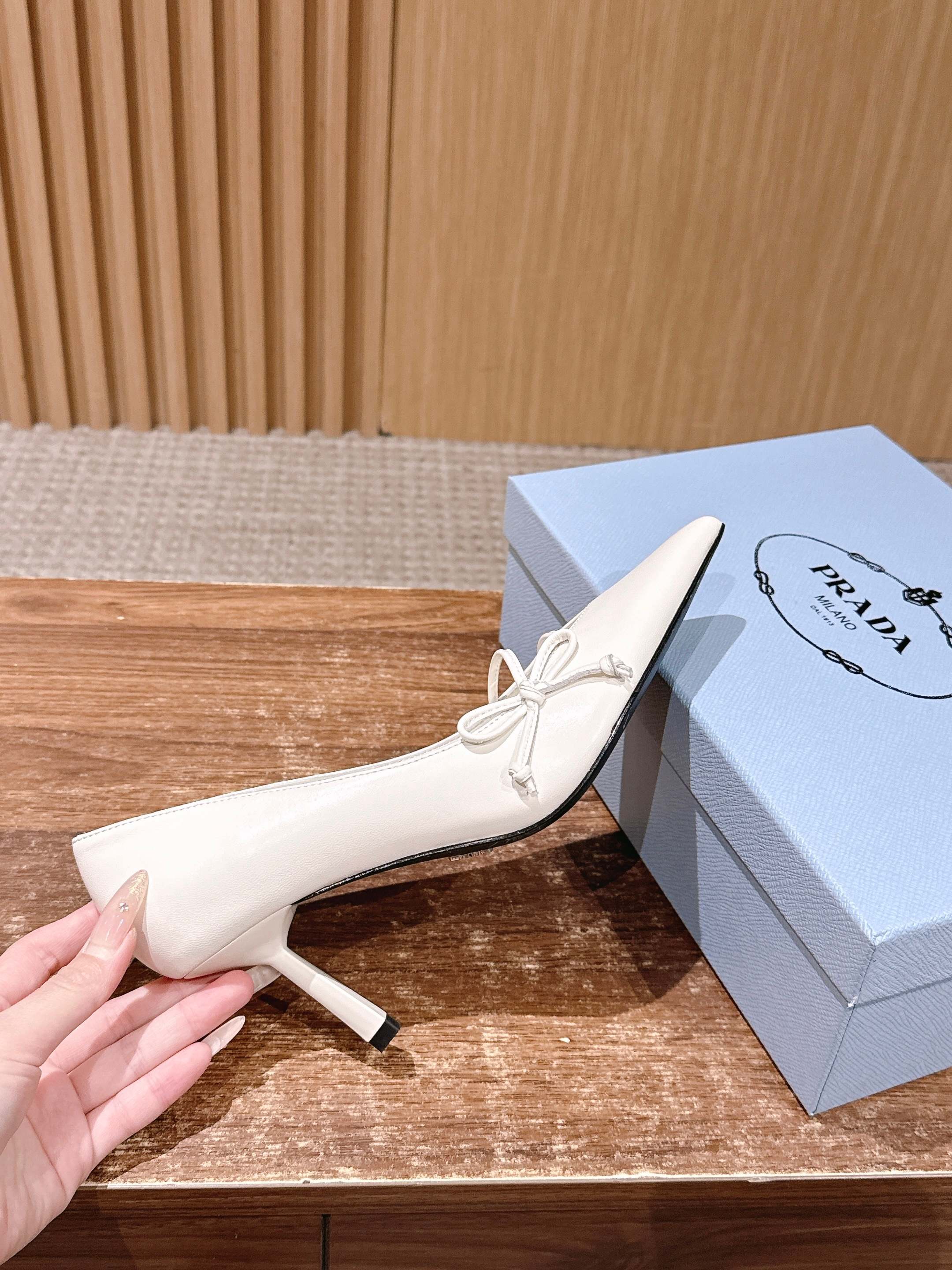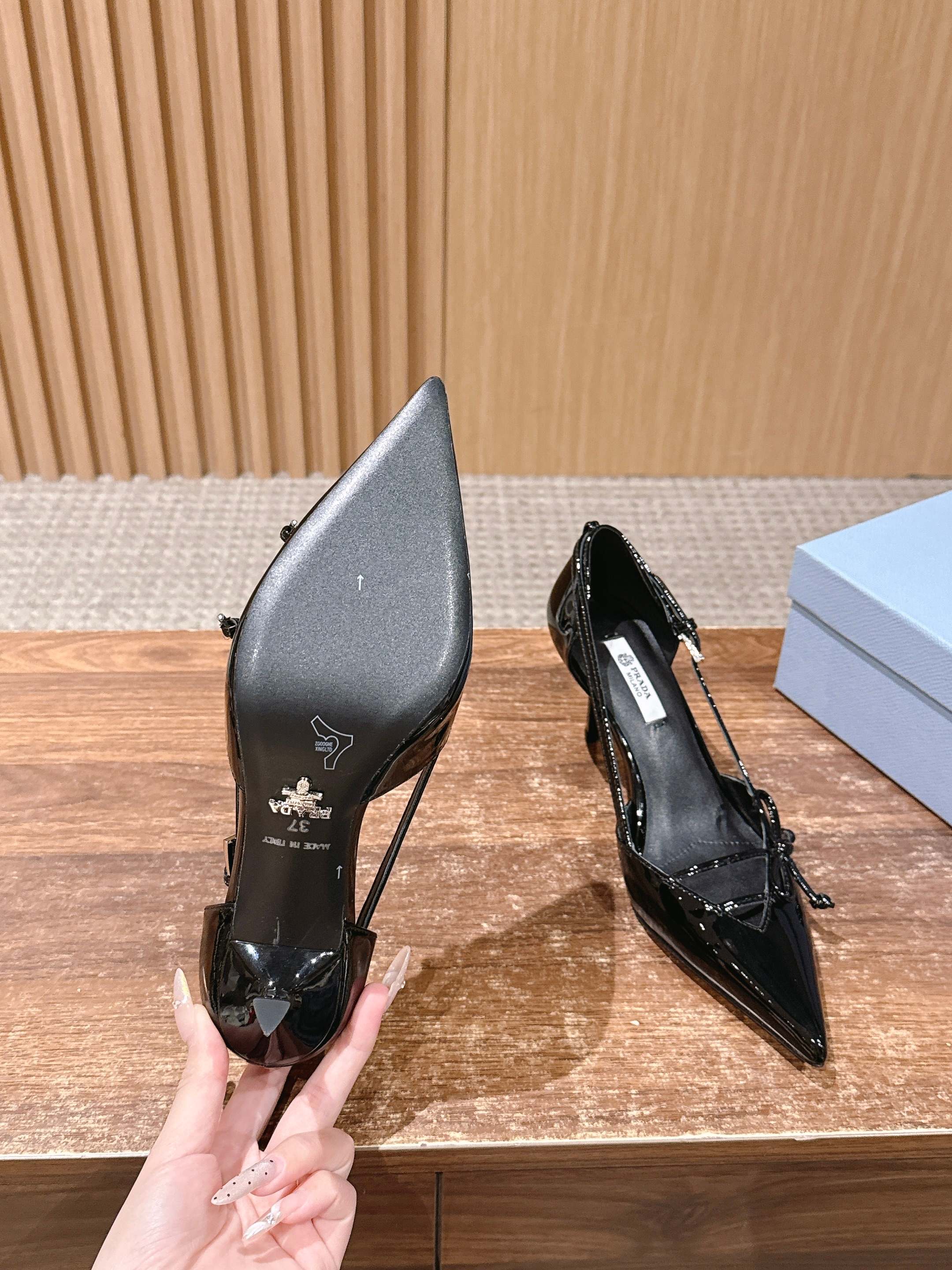PRADA 普拉达2026早春新品尖头 中空凉鞋高跟鞋 尖头设计不止是拉长腿型的巧思 后饰带与蝴蝶结细节在刚柔之间找到平衡。 它挣脱了“舒适即奢侈”的惯性认知 却以羊皮内里的亲肤质感 实现心灵与身体的双重自由。 从通勤西装到晚宴礼裙 它无缝适配多元场景 让女性在干练与柔美中自主切换。 每一次落脚都是金属徽标与地面的轻语 是先锋设计与日常功能的共鸣 更是当代女性不被定义的底气与锋芒。 面料定制小羊皮材质 真皮大底 跟高7.5cm,5.5cmSize:35-39(40/41定制)