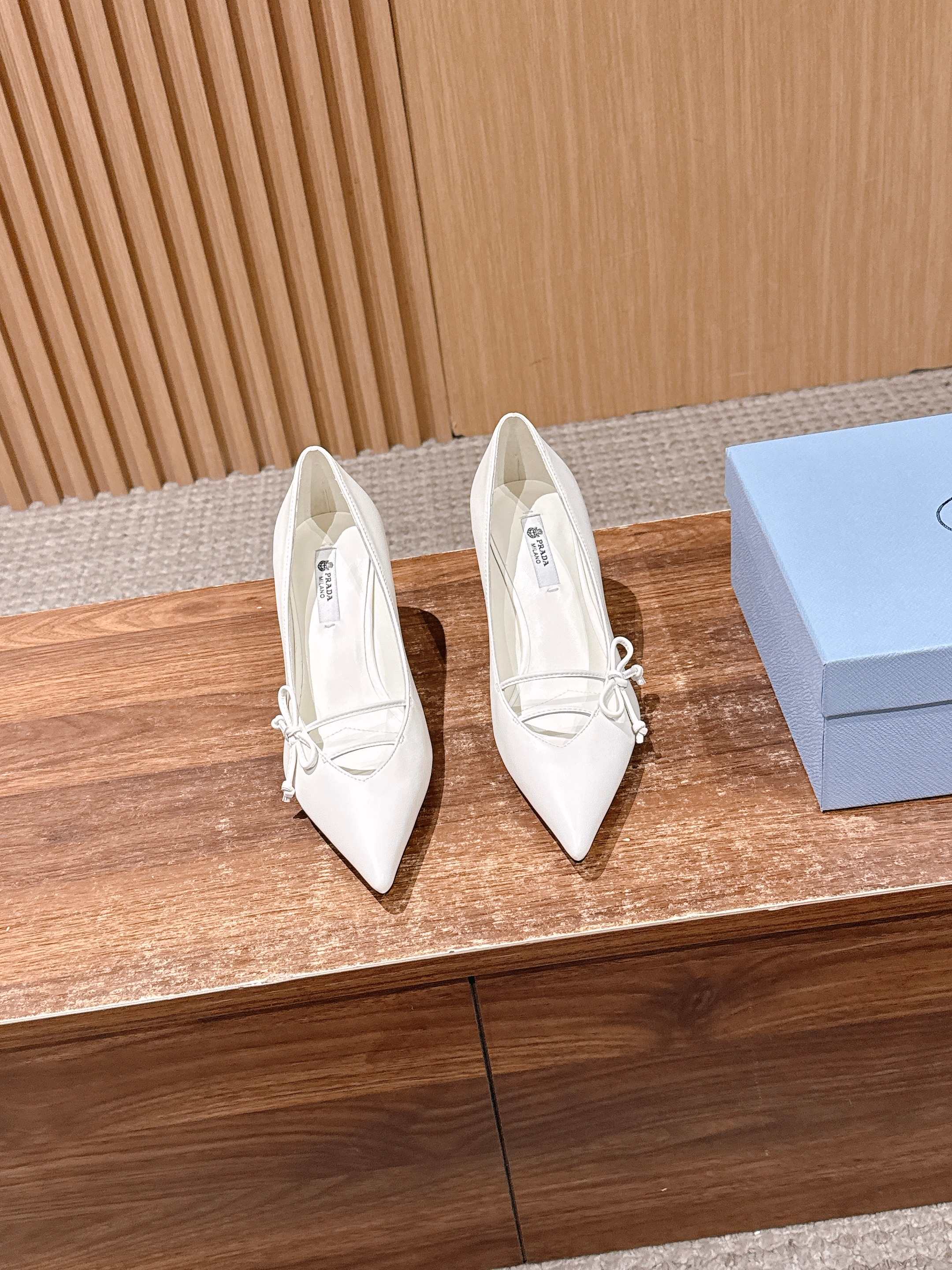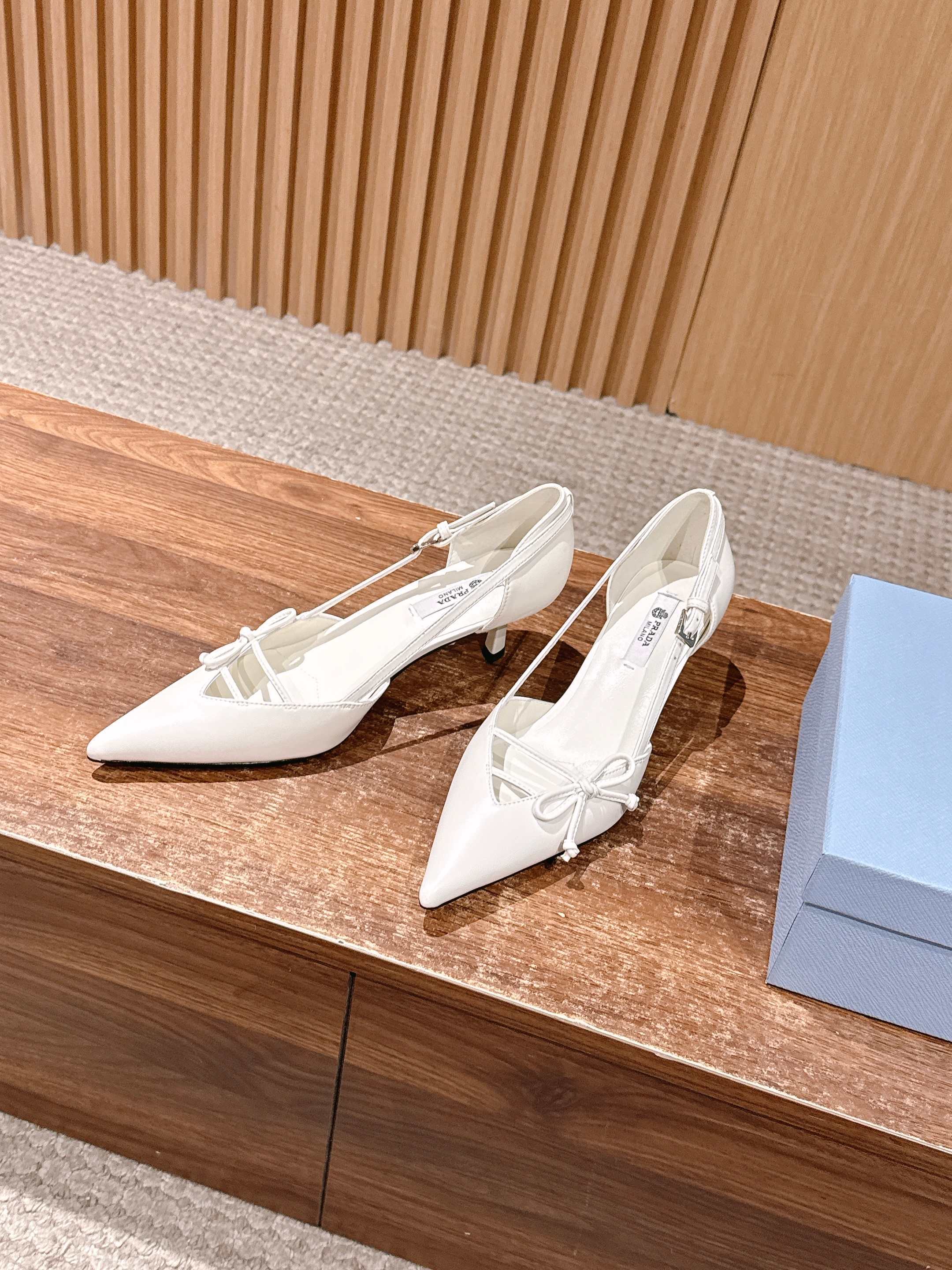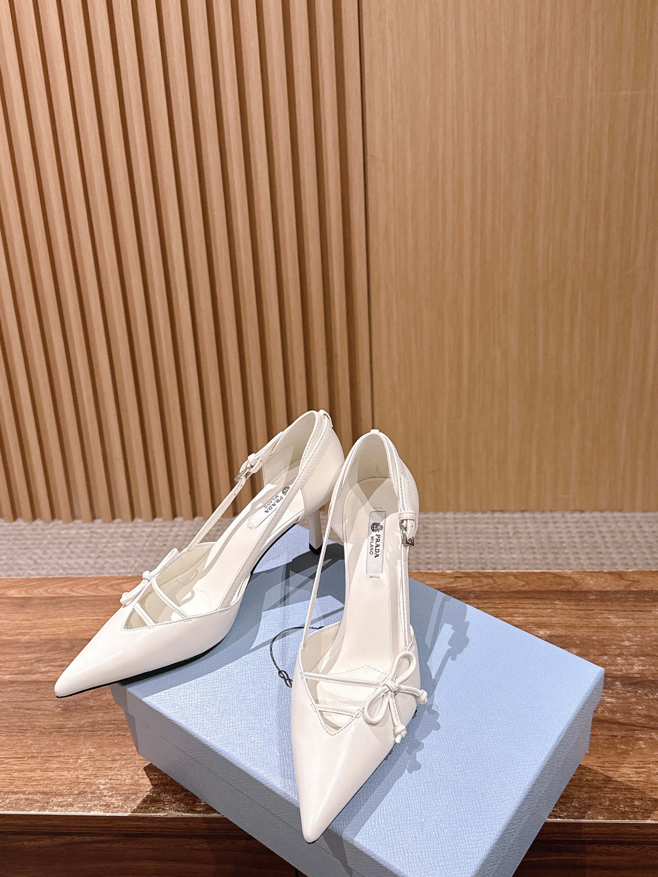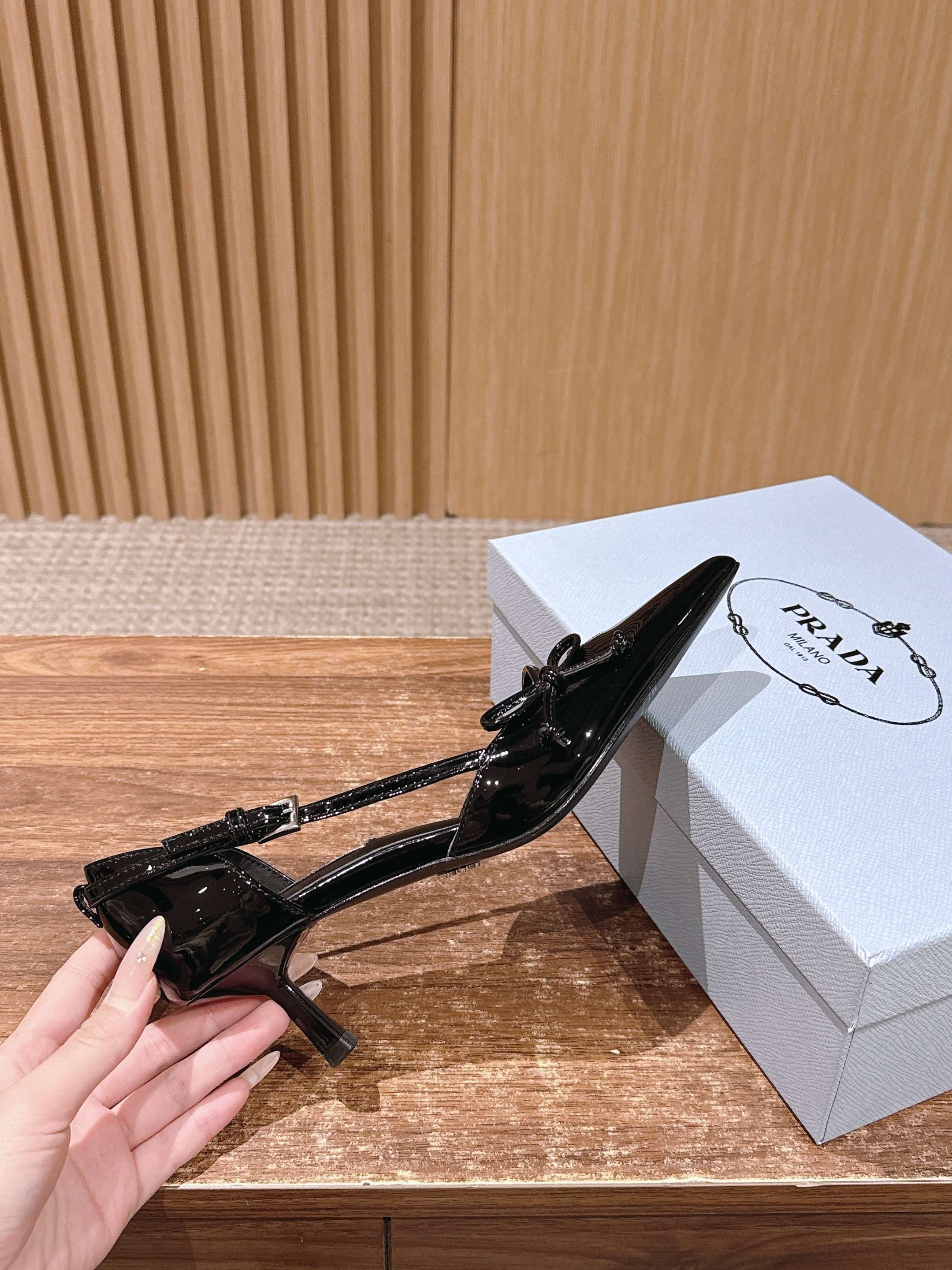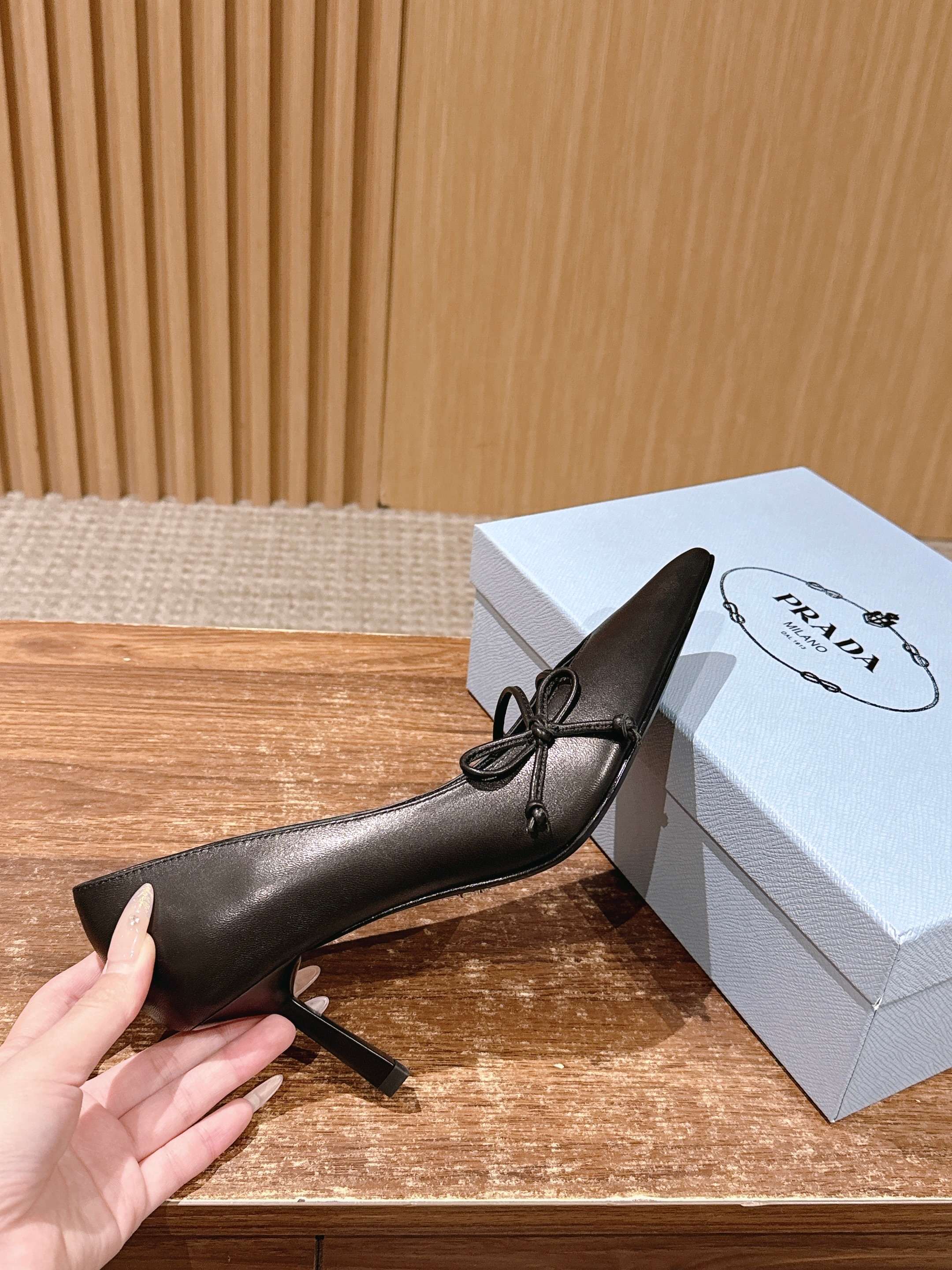 PRADA 普拉达2026早春新品尖头 中空凉鞋高跟鞋 尖头设计不止是拉长腿型的巧思 后饰带与蝴蝶结细节在刚柔之间找到平衡。 它挣脱了“舒适即奢侈”的惯性认知 却以羊皮内里的亲肤质感 实现心灵与身体的双重自由。 从通勤西装到晚宴礼裙 它无缝适配多元场景 让女性在干练与柔美中自主切换。 每一次落脚都是金属徽标与地面的轻语 是先锋设计与日常功能的共鸣 更是当代女性不被定义的底气与锋芒。 面料定制小羊皮材质 真皮大底 跟高7.5cm,5.5cmSize:35-39(40/41定制)