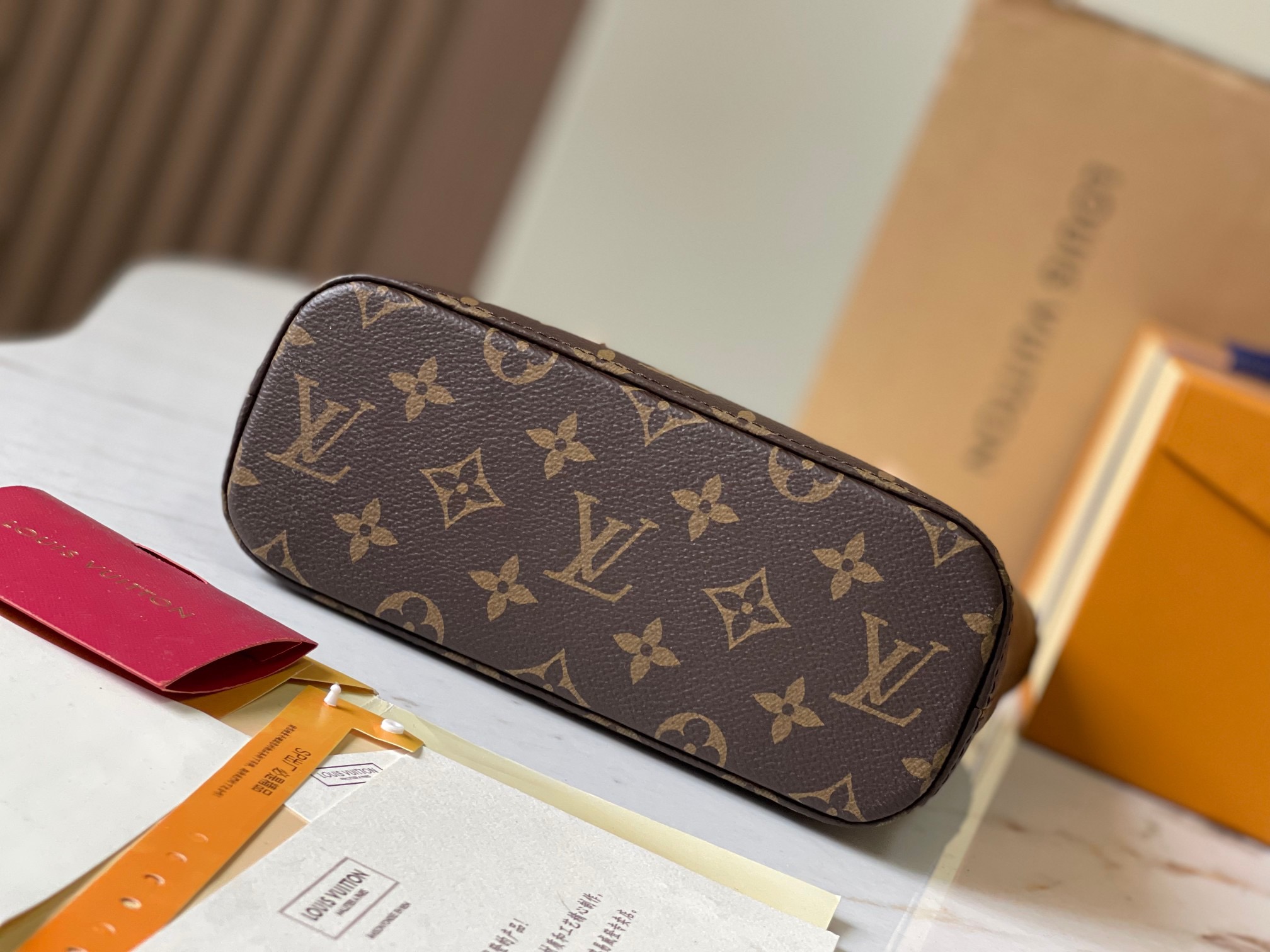Vivian菜篮子外层采用Monogram帆布一织物内衬一天然牛皮饰边。经典柔软Monogram面料搭配变色黄皮饰边,以一个日常购物完会拿到的购物袋为蓝本展开设计,小牛皮做材质制作,配以变色皮手柄及内袋细节,大容量包身、通勤包又一新选择。