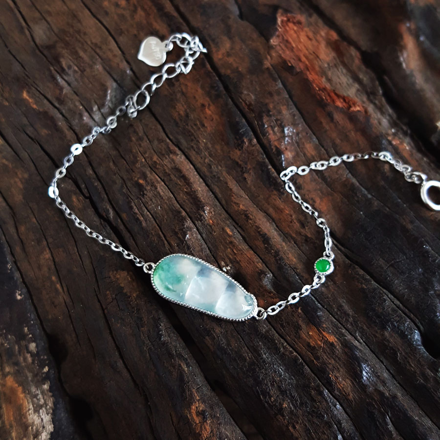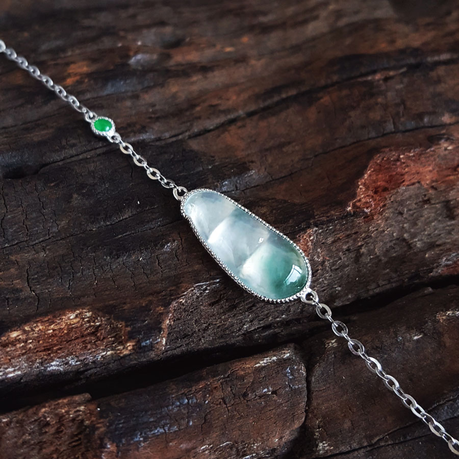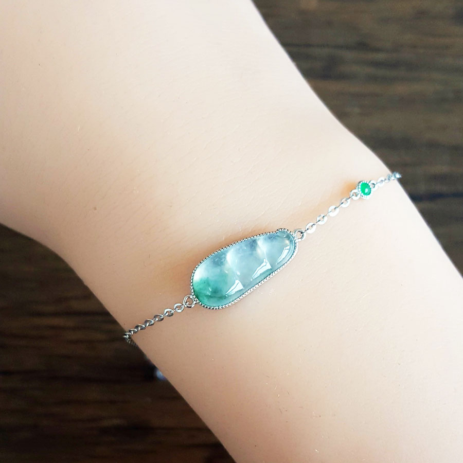 名称 | AU750白金镶天然细腻冰种飘蓝花福豆造型翡翠手链 |
