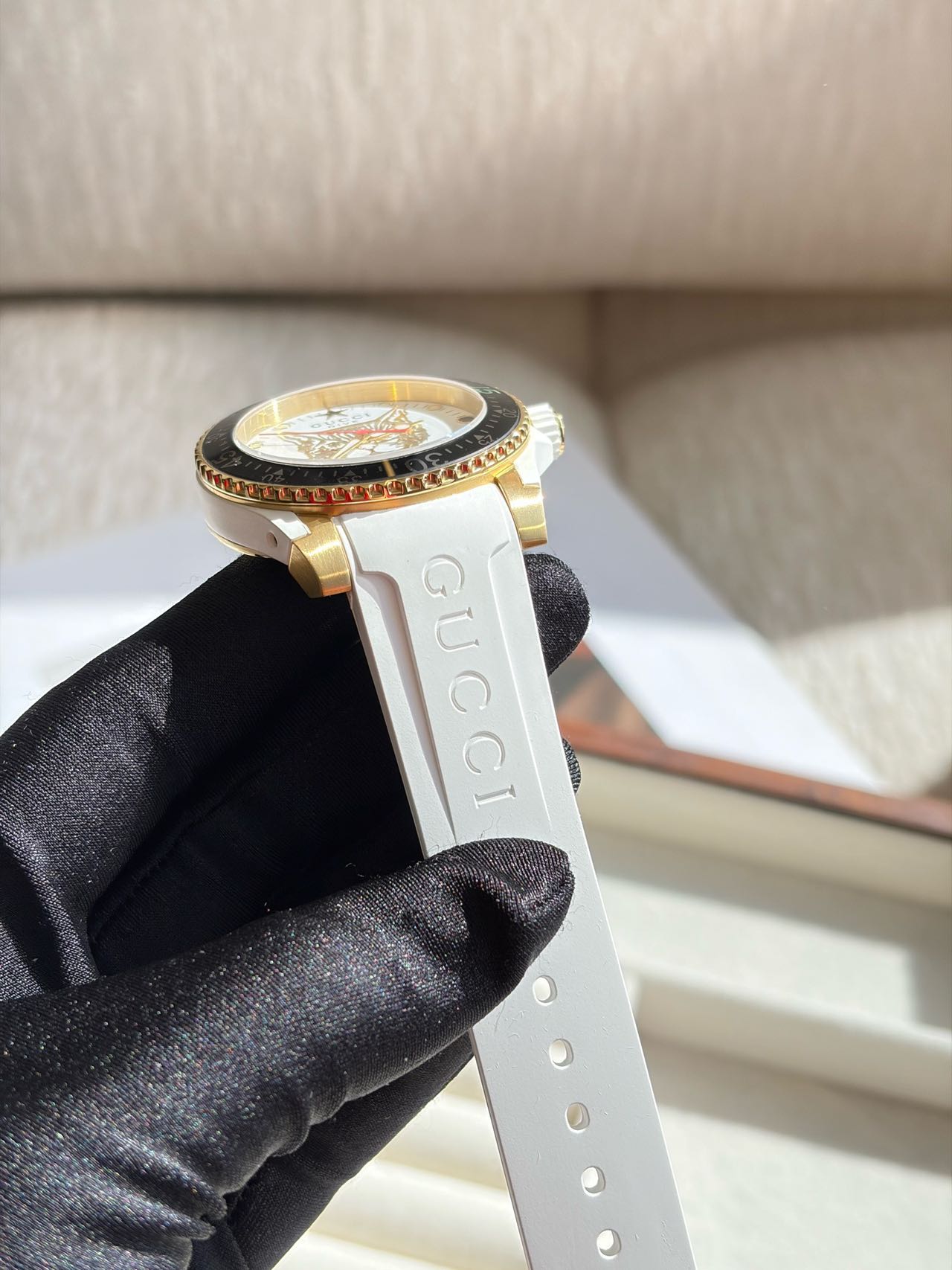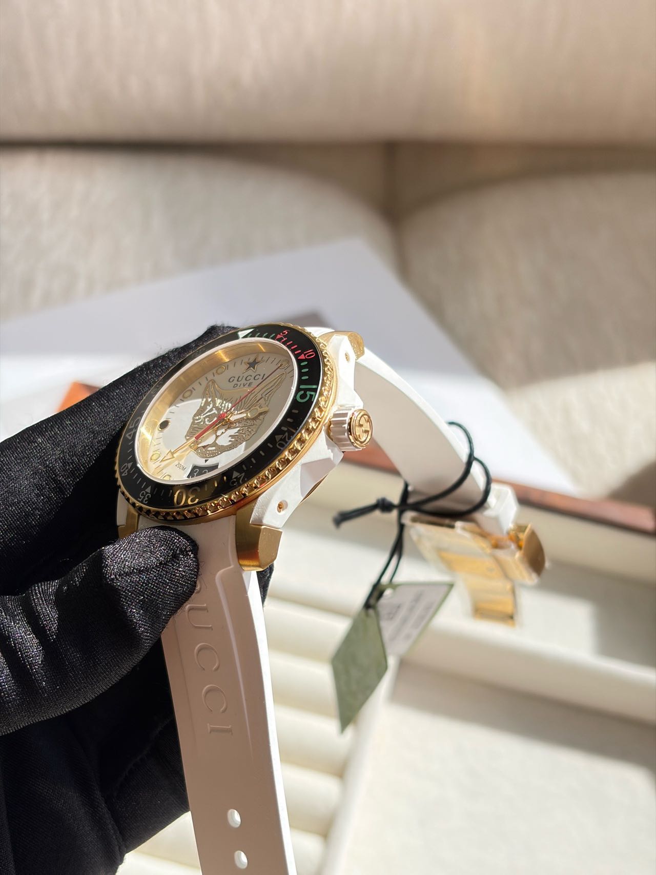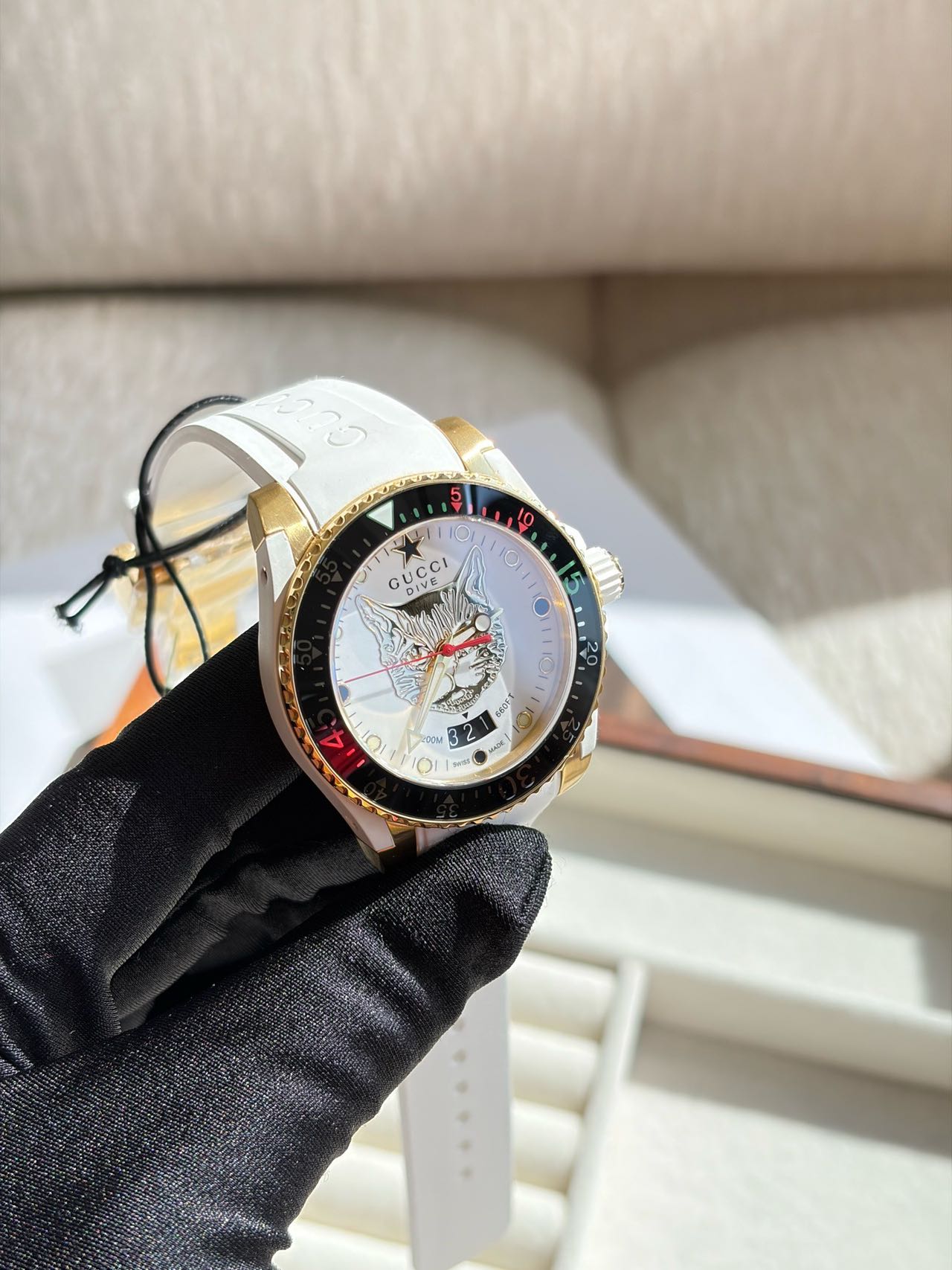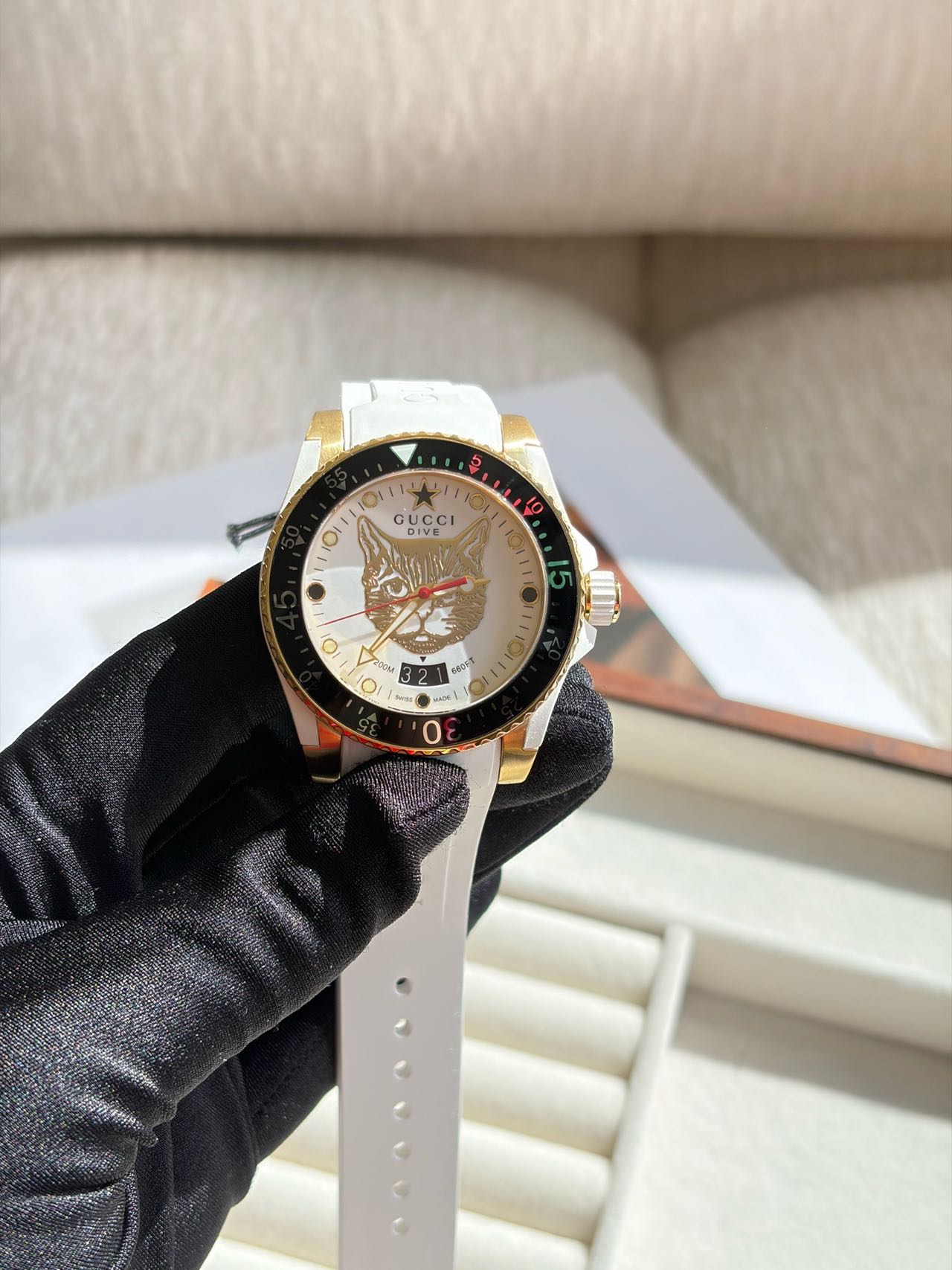 潜水表圈的15分钟倒计时区,则别出心裁的采用了Gucci经典的红绿对比色,12点位的星星时标,也是Gucci成衣上经常采用的设计元素