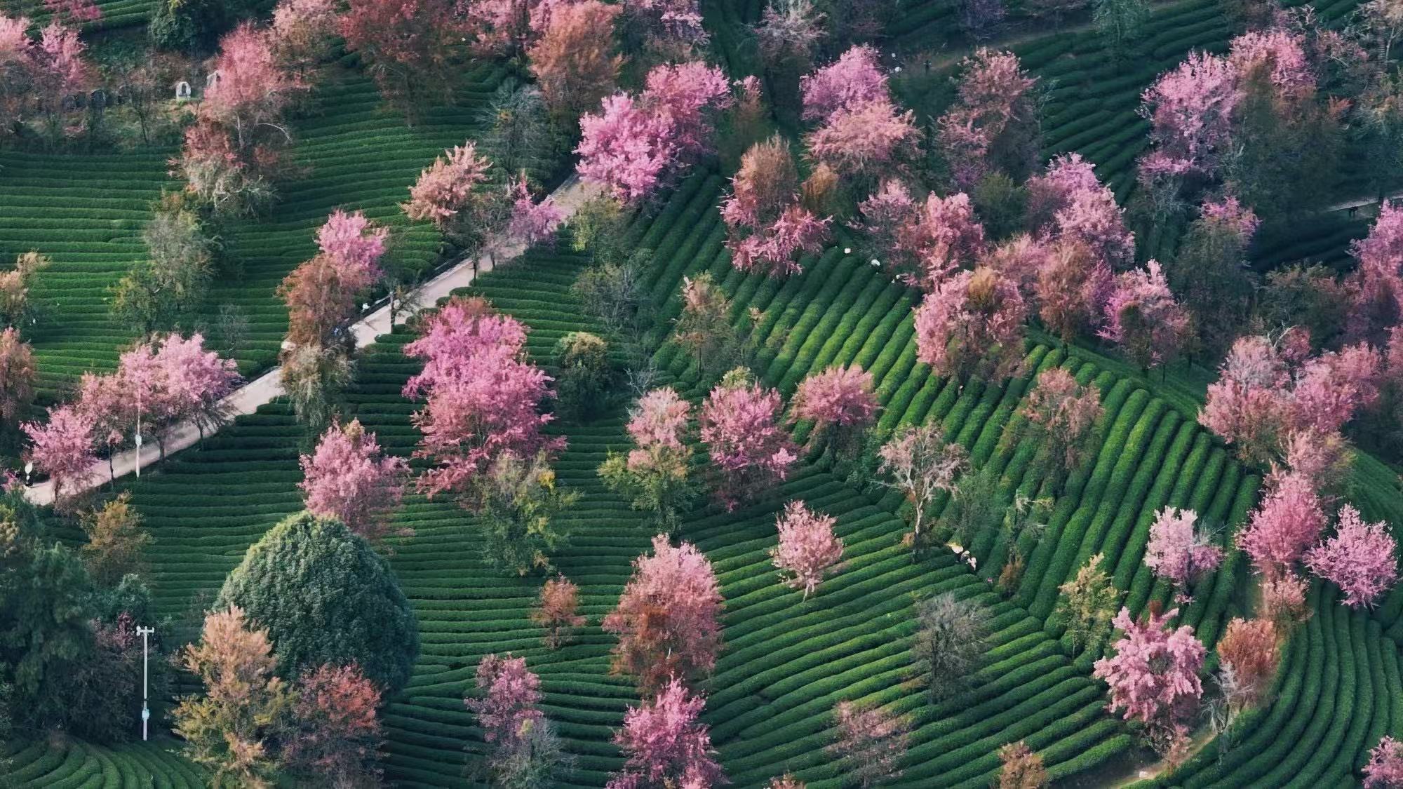 在无量山,2000多亩的茶山上,万株樱花盛开