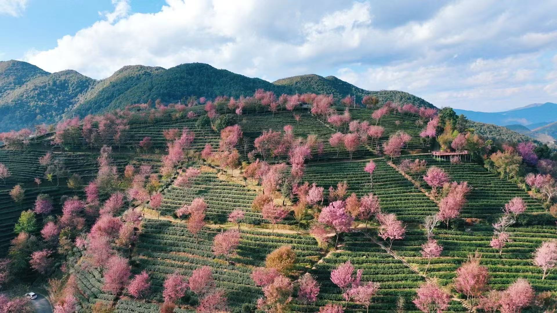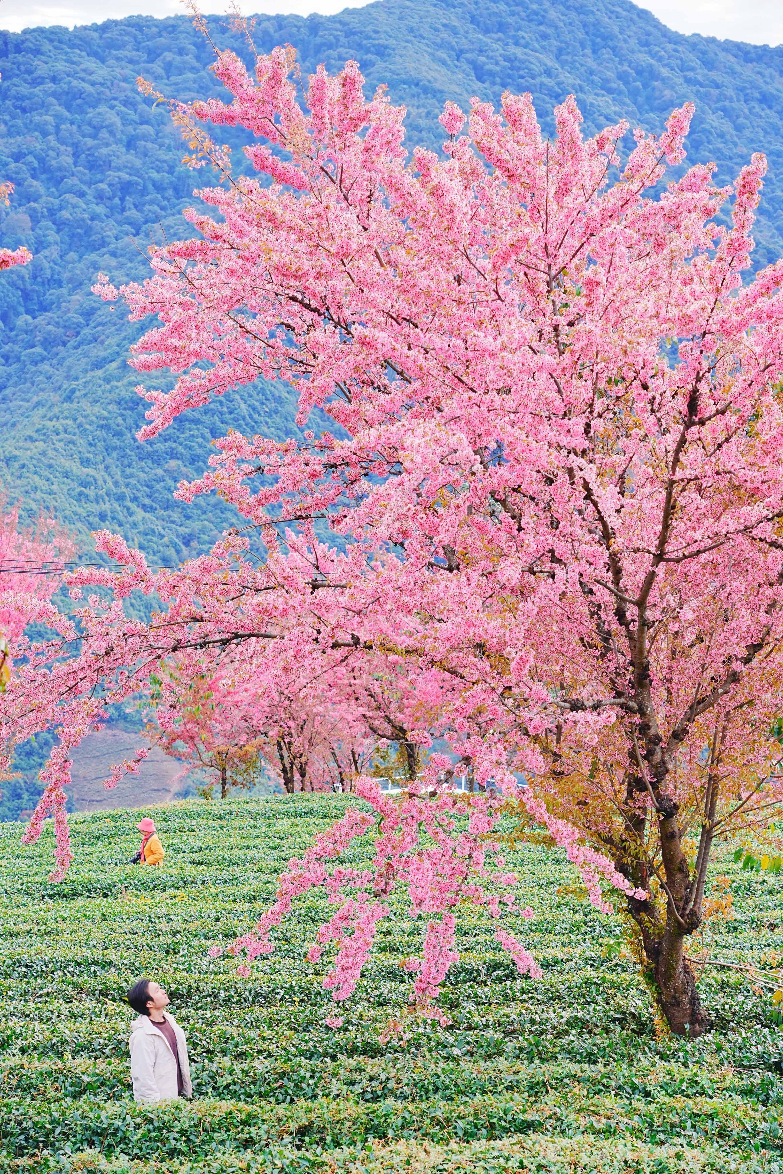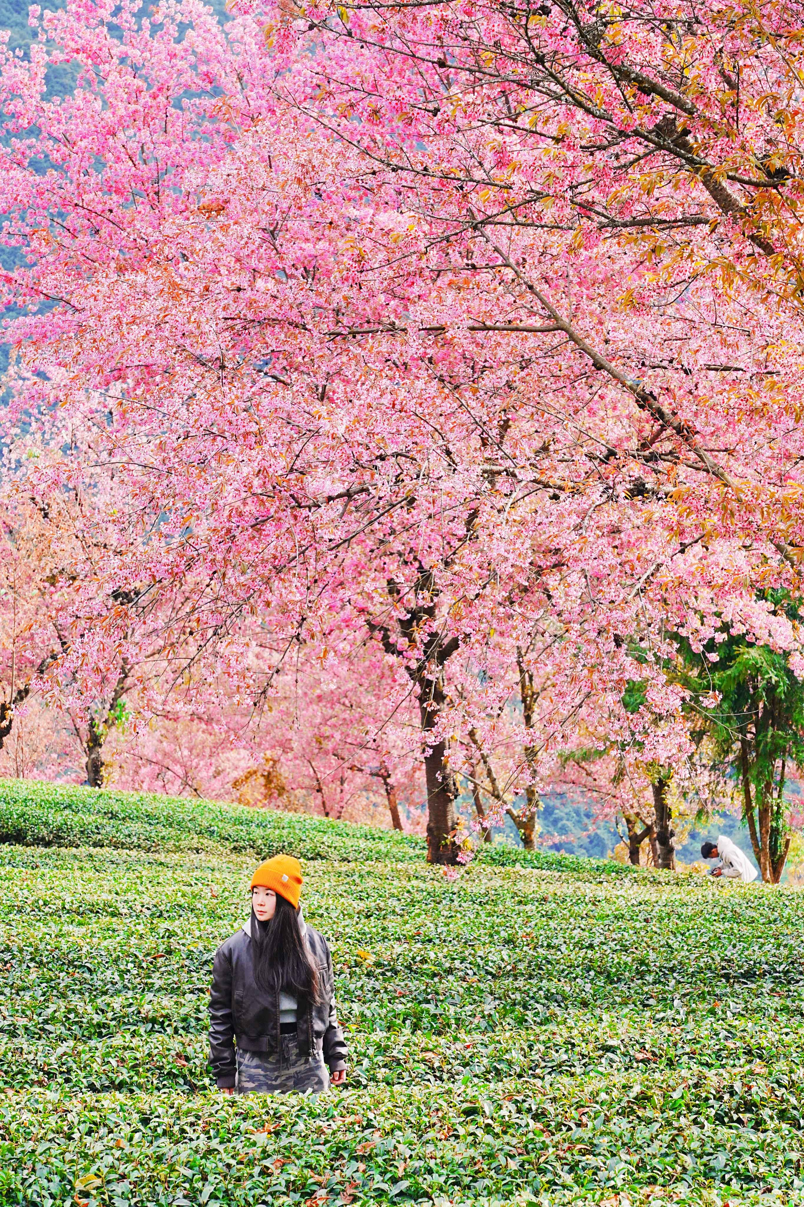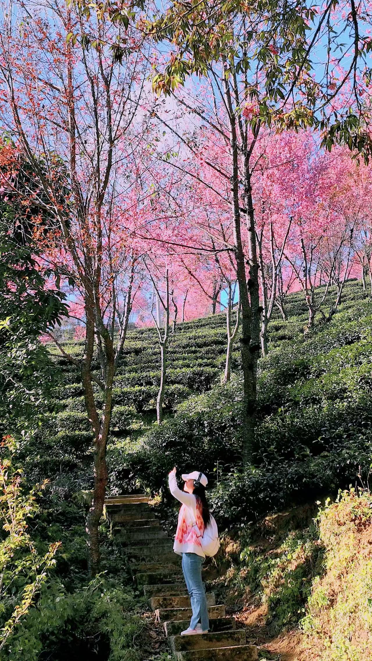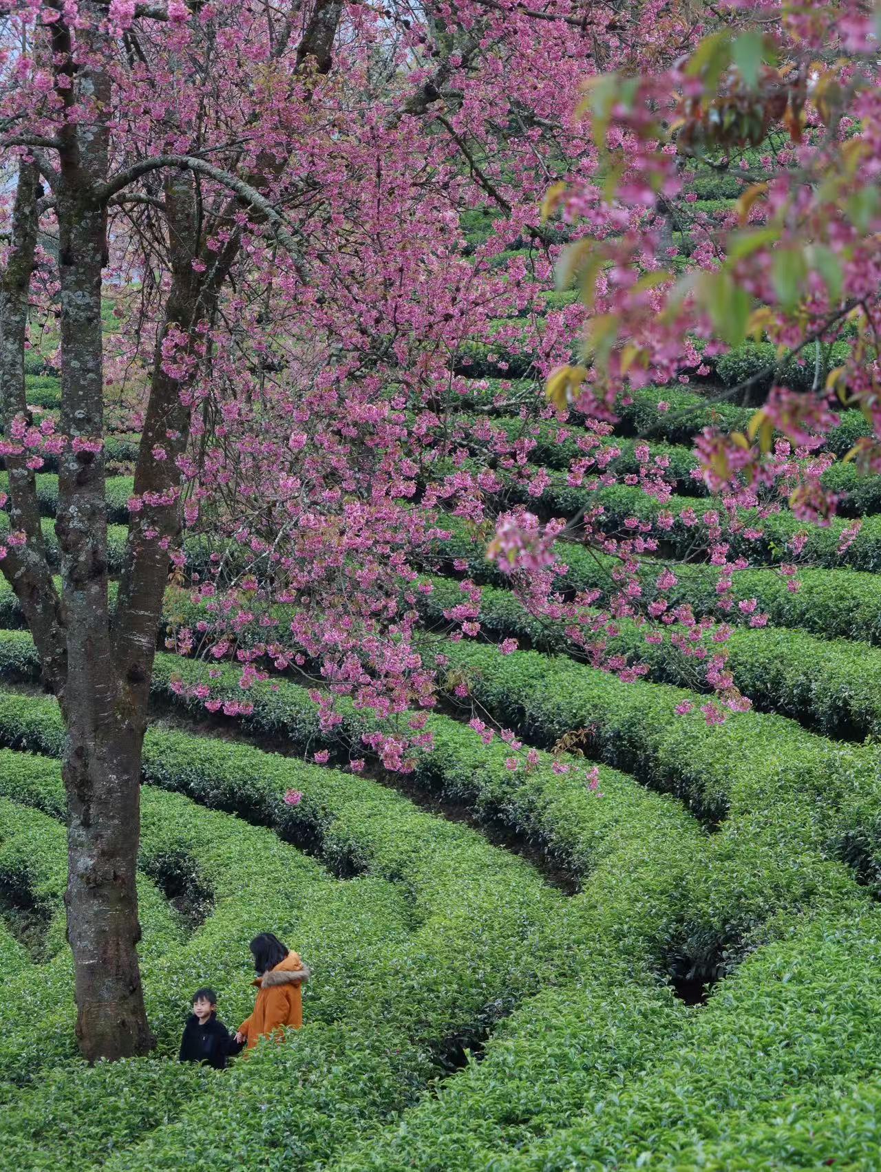 置身漫山遍野的茶林与樱花中