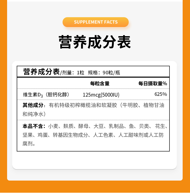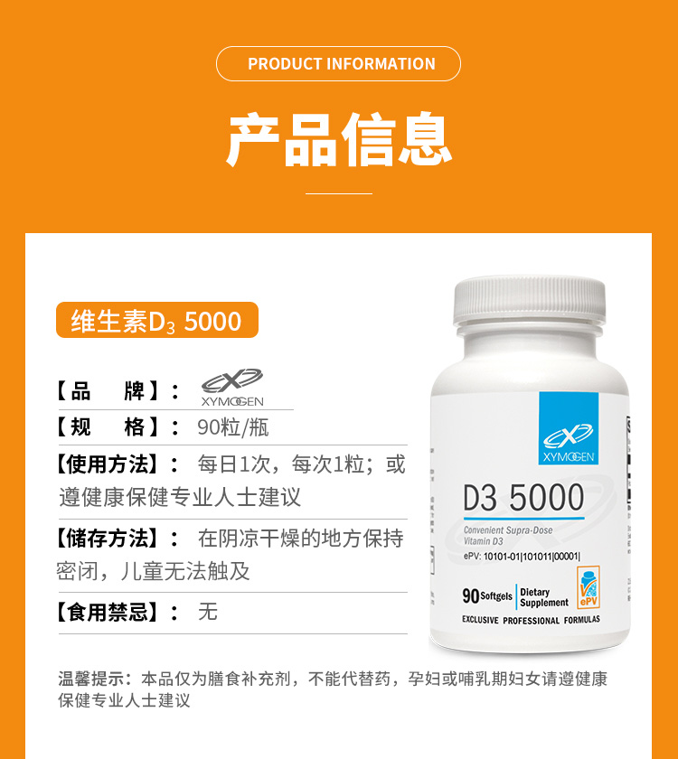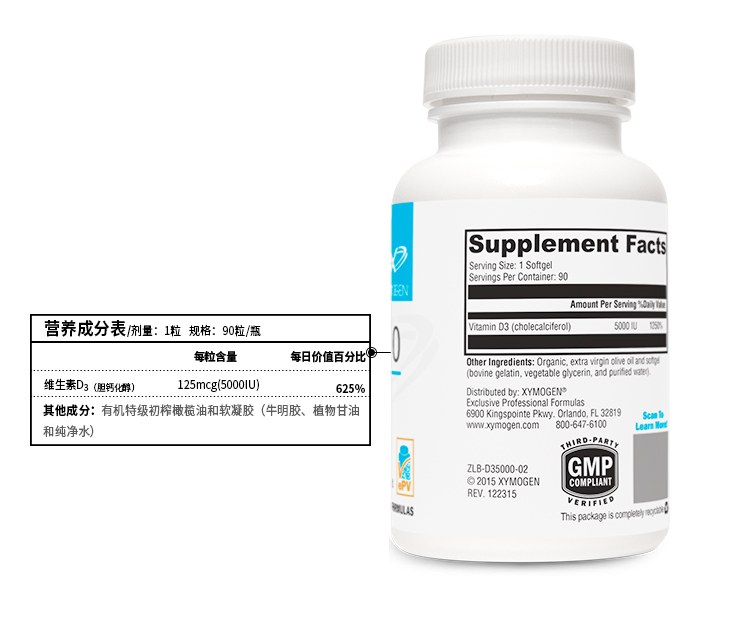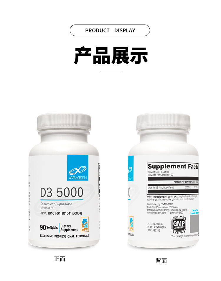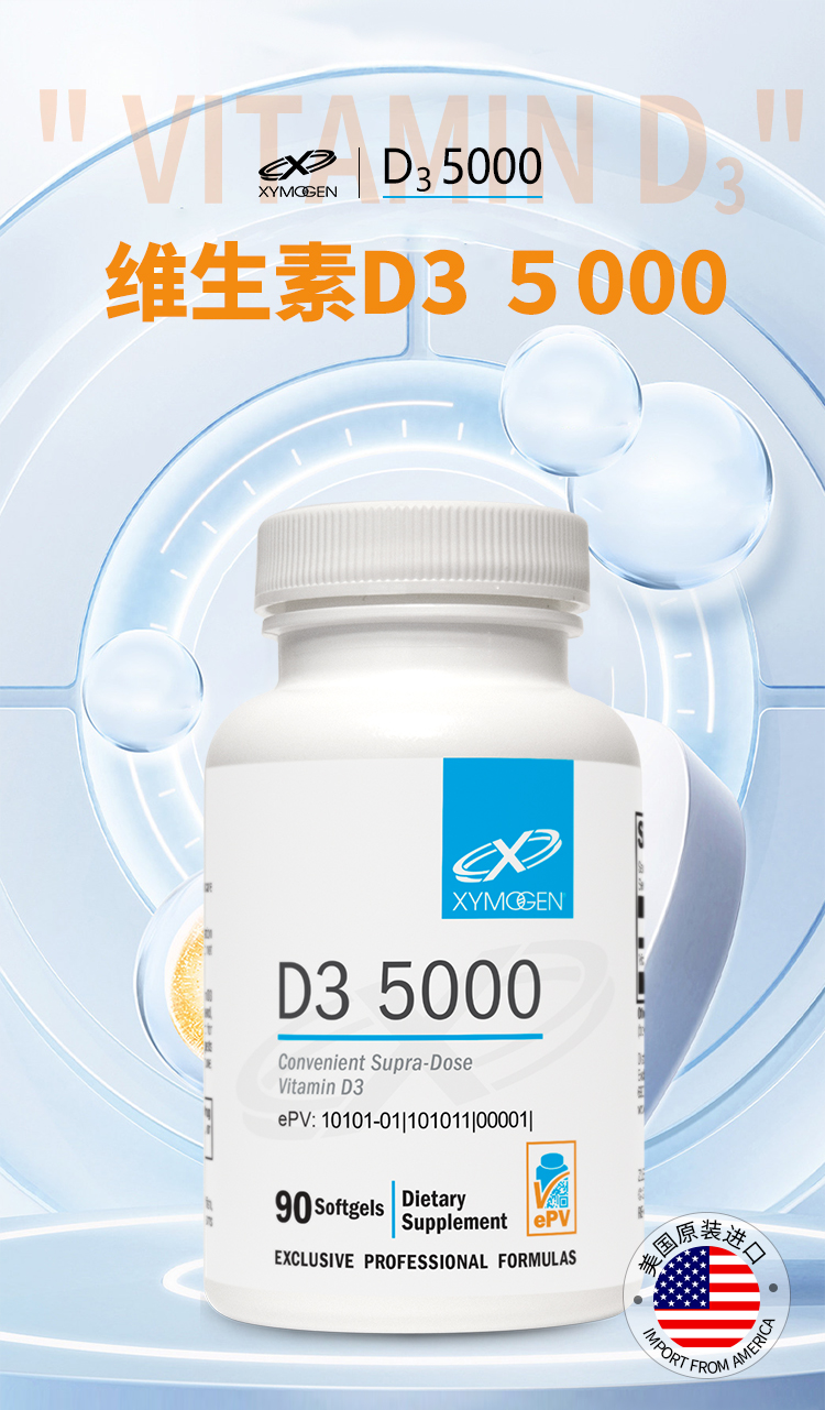 【效期至27年7月】维生素D3 5000胶囊 XYMOGEN D3 5000IU 90粒/瓶