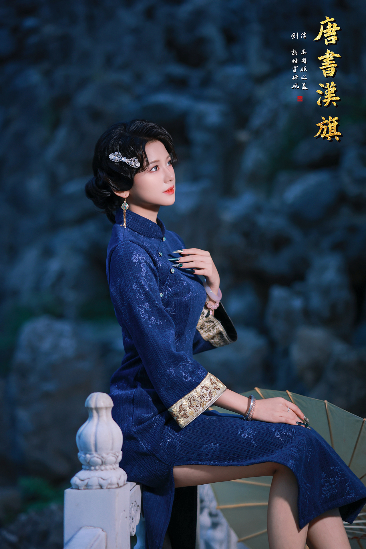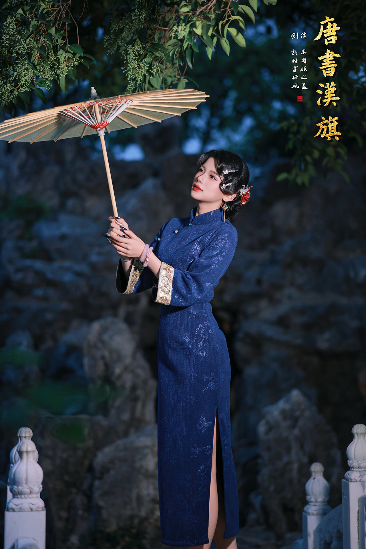 【蓝韵蝶雅】藏蓝提花旗袍立领缀温润玉扣,七分袖口饰精致绣边,尽显复古温婉;提花面料暗织花蝶竹影,朦胧诗意漫溢衣身,修身剪裁勾勒东方曲线,开衩设计更添步履灵秀。