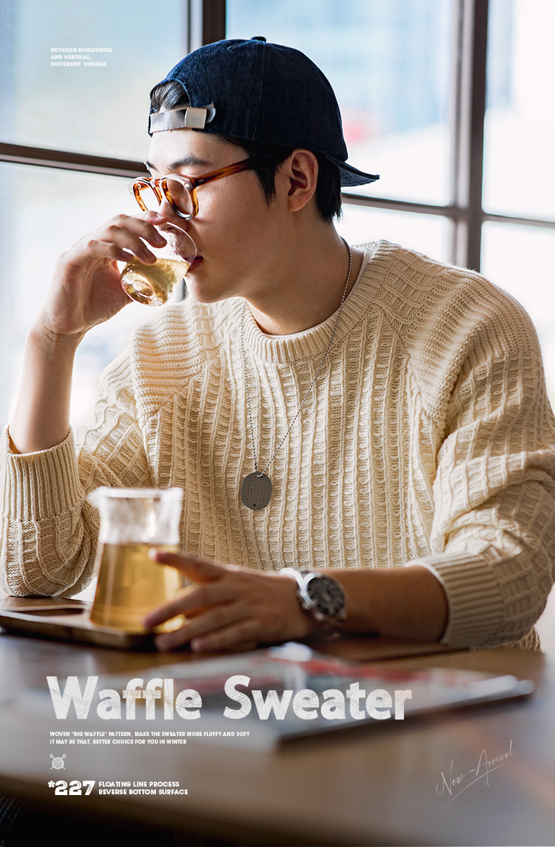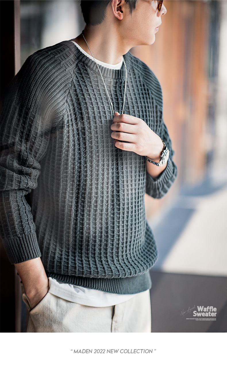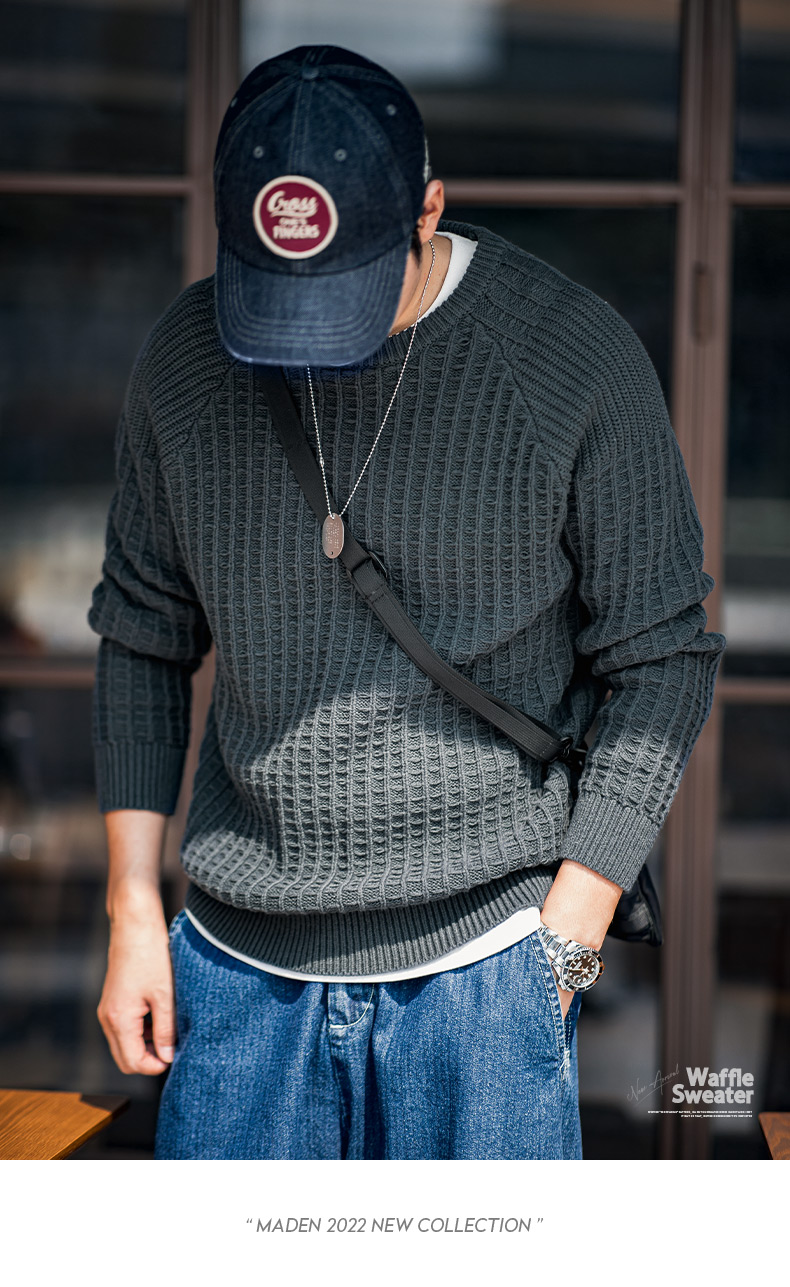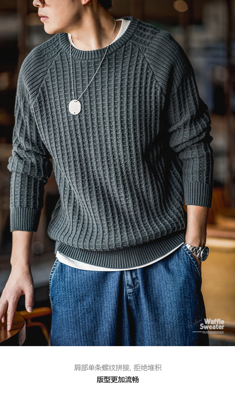 工装优选 美式休闲华夫格圆领针织衫保暖套头内搭打底毛衣男秋冬