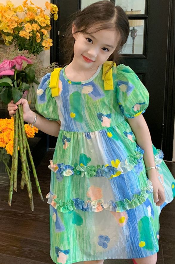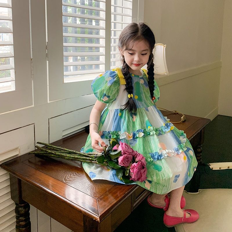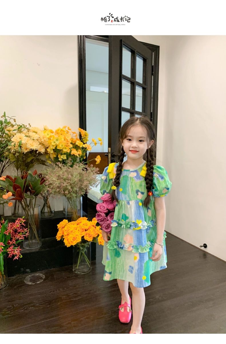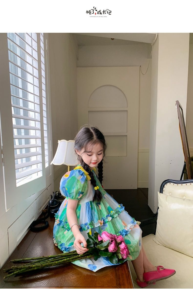 新款女童田园油画风连衣裙夏装新款女孩渐变色公主裙儿童短袖裙子