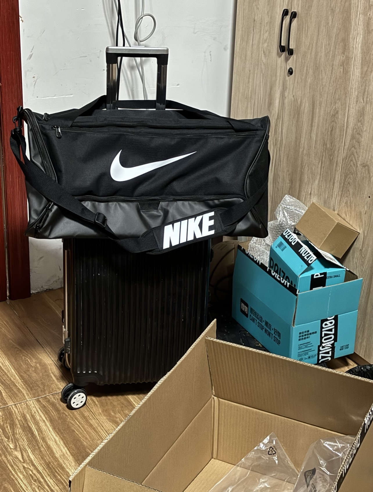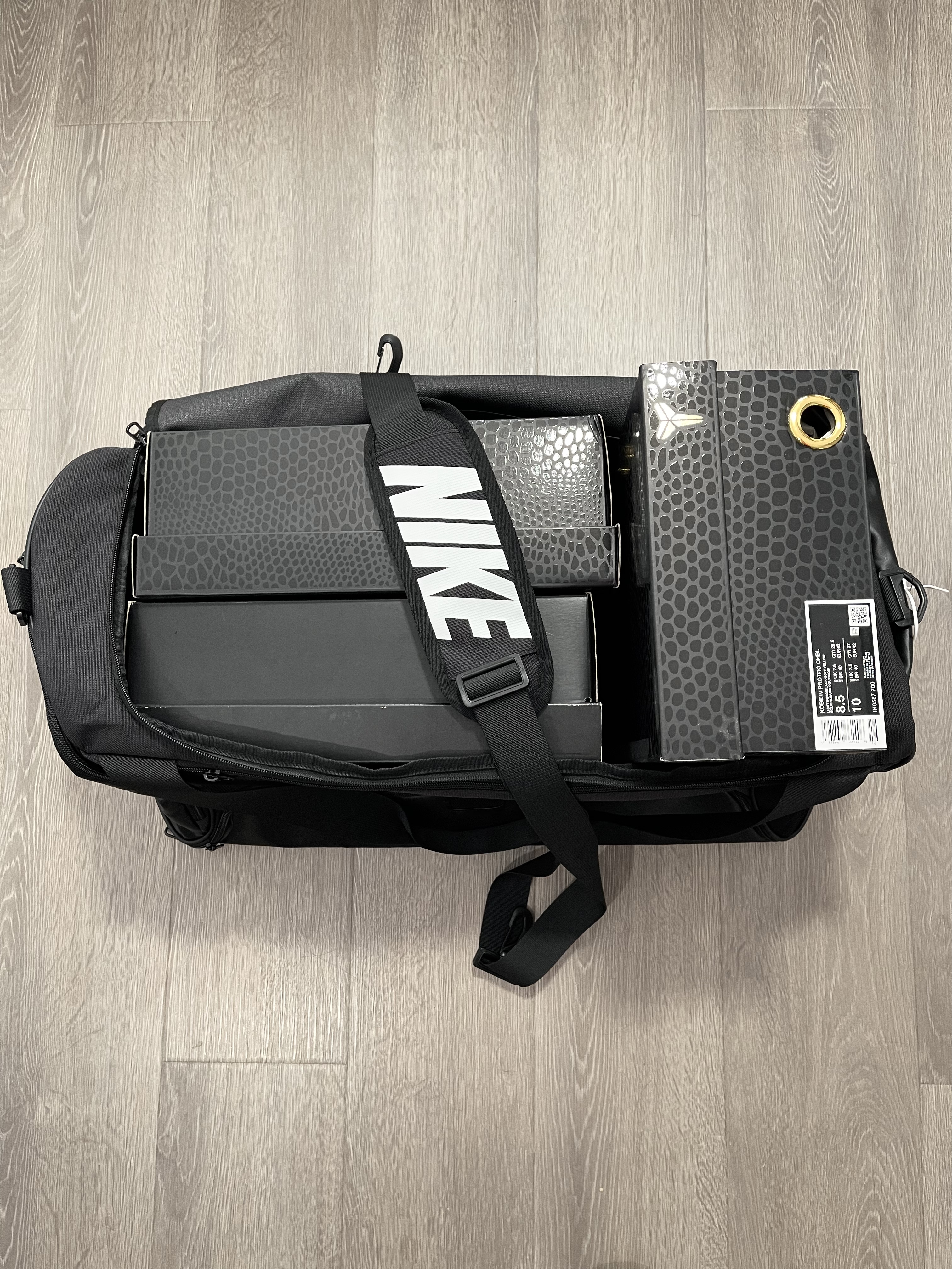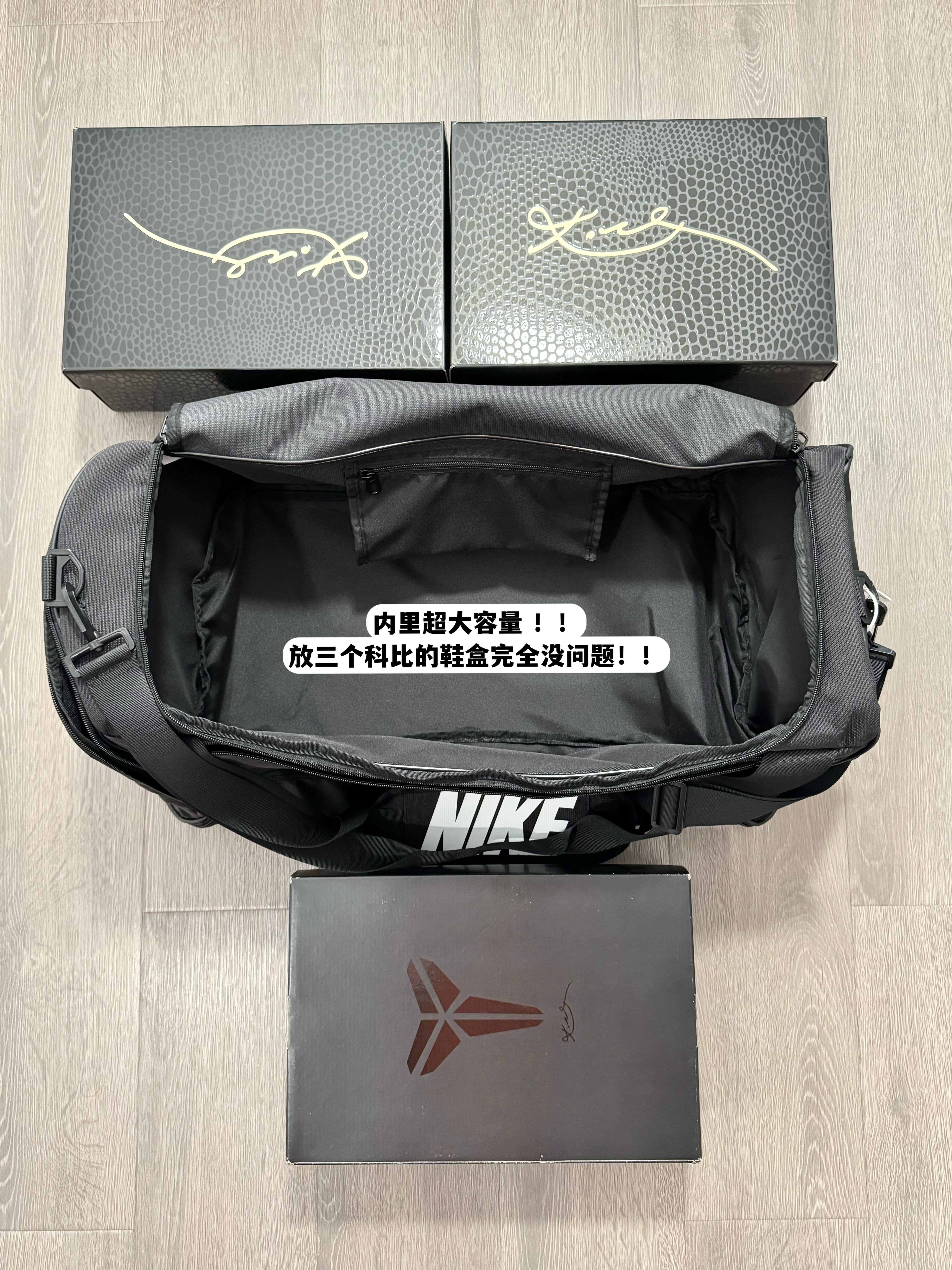 容量超级大!可以当行李包健身包,我测试了一下可以放下三个科比球鞋的鞋盒!!