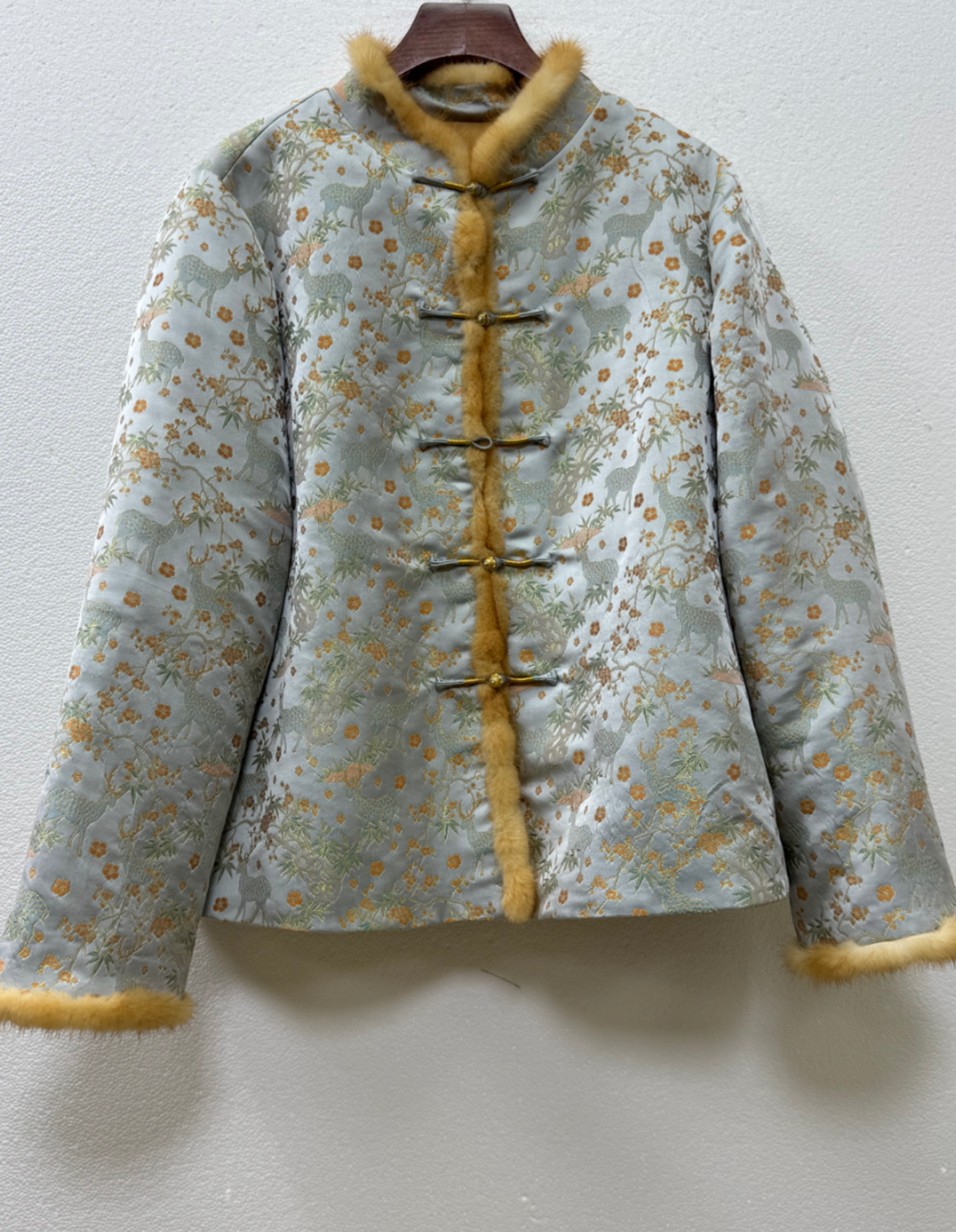 盛唐婧 | 喜报春禄新中式宋锦拼水貂夹棉对襟外套