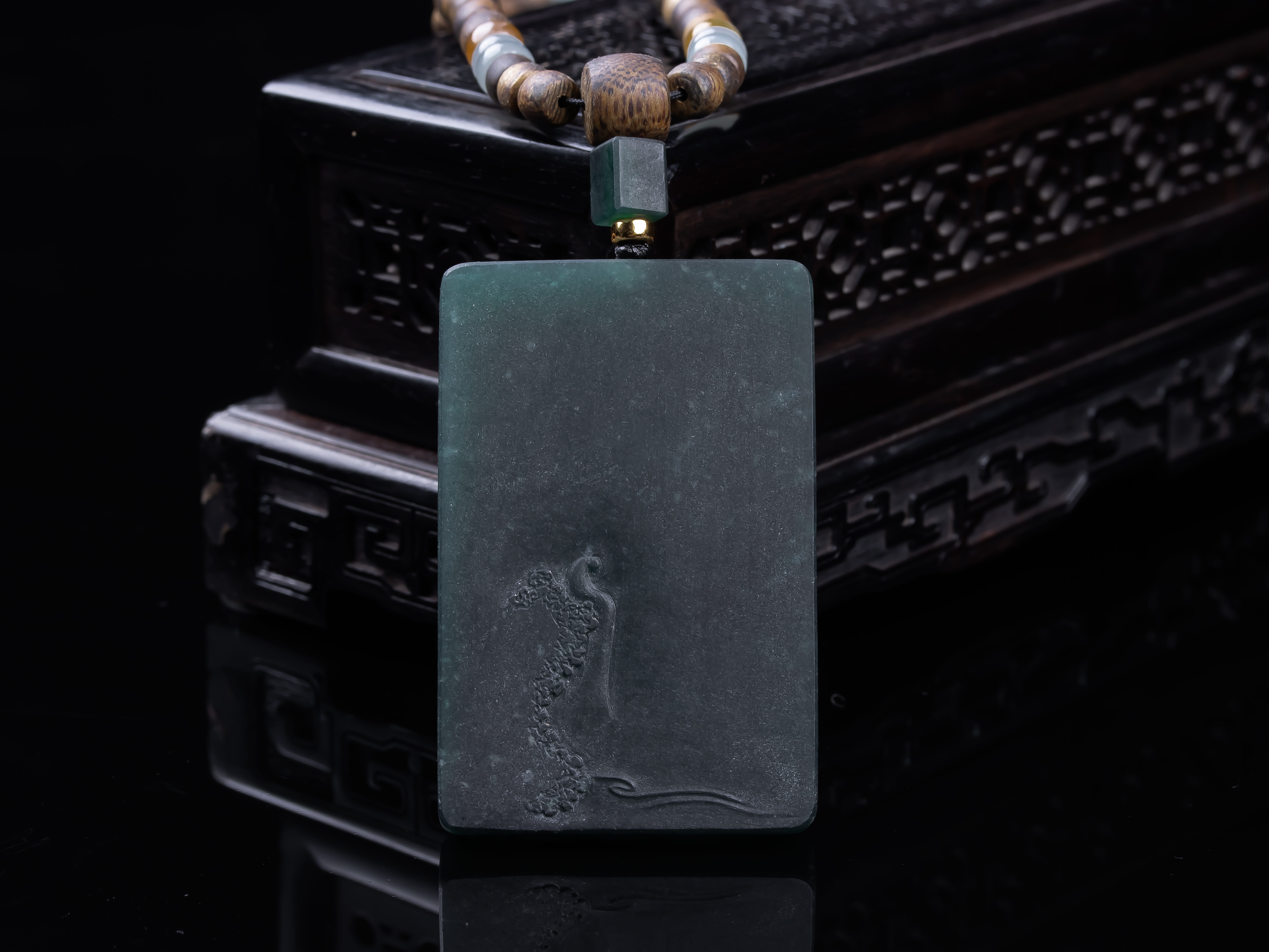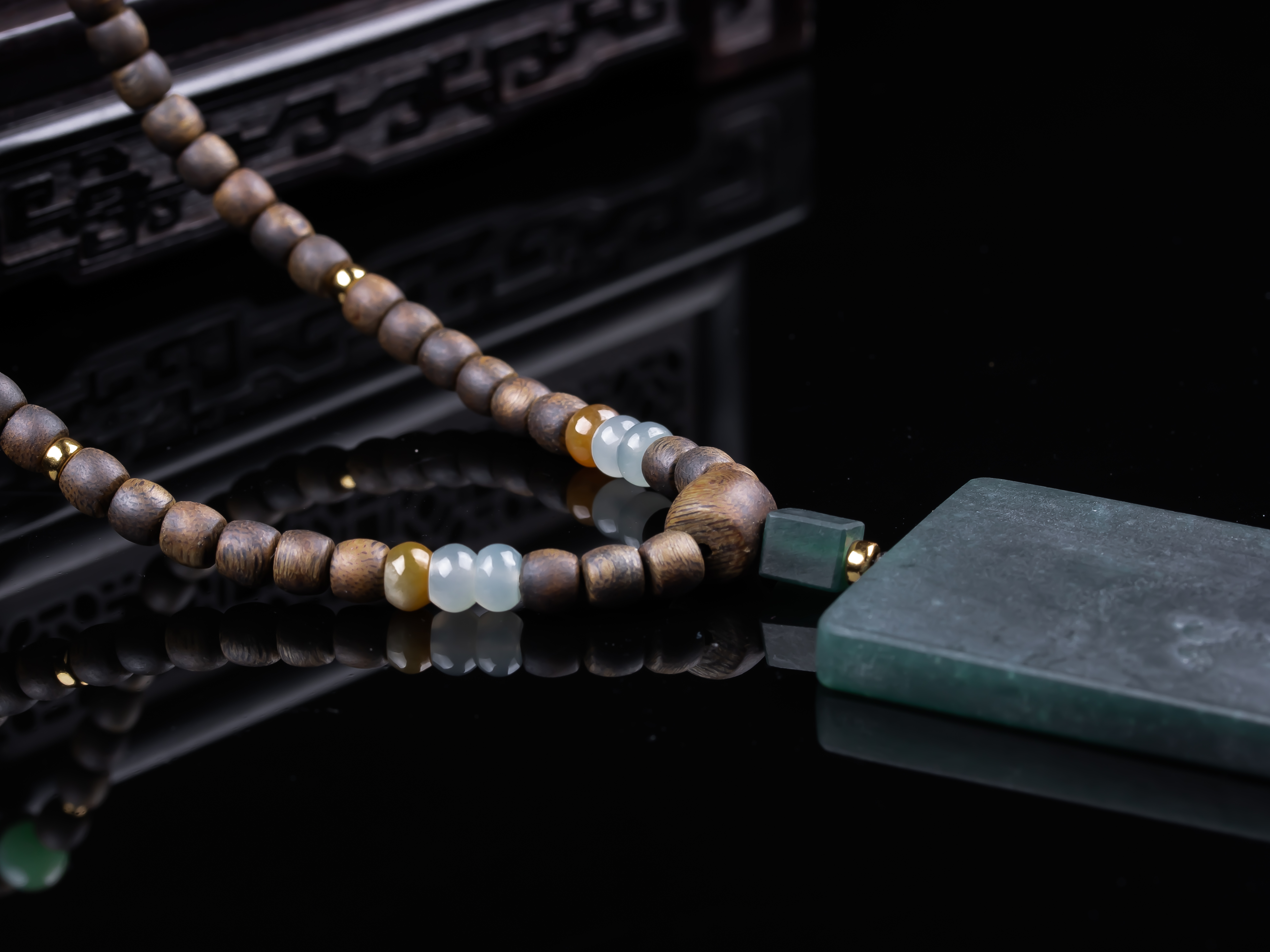 XY0358沉香+翡翠悟道牌挂件,天然沉香鼓珠约5.9*5.6mm,原色原味,香味自然清甜,蓝水底的翡翠牌子,目雕刻一达摩崖上静坐悟道,以素描式的简约流畅雕刻,刻画出一幅安静祥和、人与自然和谐统一的画面,既有风景之美,又给人静心养性的精神感观。