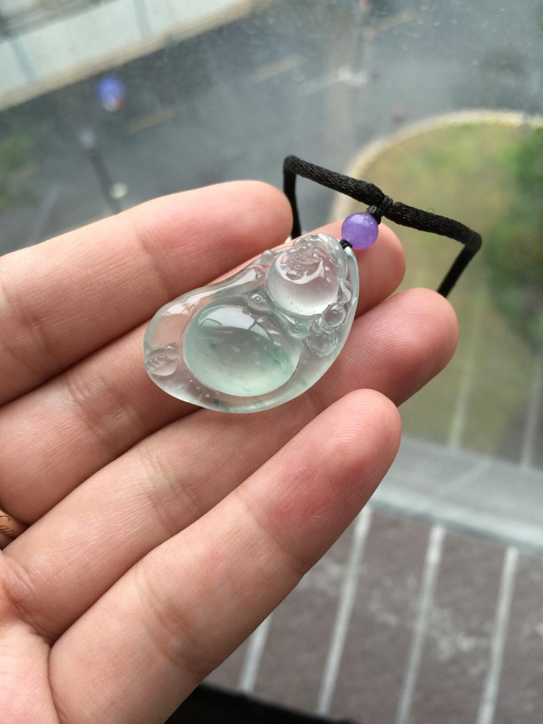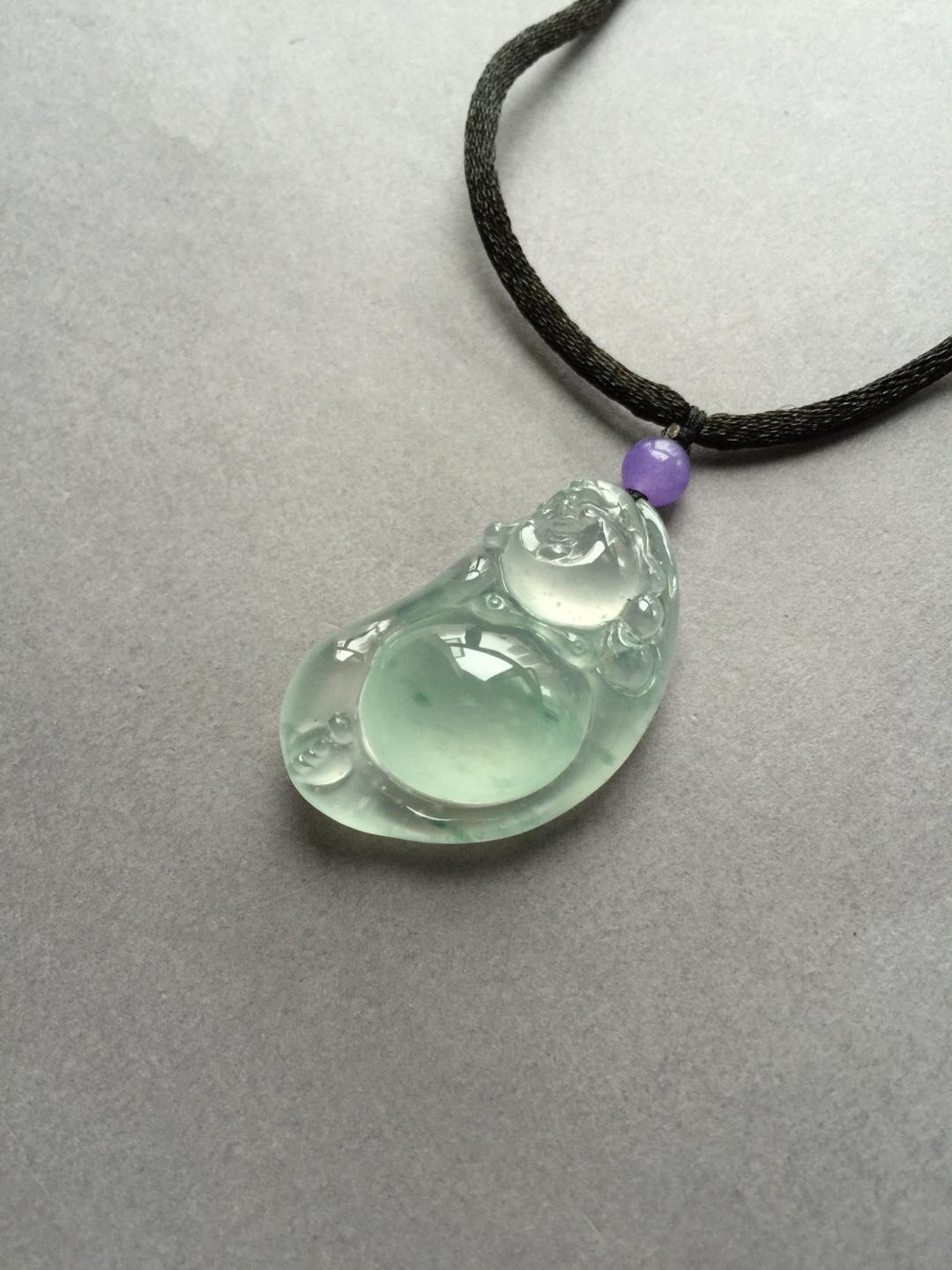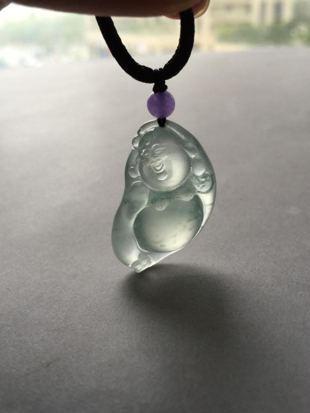 翡翠玻璃种飘花逍遥佛,35.3*19.5*10.8mm。尺寸大气,厚庄,超过10的厚度,如此品质,真的是非常稀有。肚子圆鼓鼓得就像一个大蛋面,种水品质绝了,强刚性,玻璃种的杰出代表。纯手工精雕,写意洒脱,把弥勒佛逍遥自在的神态刻画得入木三分,稀有尺寸和品质,推荐收藏