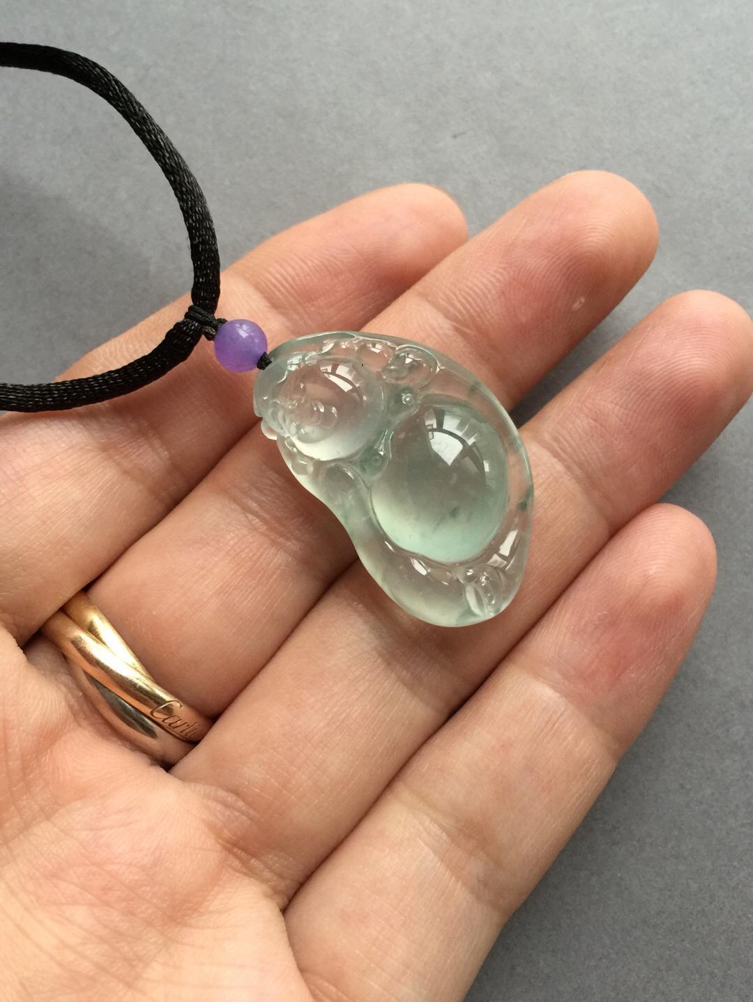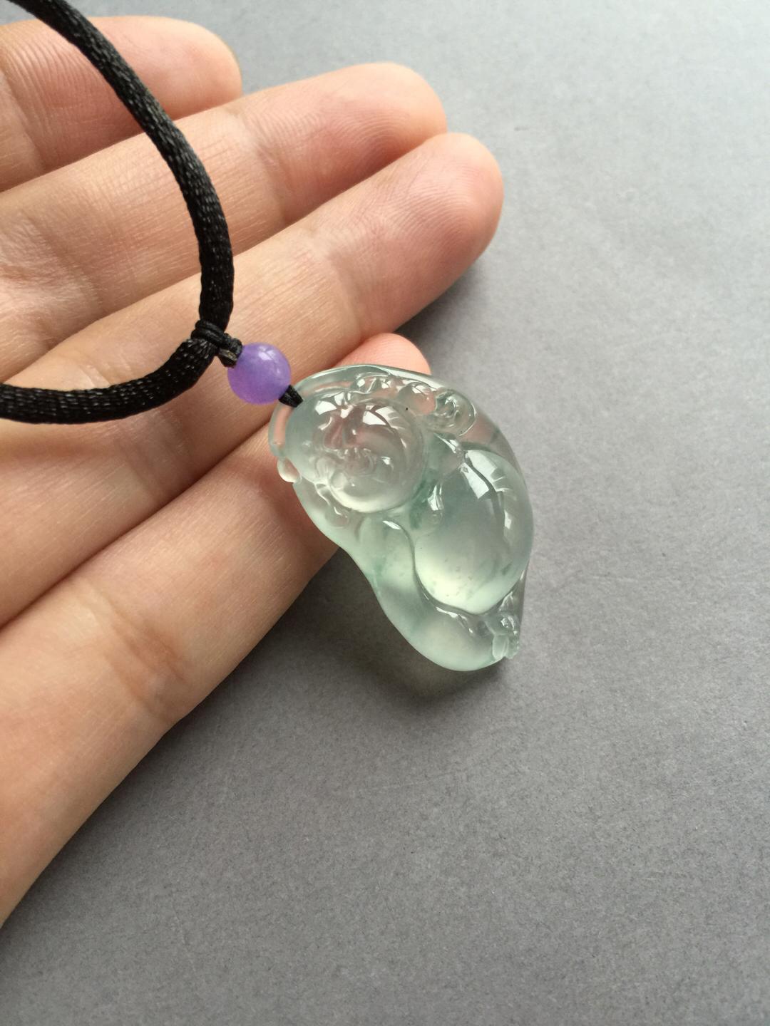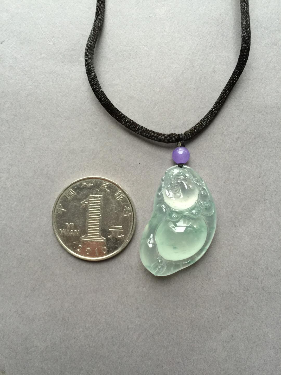 翡翠玻璃种飘花逍遥佛,35.3*19.5*10.8mm。尺寸大气,厚庄,超过10的厚度,如此品质,真的是非常稀有。肚子圆鼓鼓得就像一个大蛋面,种水品质绝了,强刚性,玻璃种的杰出代表。纯手工精雕,写意洒脱,把弥勒佛逍遥自在的神态刻画得入木三分,稀有尺寸和品质,推荐收藏