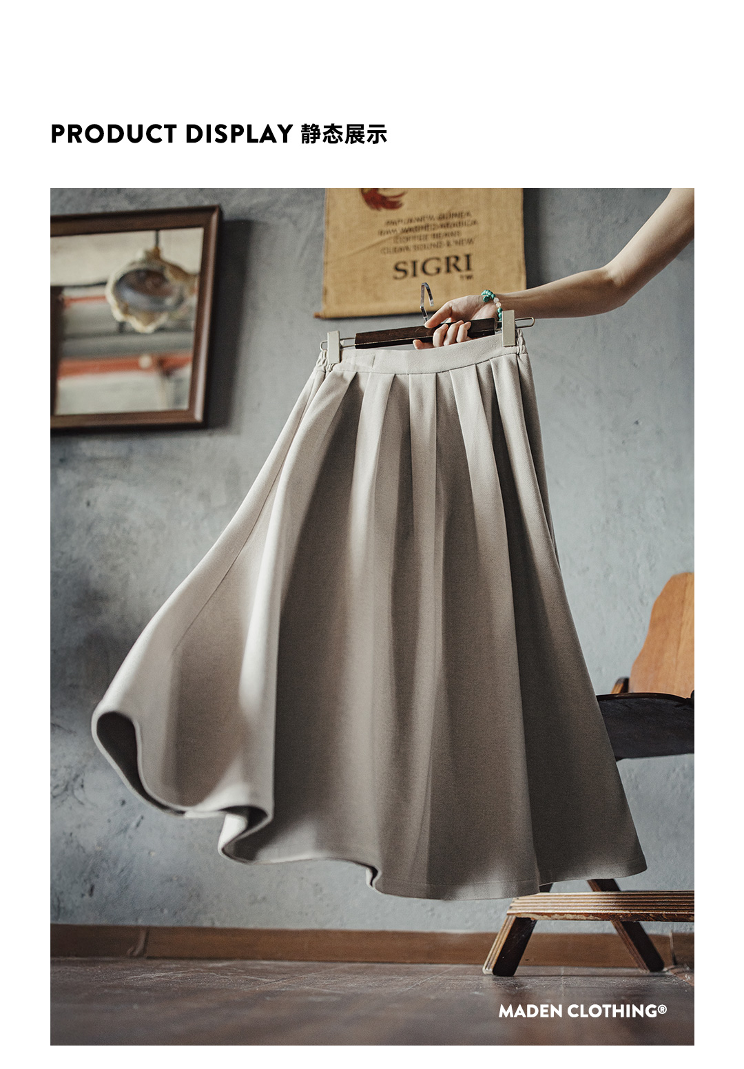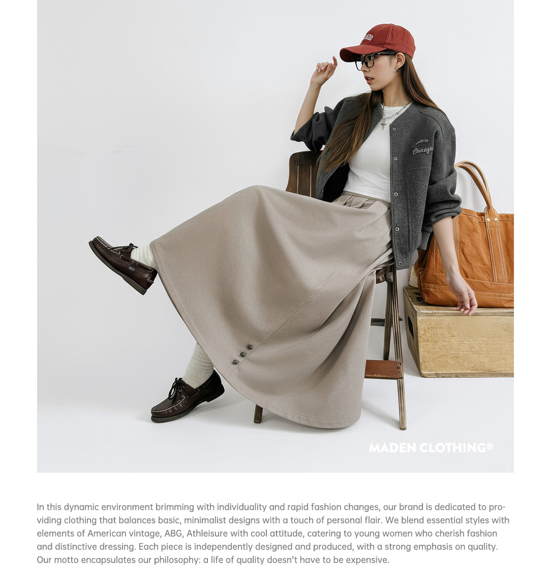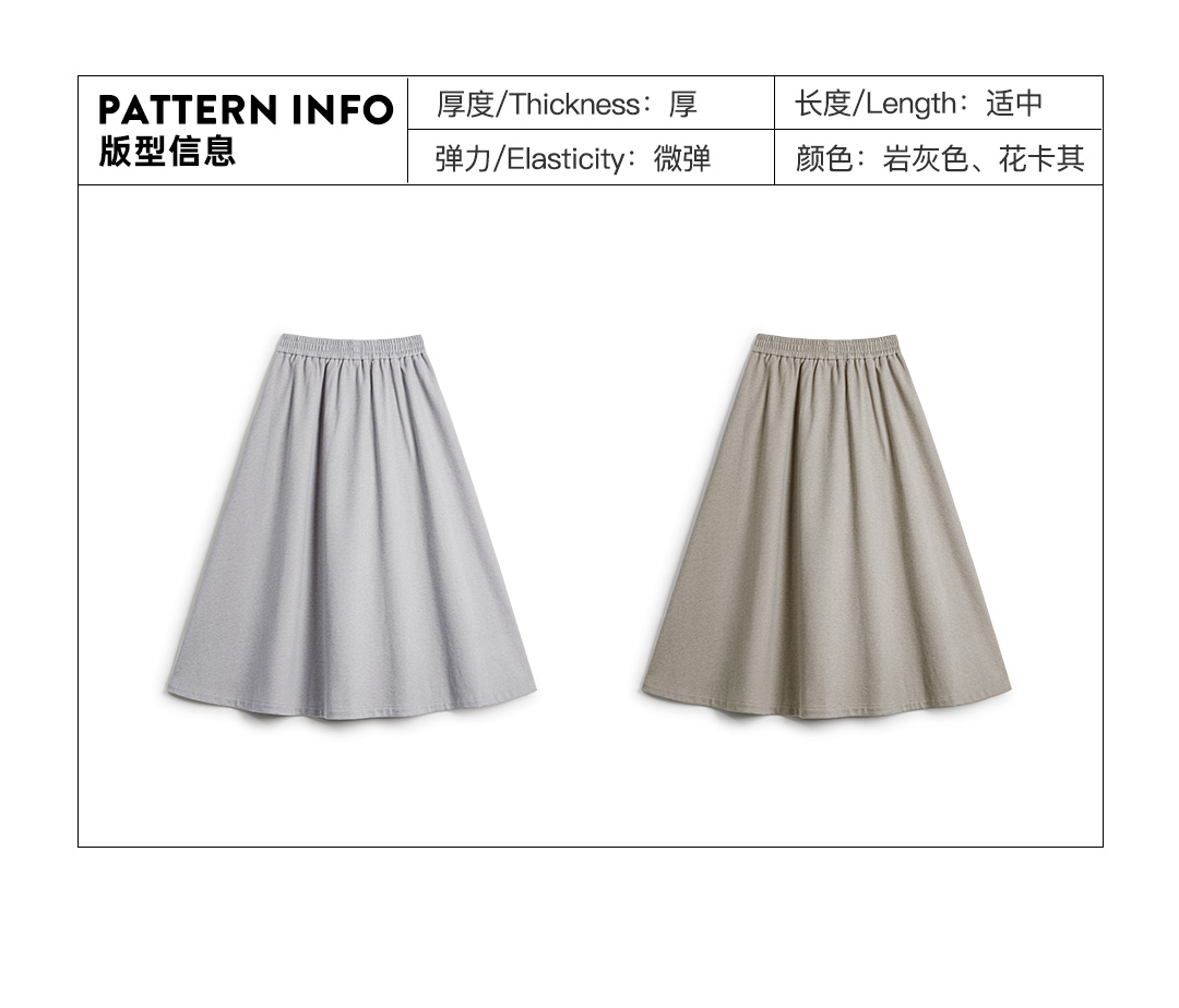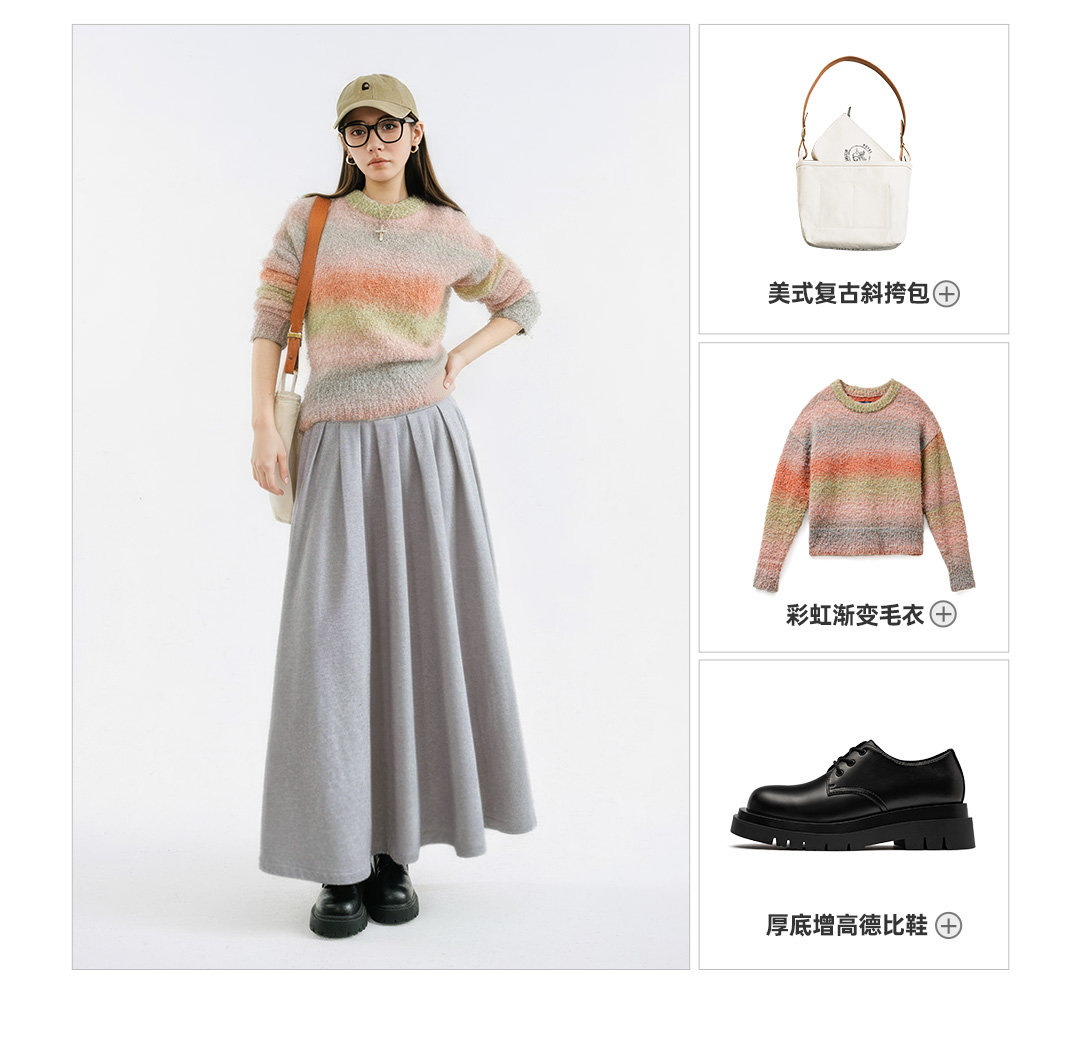 马登灰色毛呢大摆半身长裙针织松紧腰垂坠感百褶A字伞裙秋冬女士
