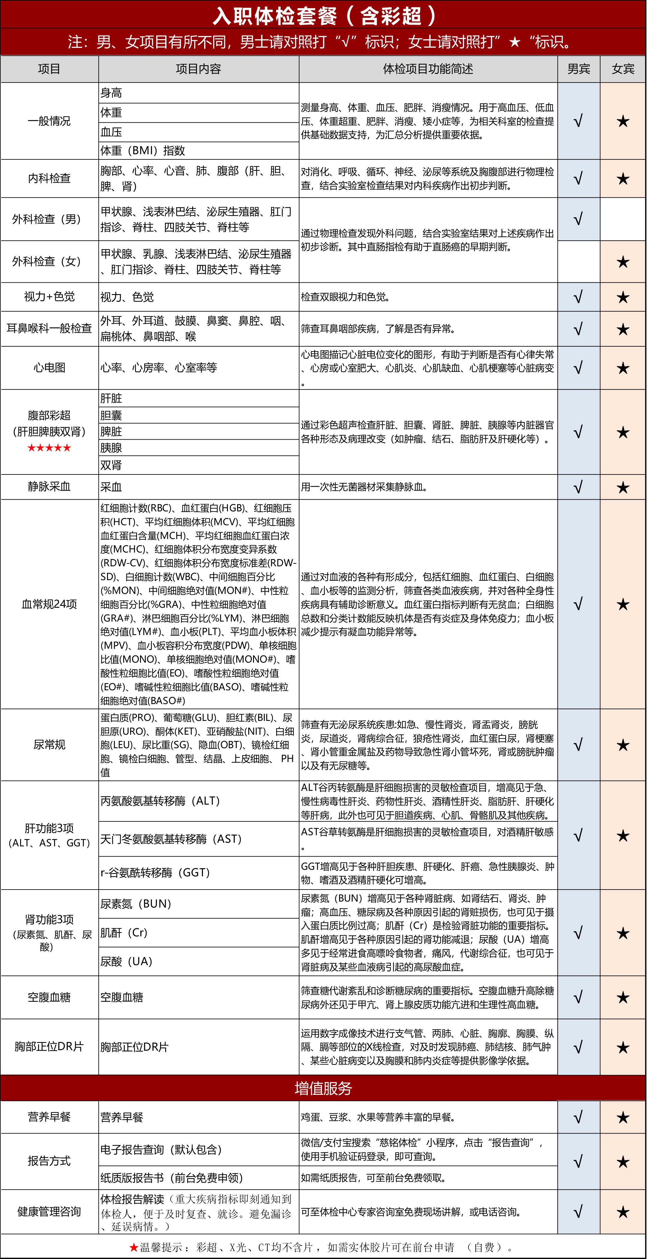 购买须知:以上体检项目表格即本套餐包含的详细内容,男性、女性略有不同,请对照对应标注的套餐分组。