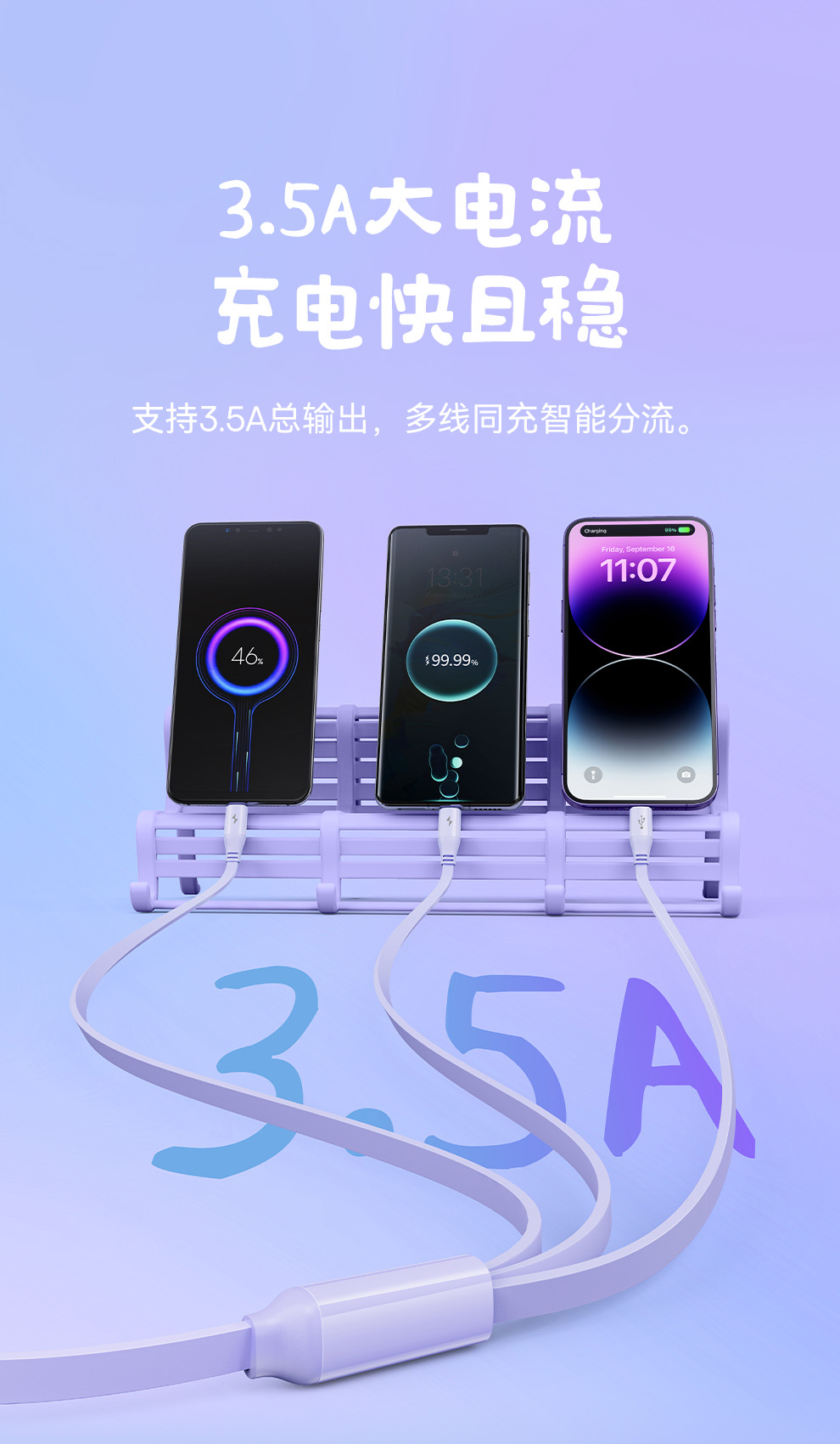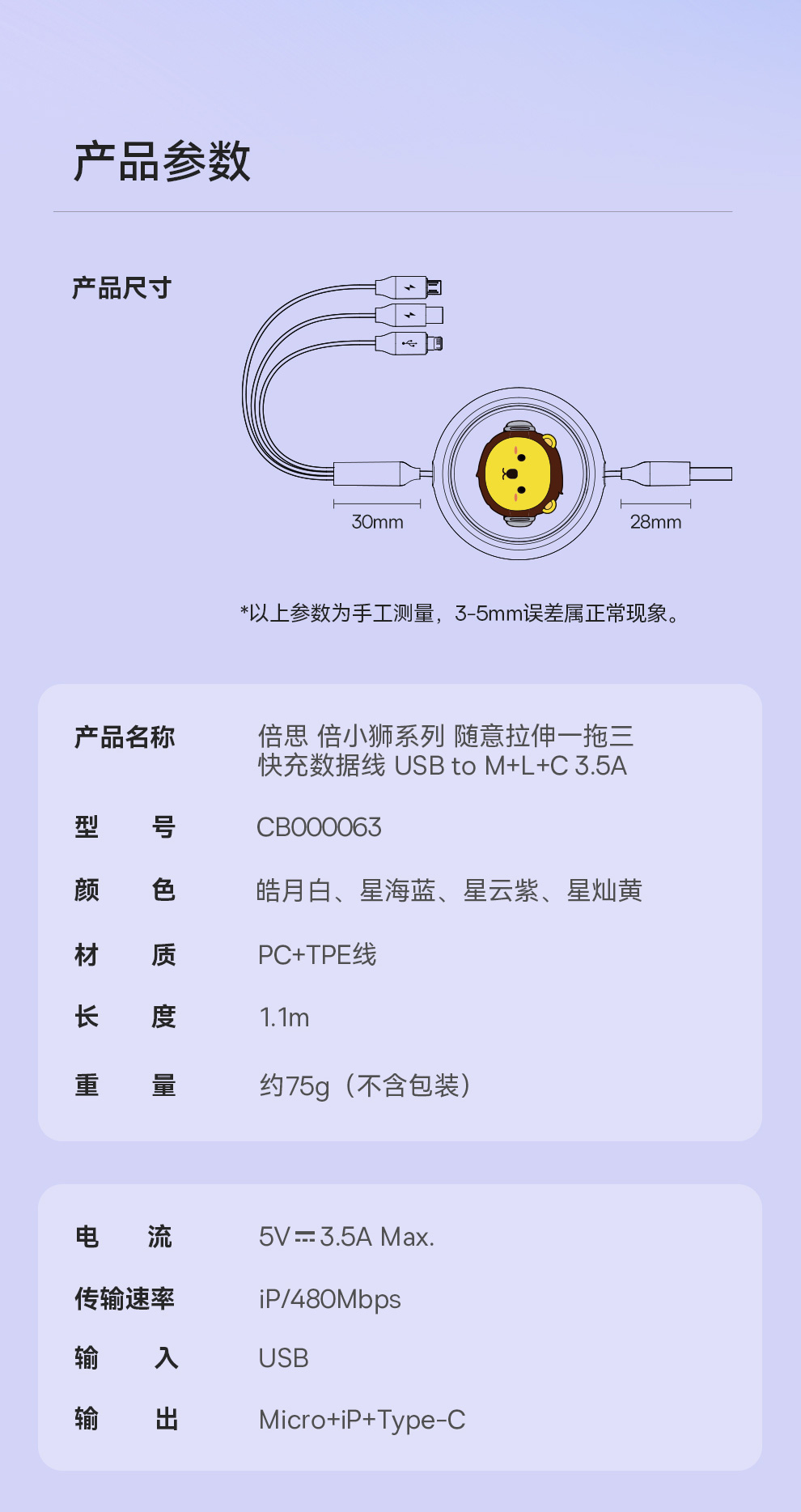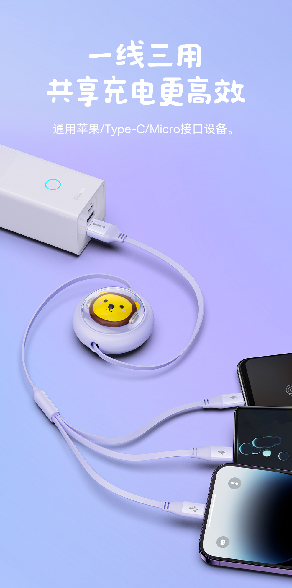 倍思 倍小狮系列 随意拉伸一拖三快充数据线 USB to M+L+C 3.5A 1.1m