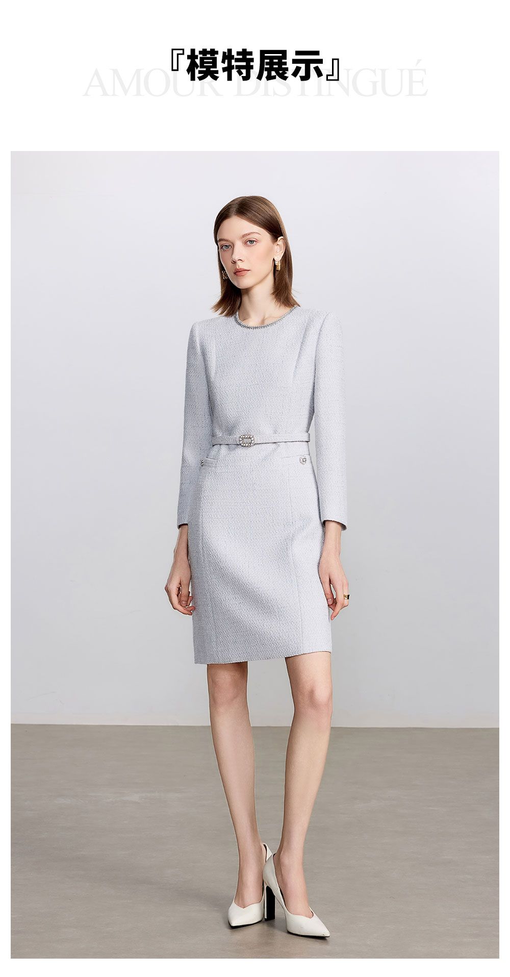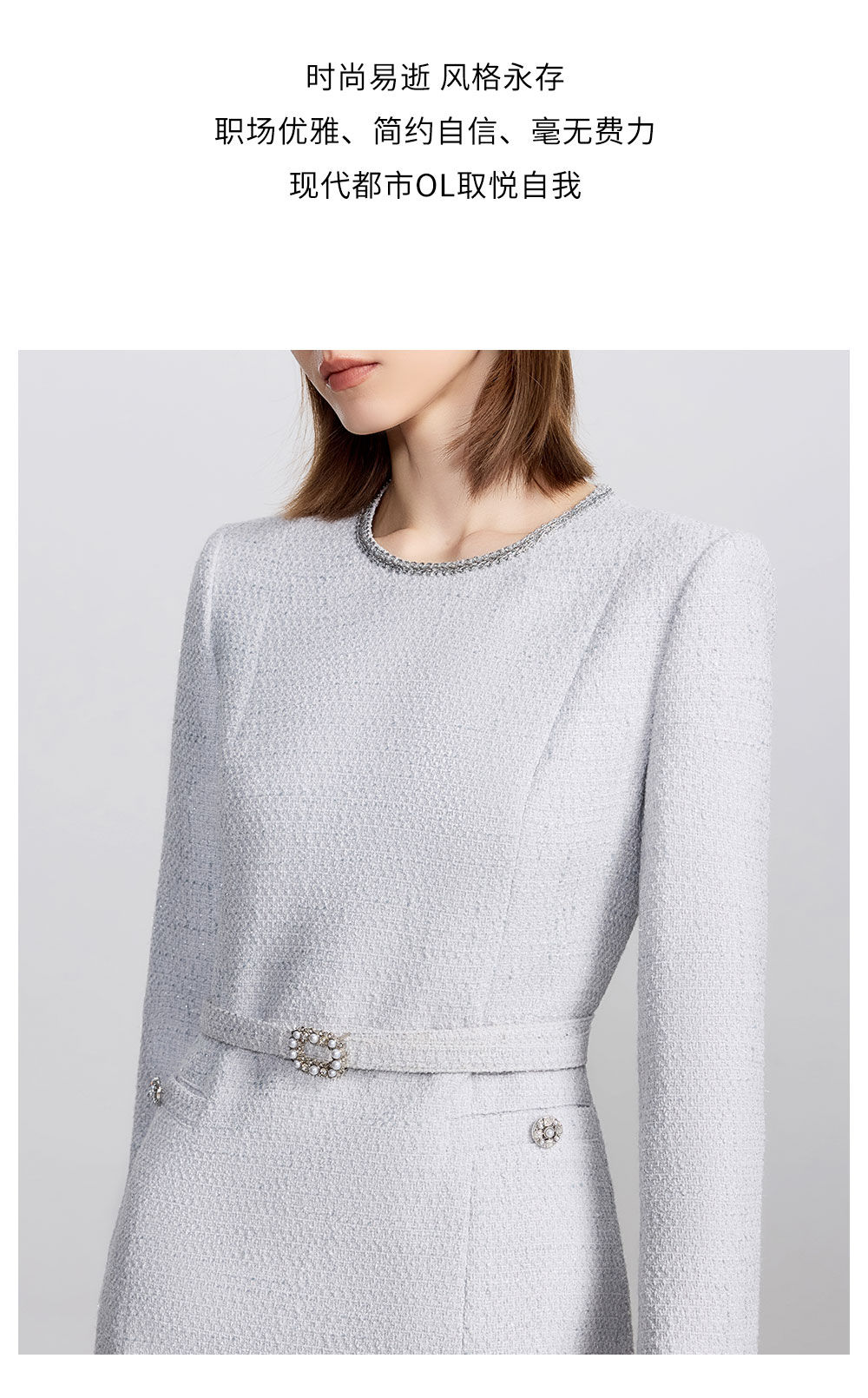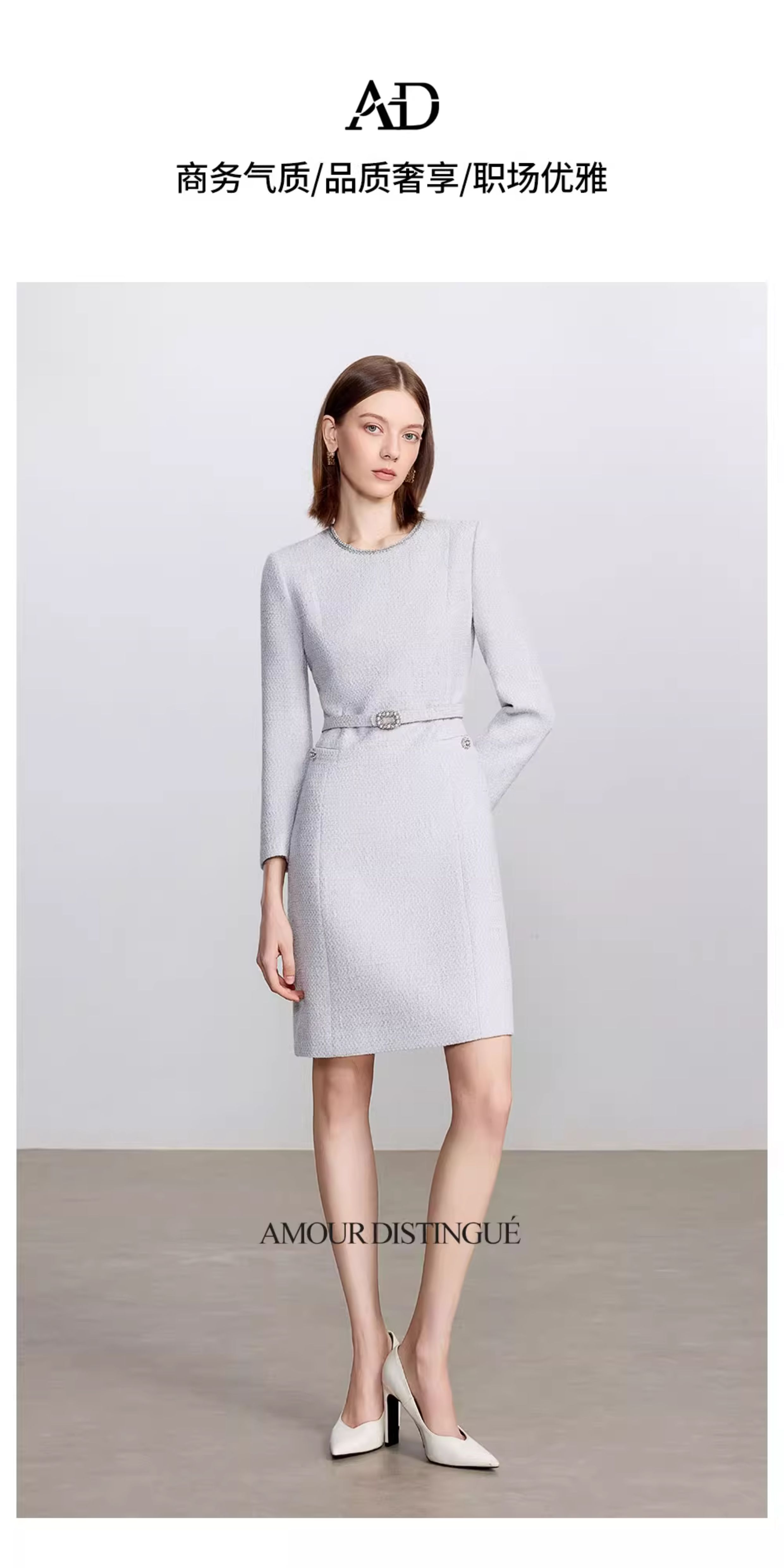 AD高级千金长袖连衣裙女2025新款秋冬灰色系带显瘦a字短裙毛呢裙