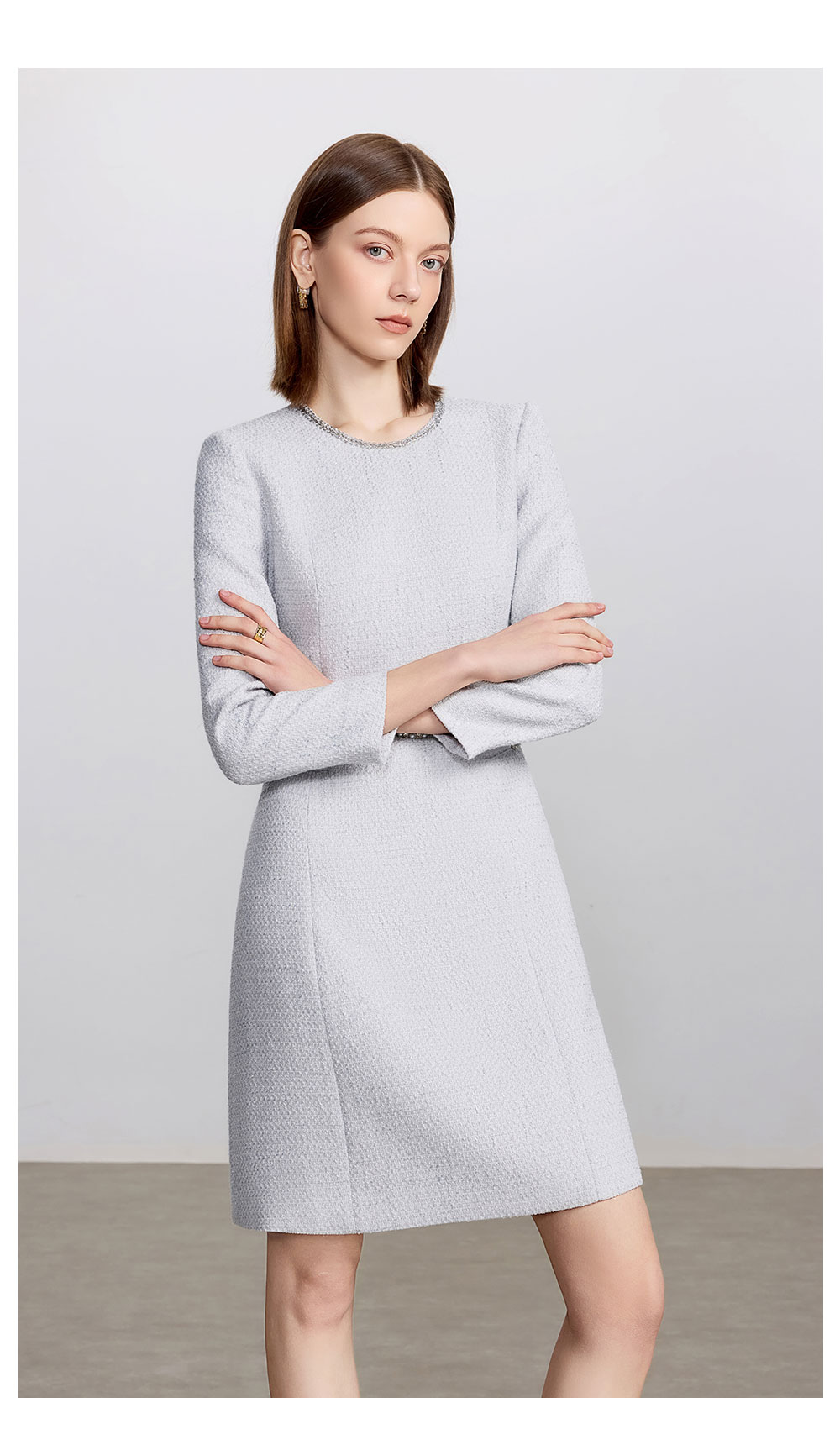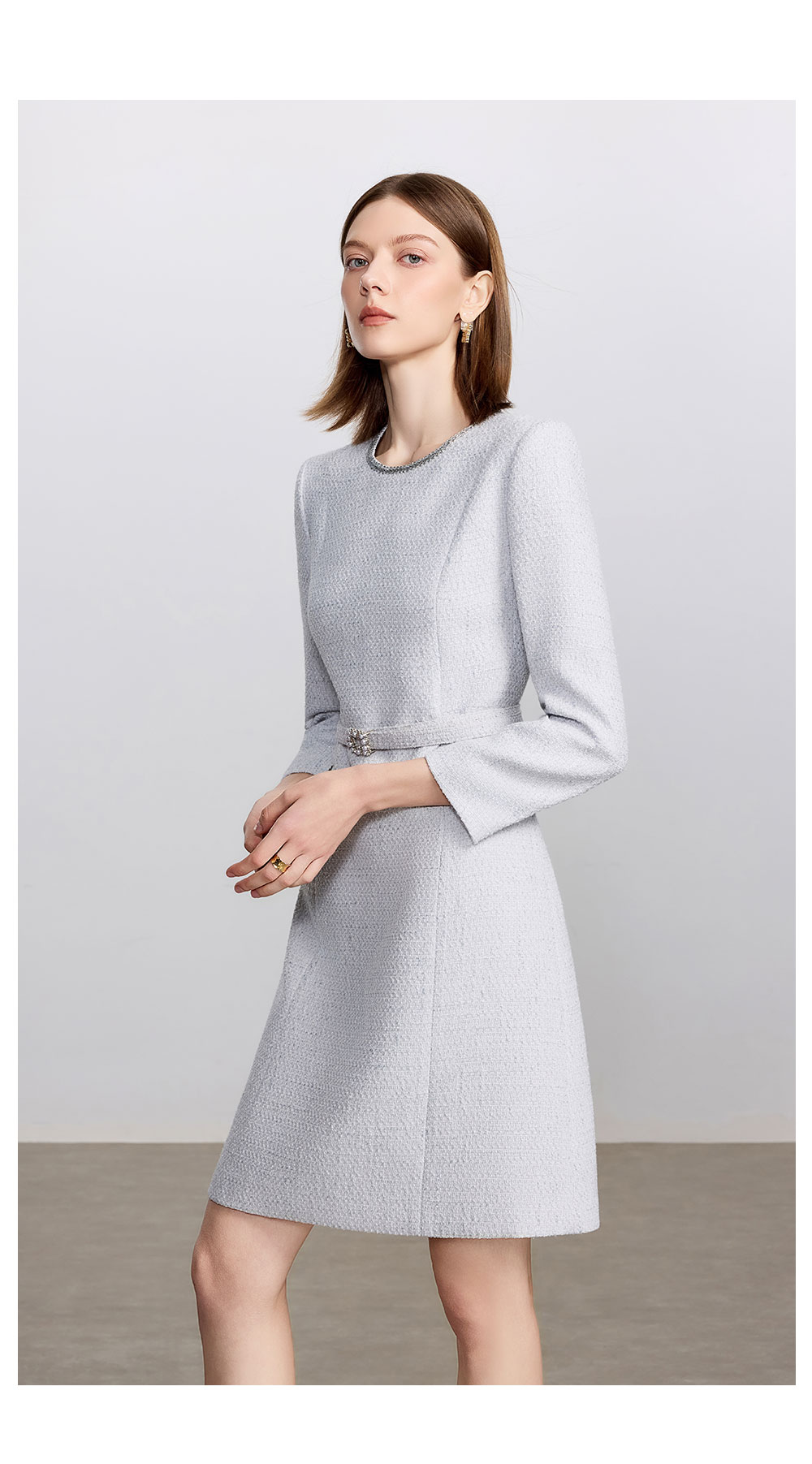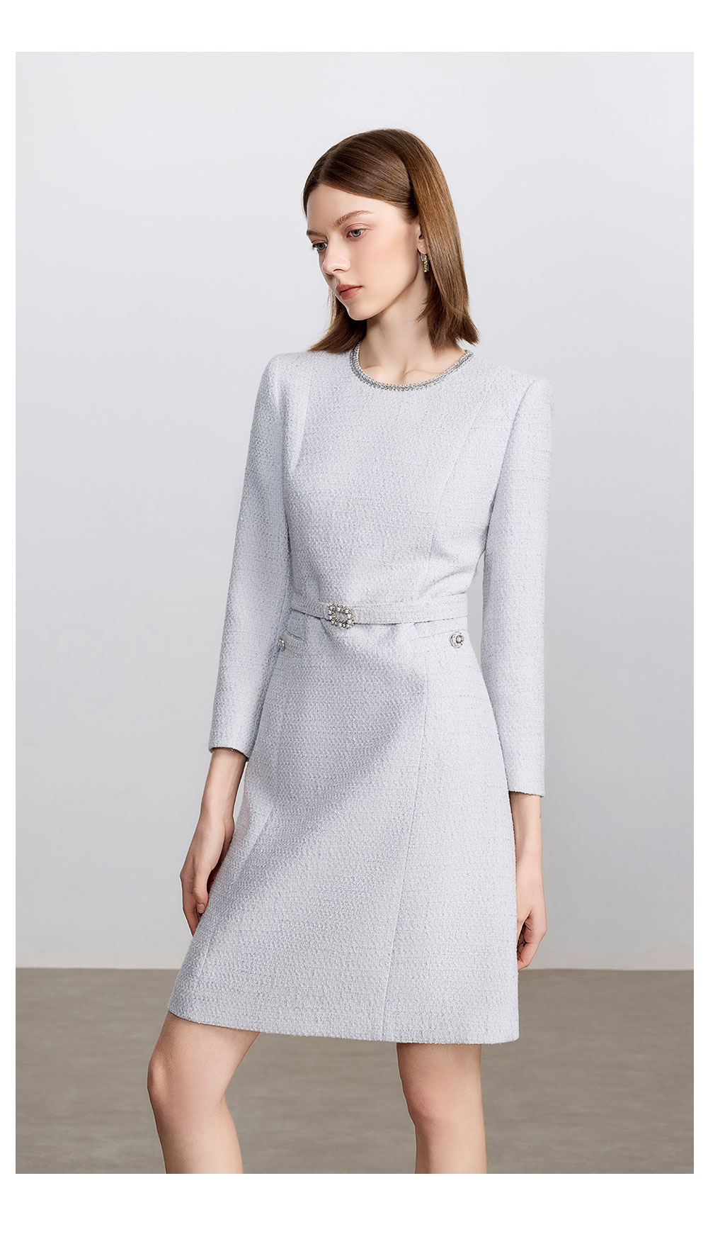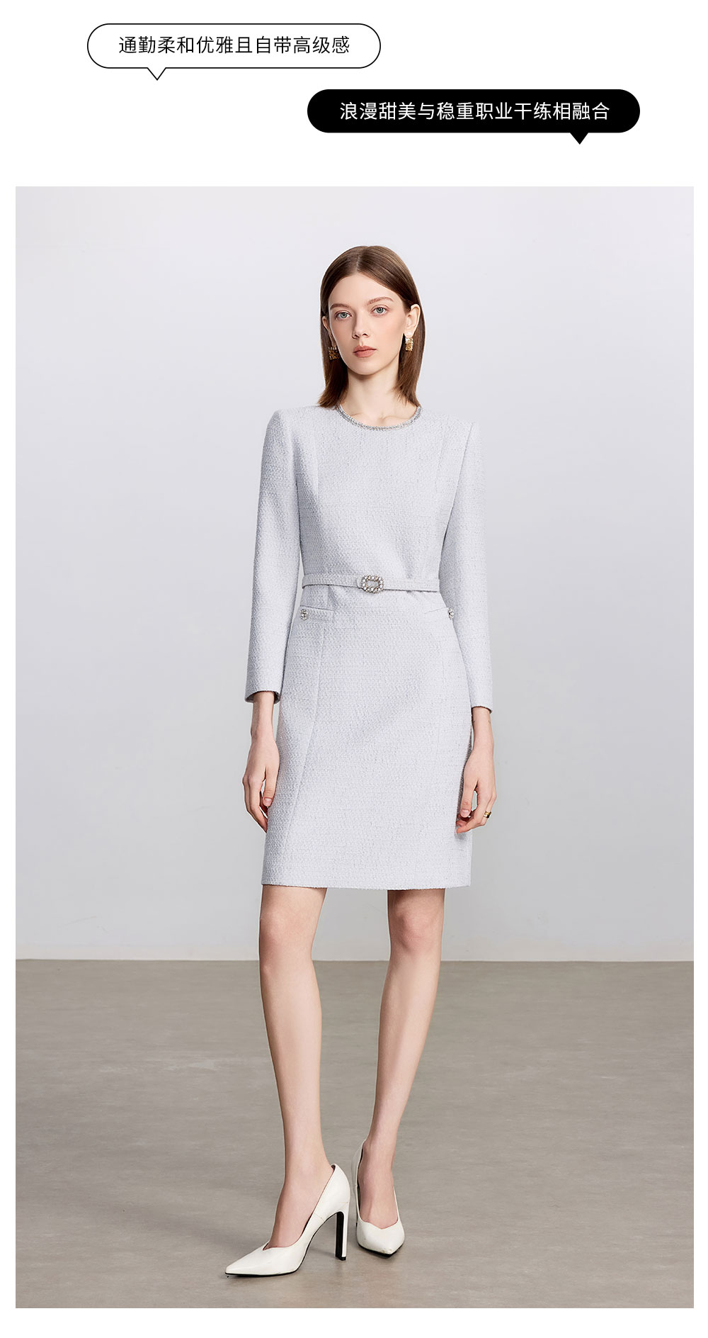AD高级千金长袖连衣裙女2025新款秋冬灰色系带显瘦a字短裙毛呢裙