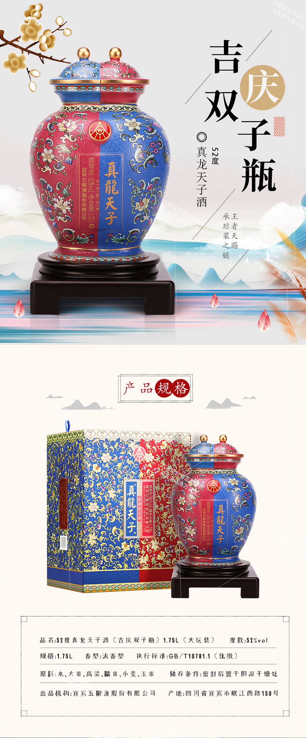 真龙天子酒(吉庆双子瓶)52度浓香型白酒 1.75L 大坛装 收藏送礼