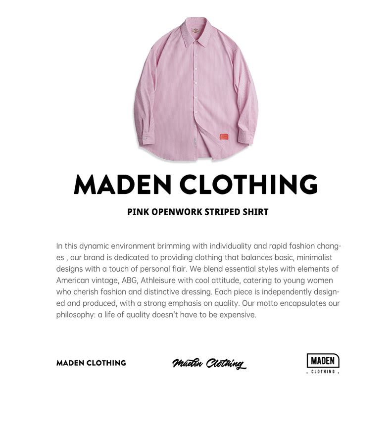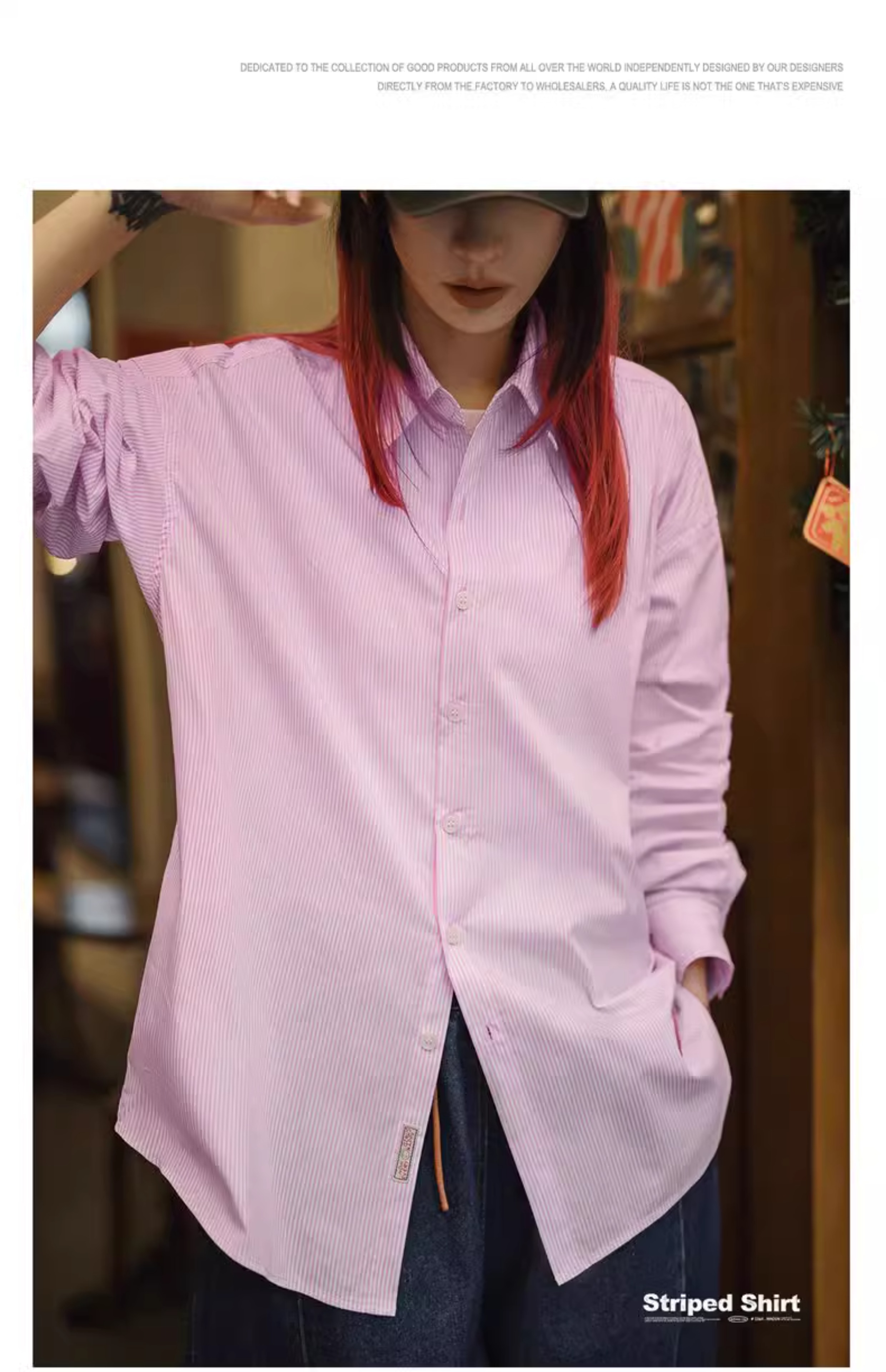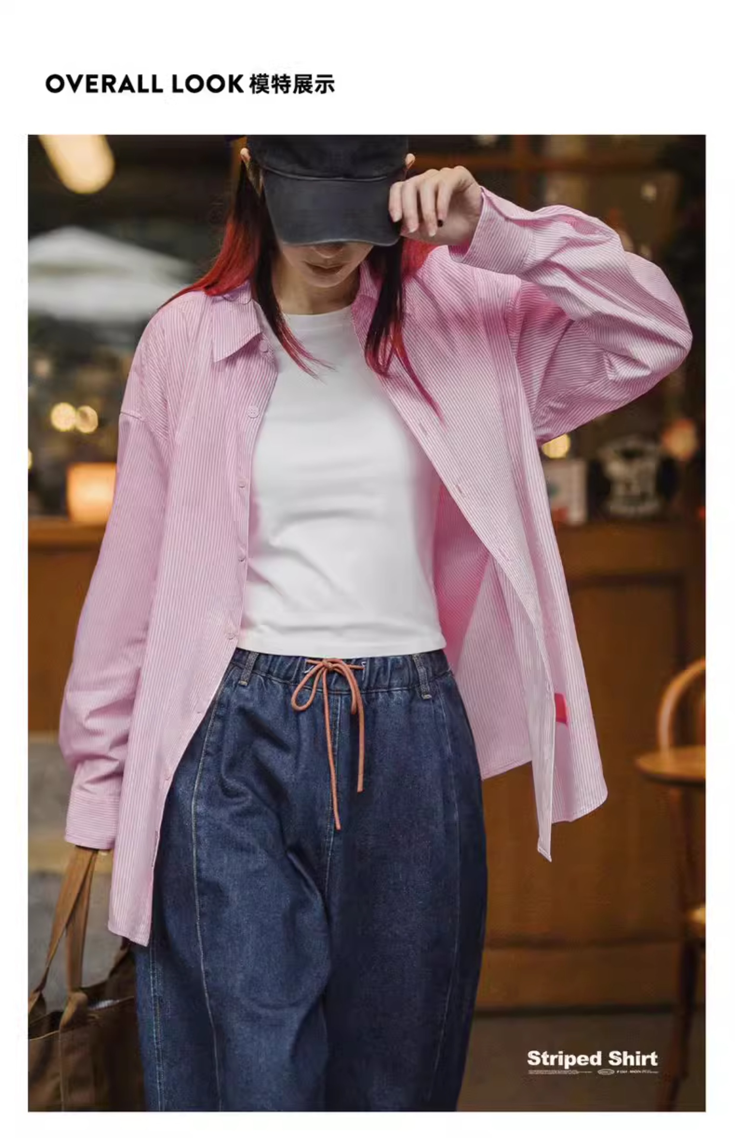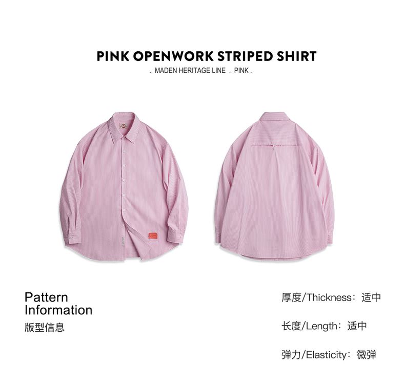 马登浅春系粉白条纹衬衫慵懒度假风外套微弹镂空oversize上衣春女