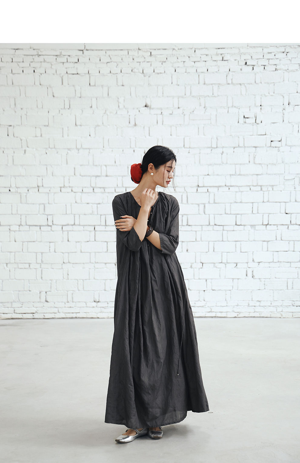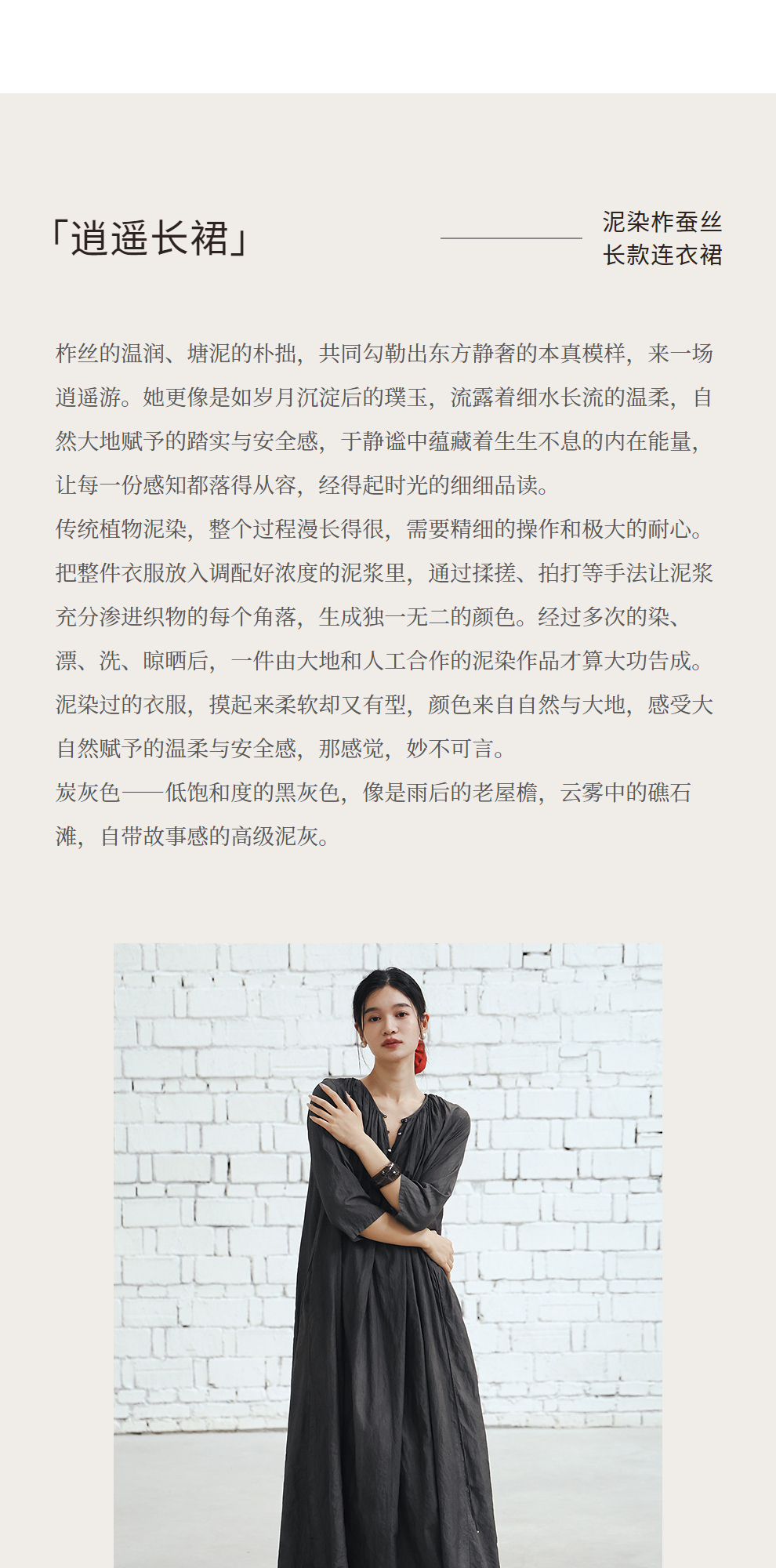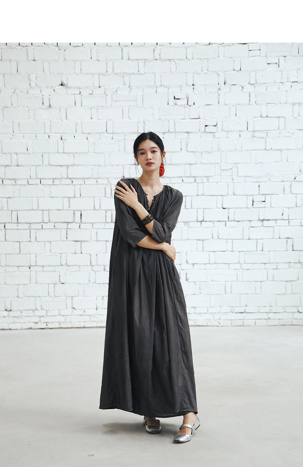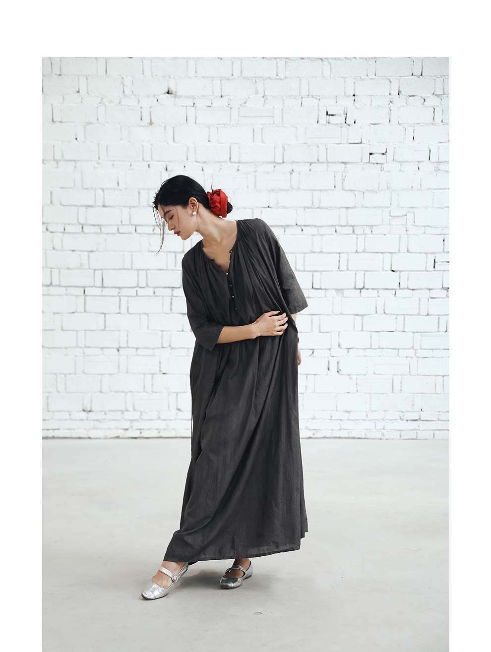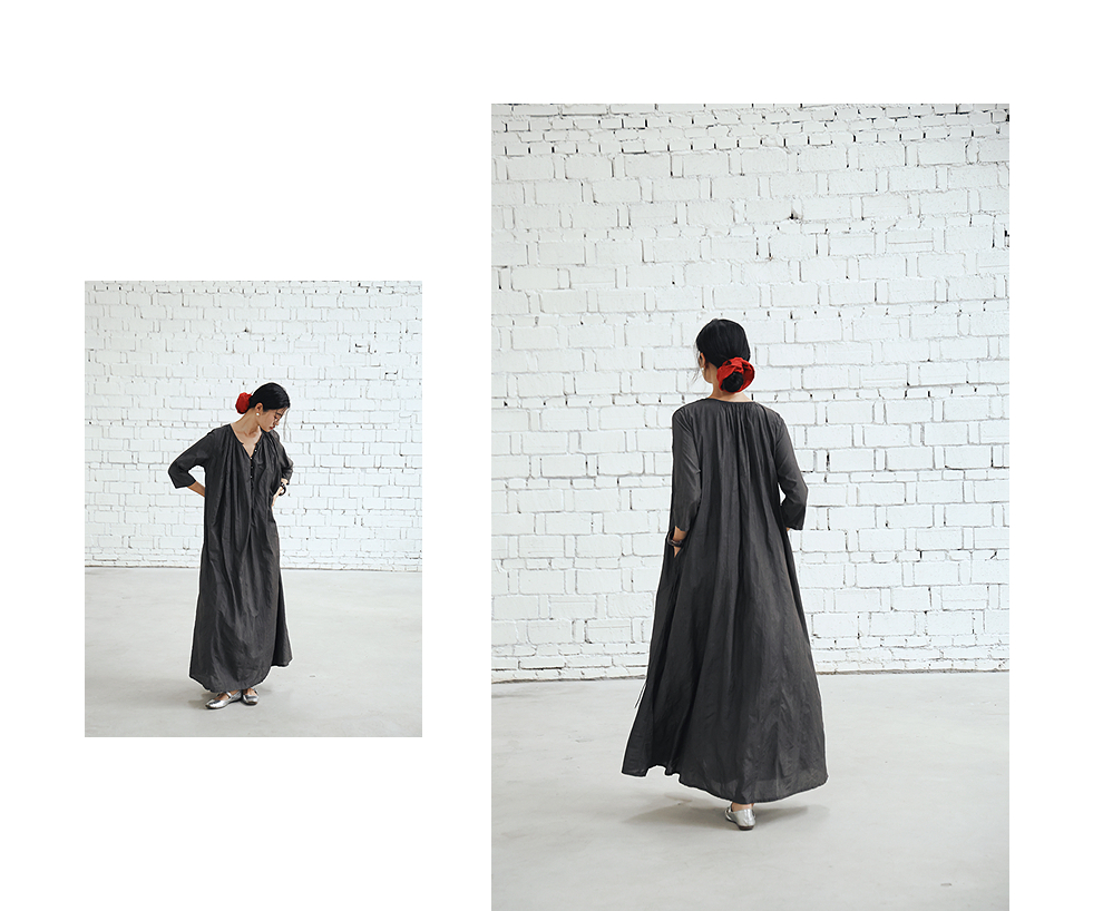 绽放465朵/【黑白灰系列·逍遥长裙】泥染柞蚕丝长款半开襟连衣裙