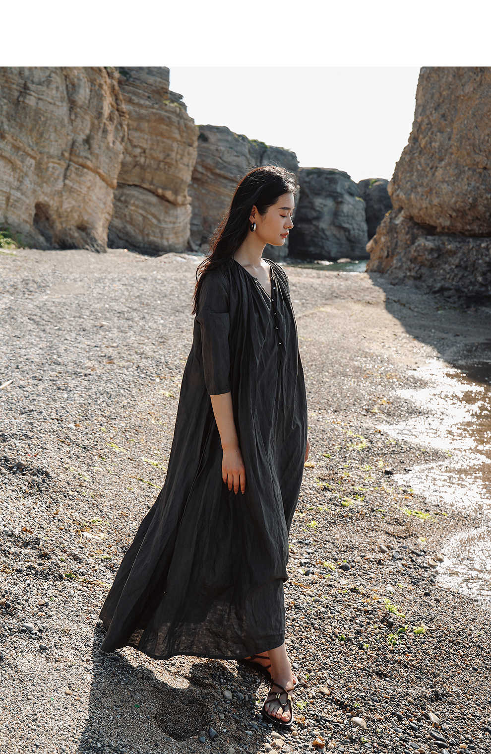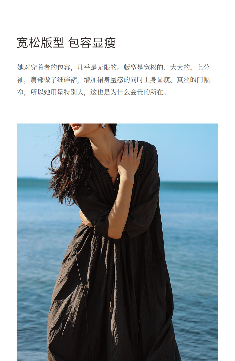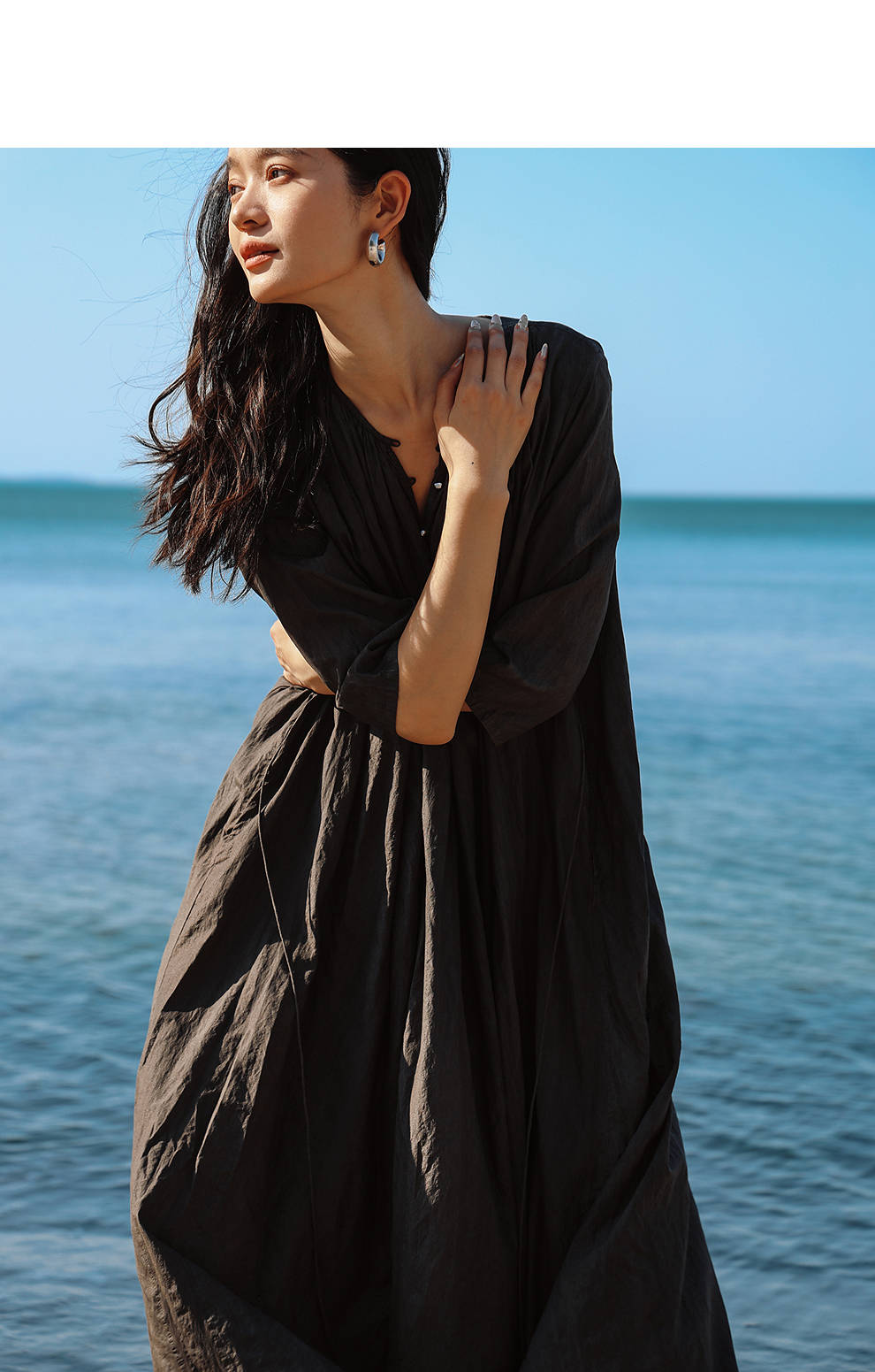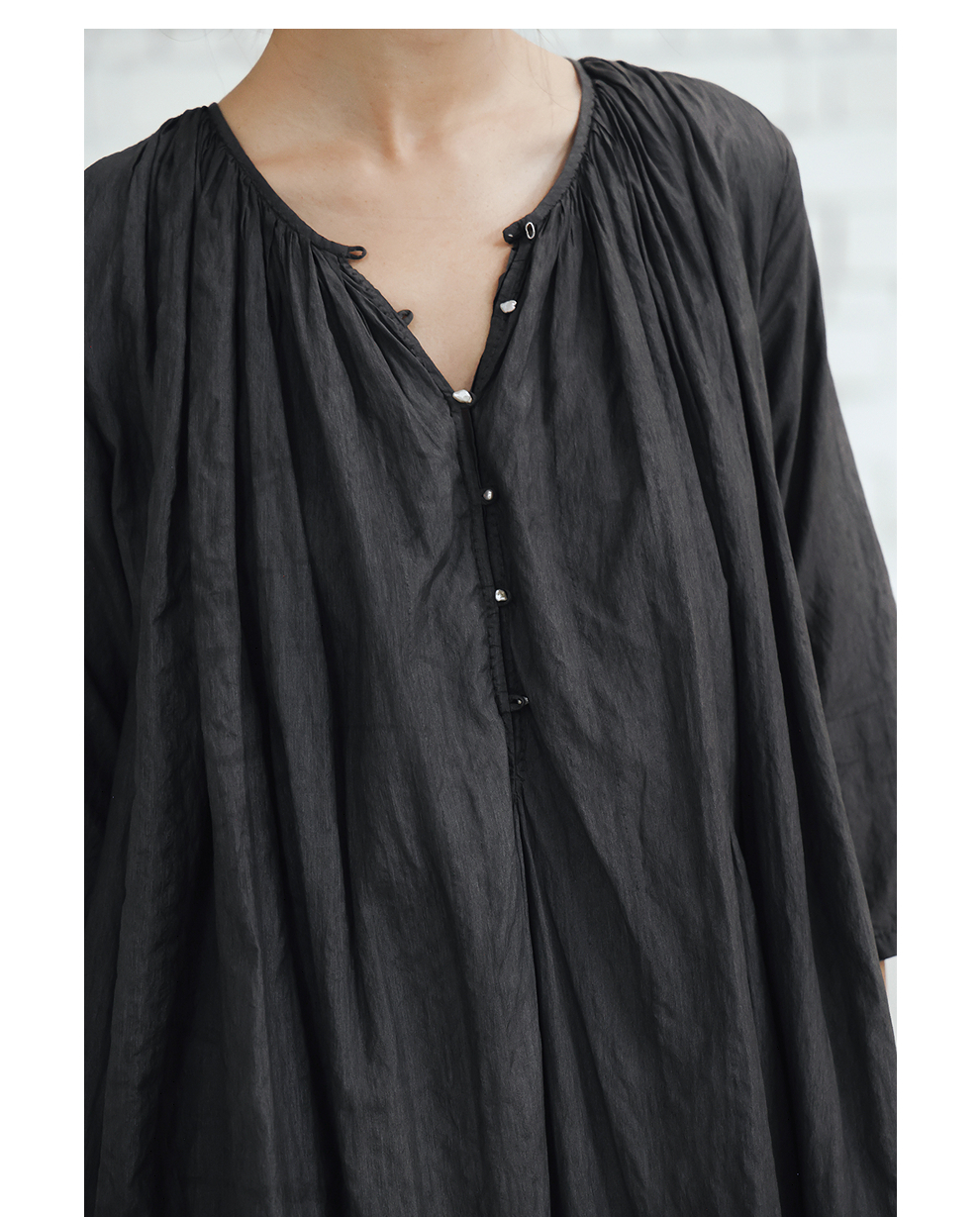 绽放465朵/【黑白灰系列·逍遥长裙】泥染柞蚕丝长款半开襟连衣裙