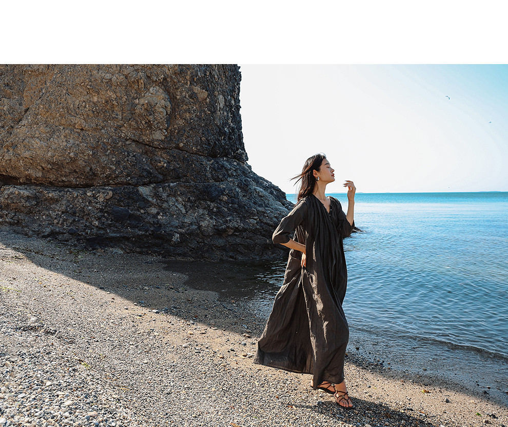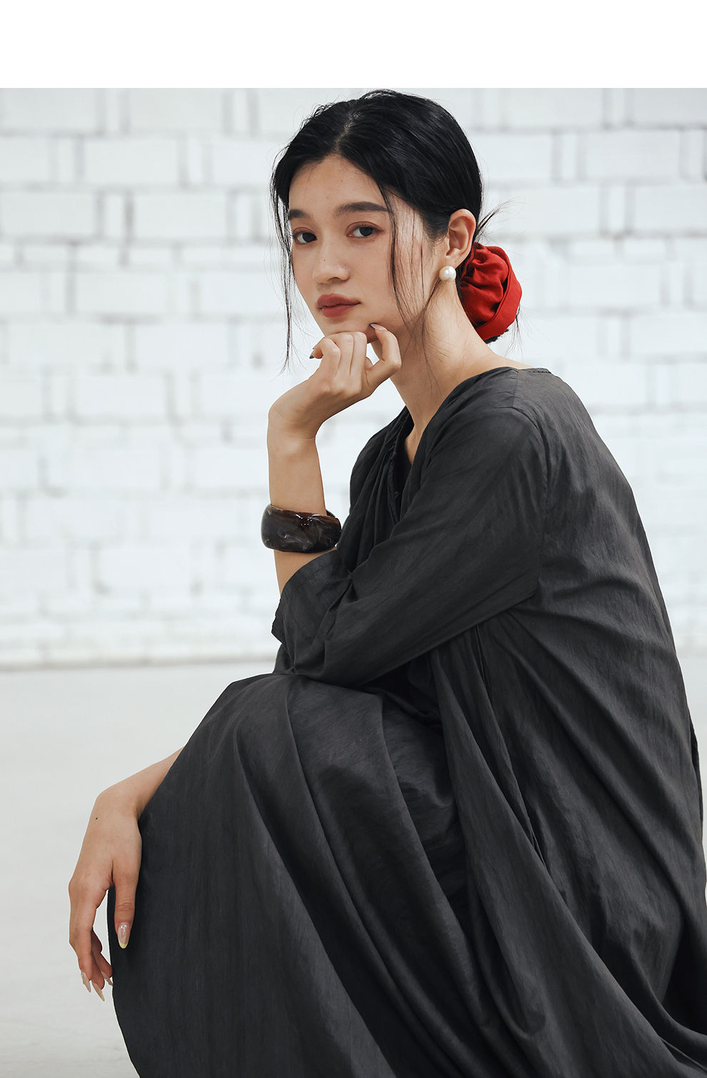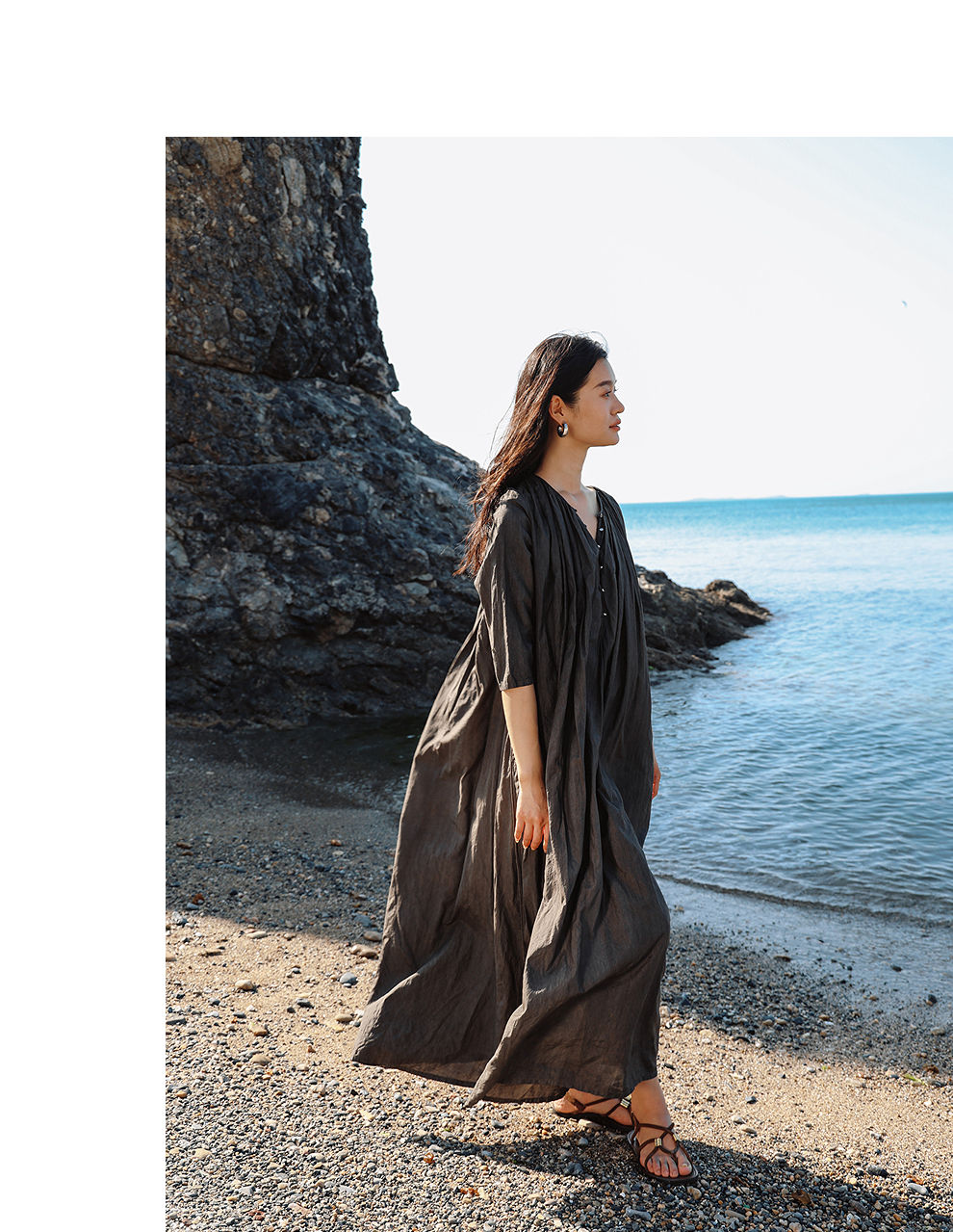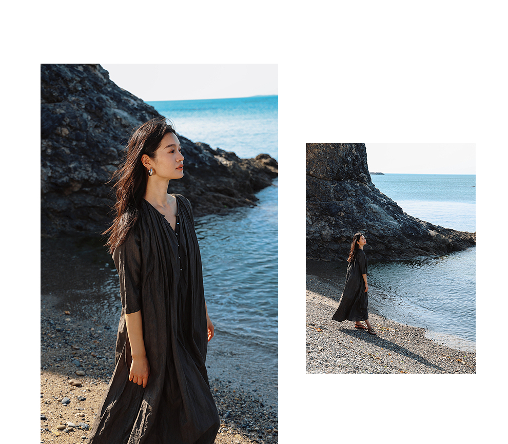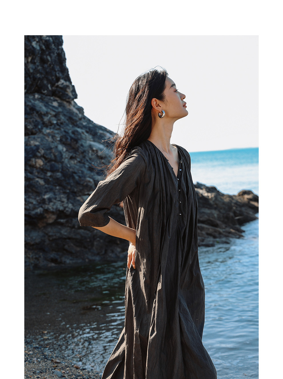 绽放465朵/【黑白灰系列·逍遥长裙】泥染柞蚕丝长款半开襟连衣裙