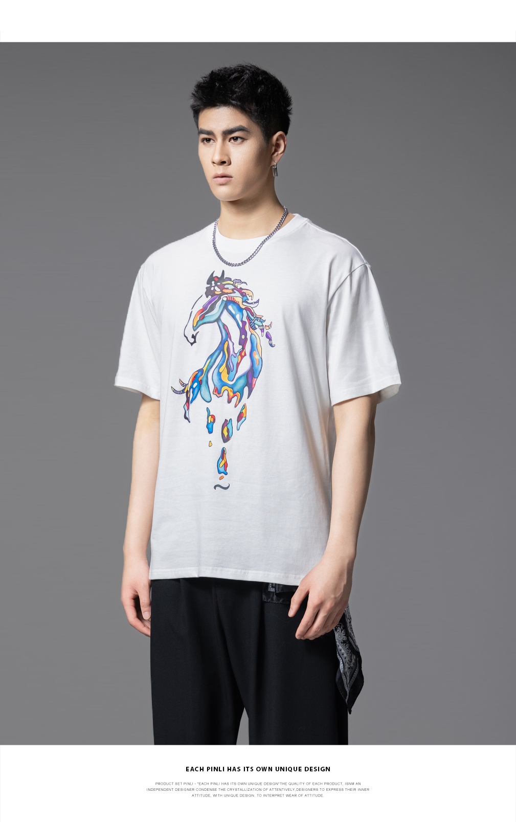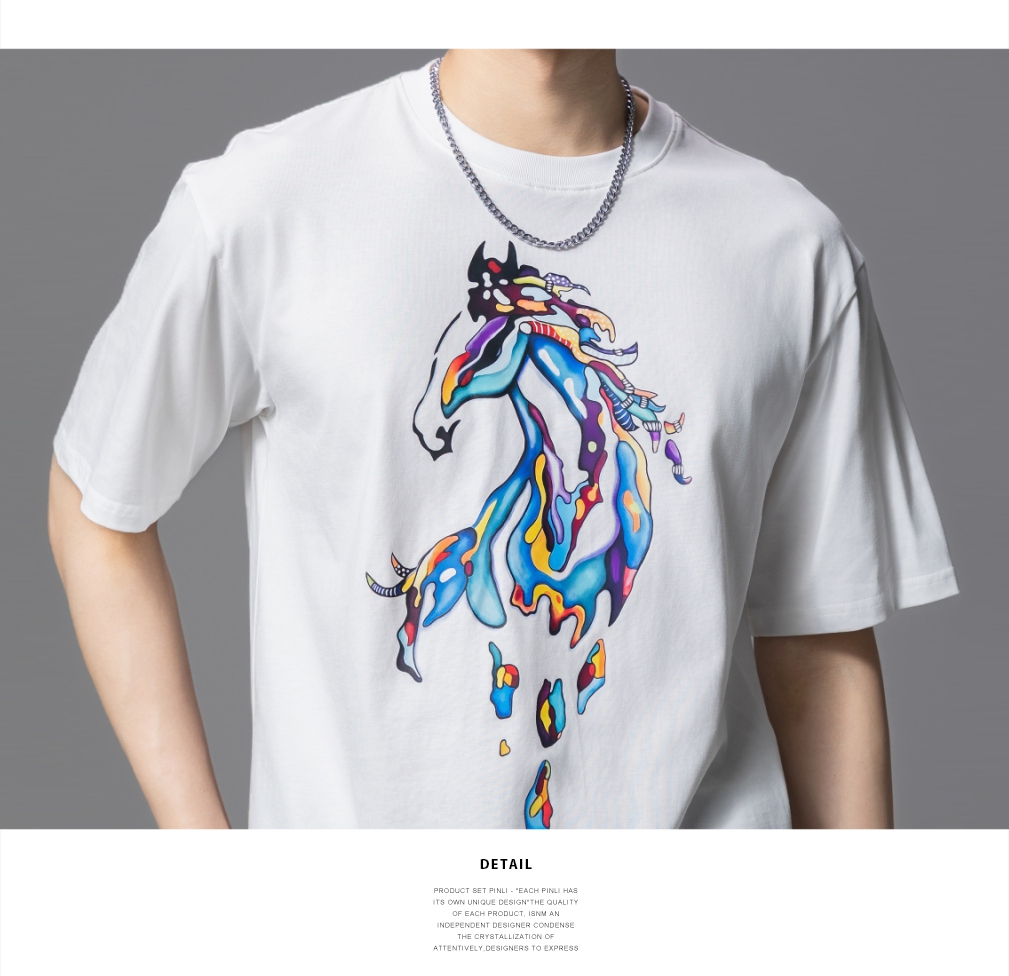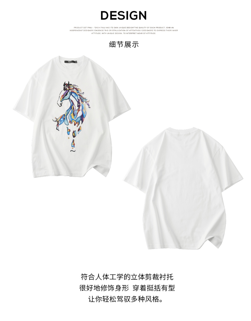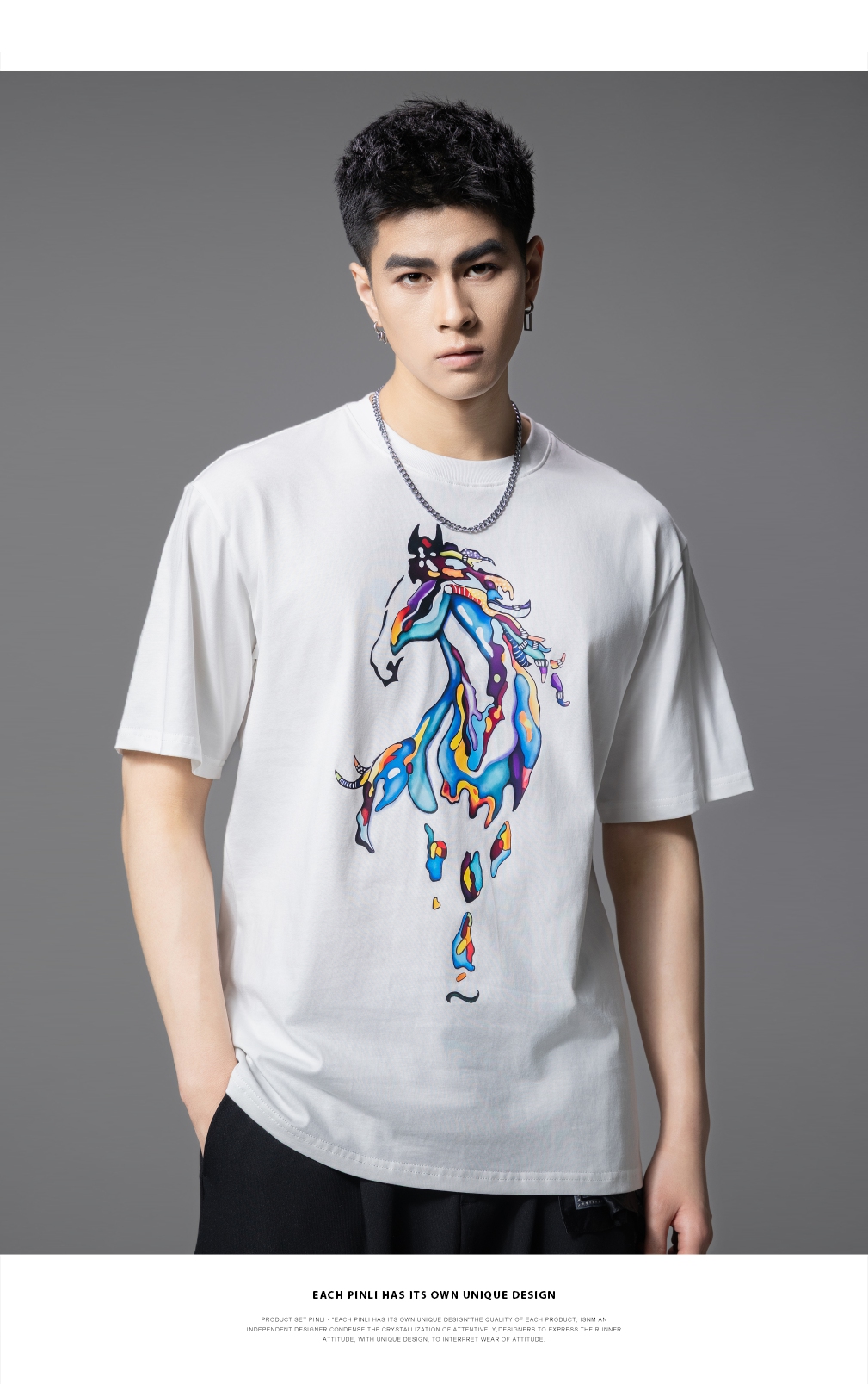 PINLI品立2025夏季新款彩色骏马烫画短袖T恤男士国潮休闲百搭上衣BG252111021