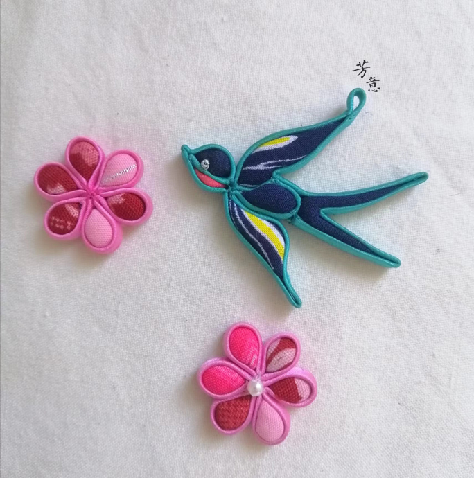 工艺:传统技艺,手工制作。历经十道工序:真丝预缩熨烫,真丝刮浆,柔软真丝,裁条,折烫,嵌铜丝,塑形固定,嵌芯,打籽绣眼睛,粘底布。