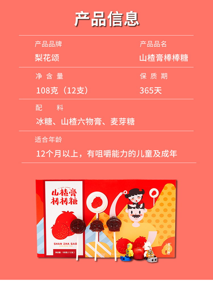 产品名:山楂膏棒棒糖 规格:10支/袋、10支/袋*2、12支/盒、12支/盒*2 送手提袋 保质期:12个月 售卖期:全年 包装方式:纸箱 产地/发货地:山东烟台 发货快递:申通/圆通 发货区域:青海,西藏、新疆不发,其他地方包邮。 温馨提醒: 山楂膏棒棒糖不指定快递,申通/圆通快递发货,如指定快递,需加钱,请知悉。 |