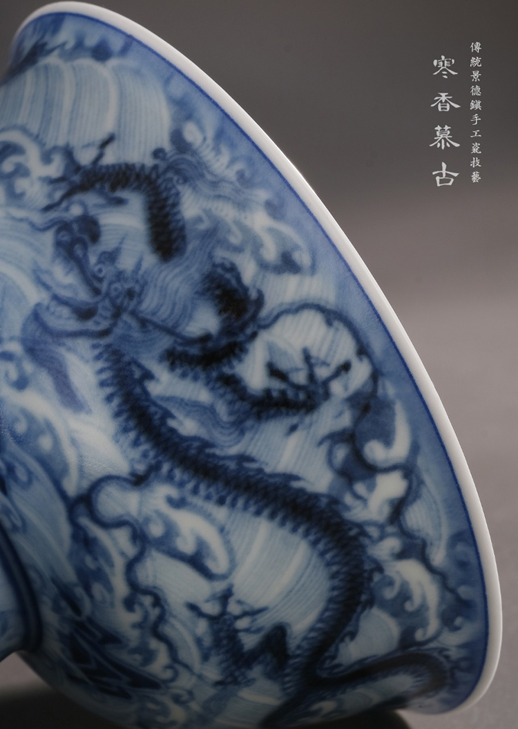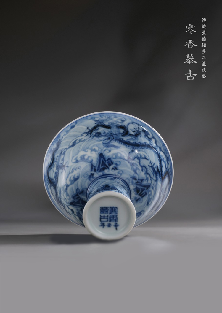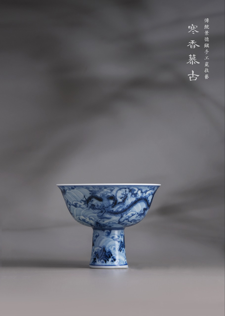 寒香慕古元明青花糯米釉海水江涯双龙纹高脚杯