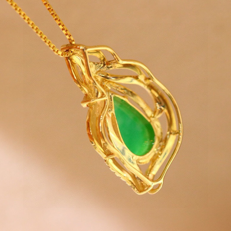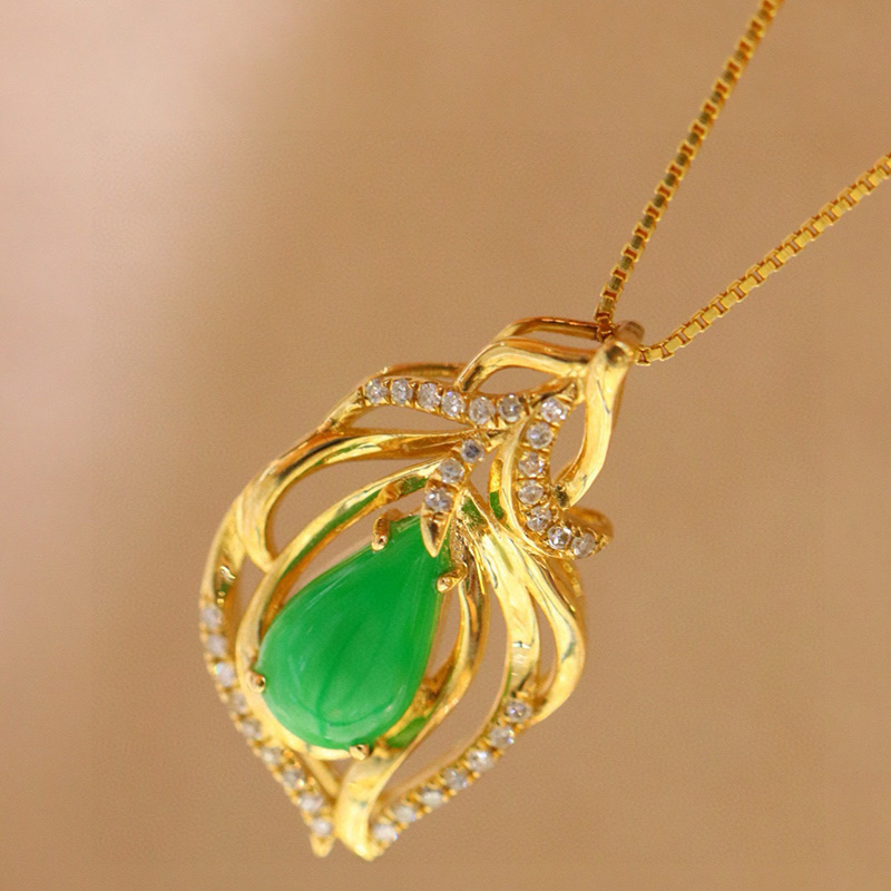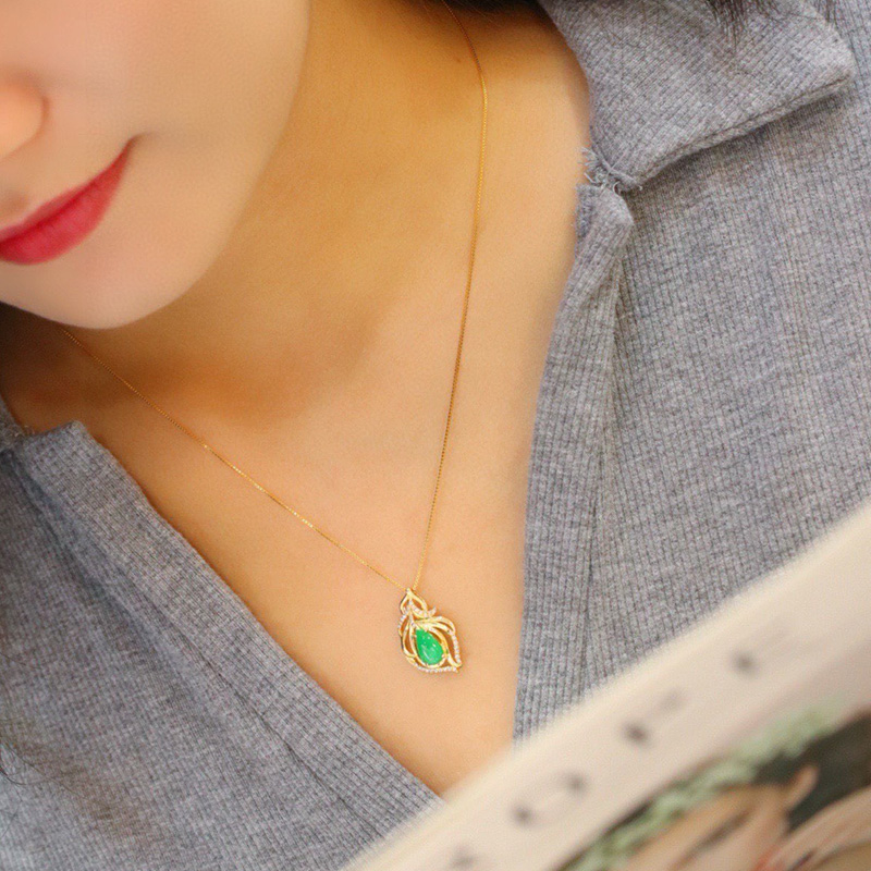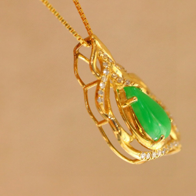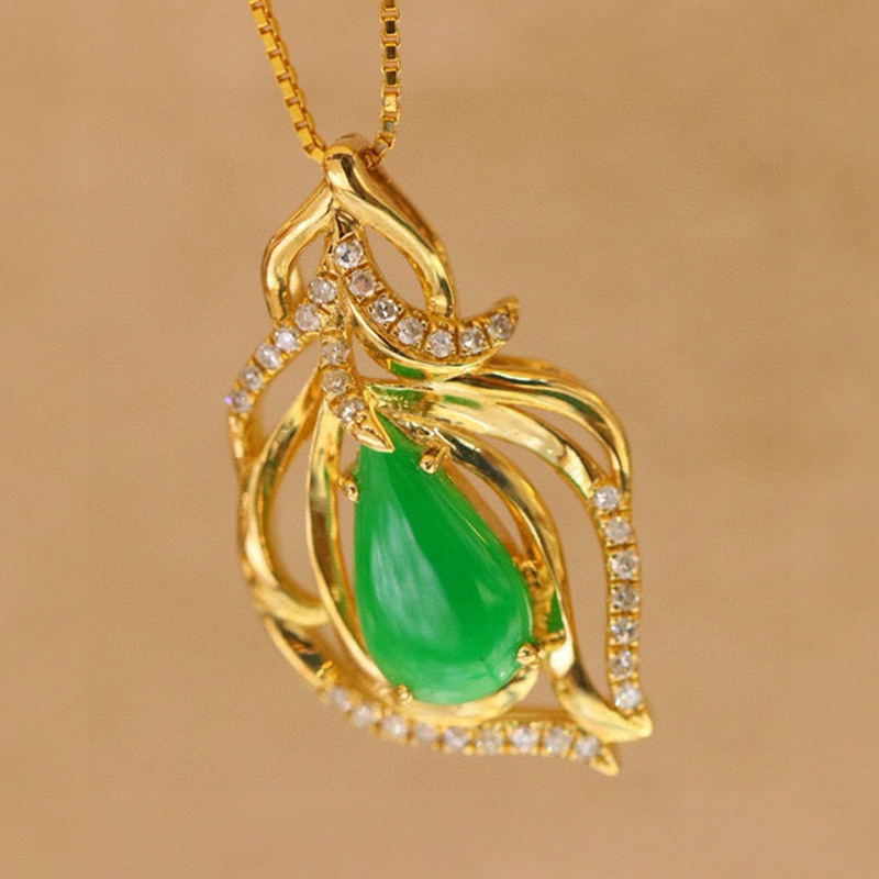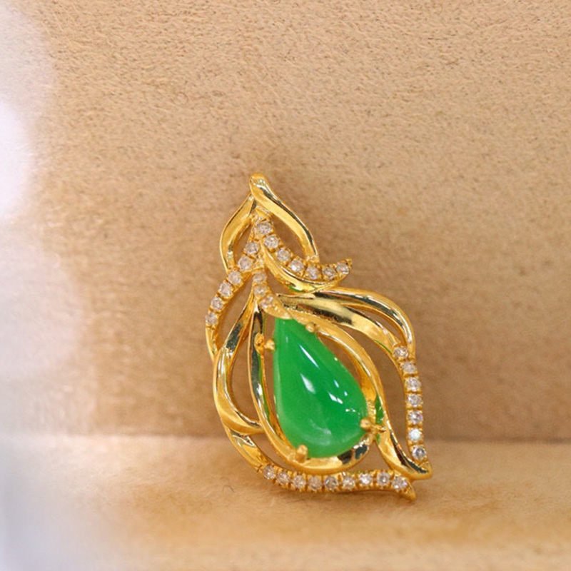 天然翡翠A货吊坠,辣色阳绿,种水足,9.4*5.4mm的尺寸,18k黄金镶嵌天然钻石,羽毛造型,线条流畅自然