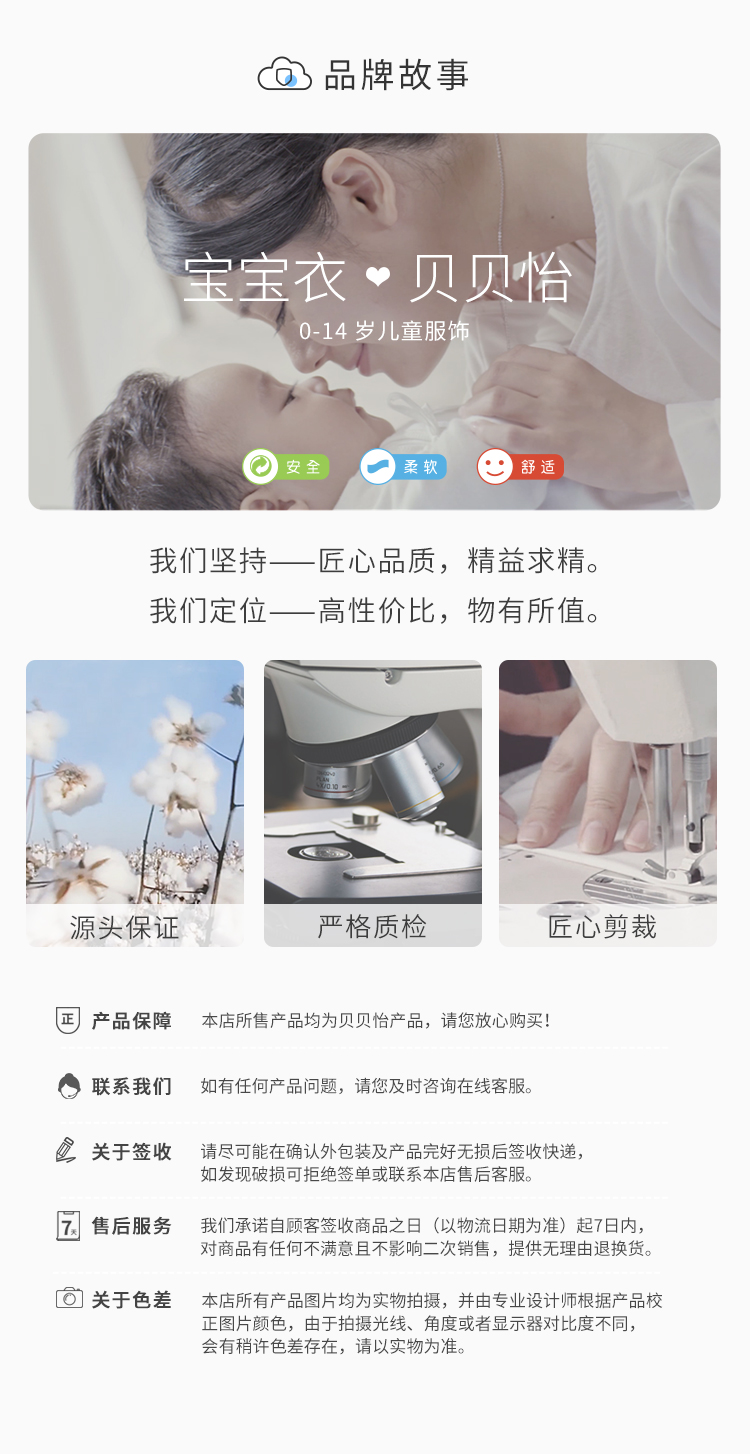 - 贝贝怡专注0-6岁婴幼儿服饰,坚持安全、柔软、舒适的产品理念,为千万中国家庭提供超高品质、安全可靠的婴幼儿服饰产品,妈妈放心,宝宝开心!