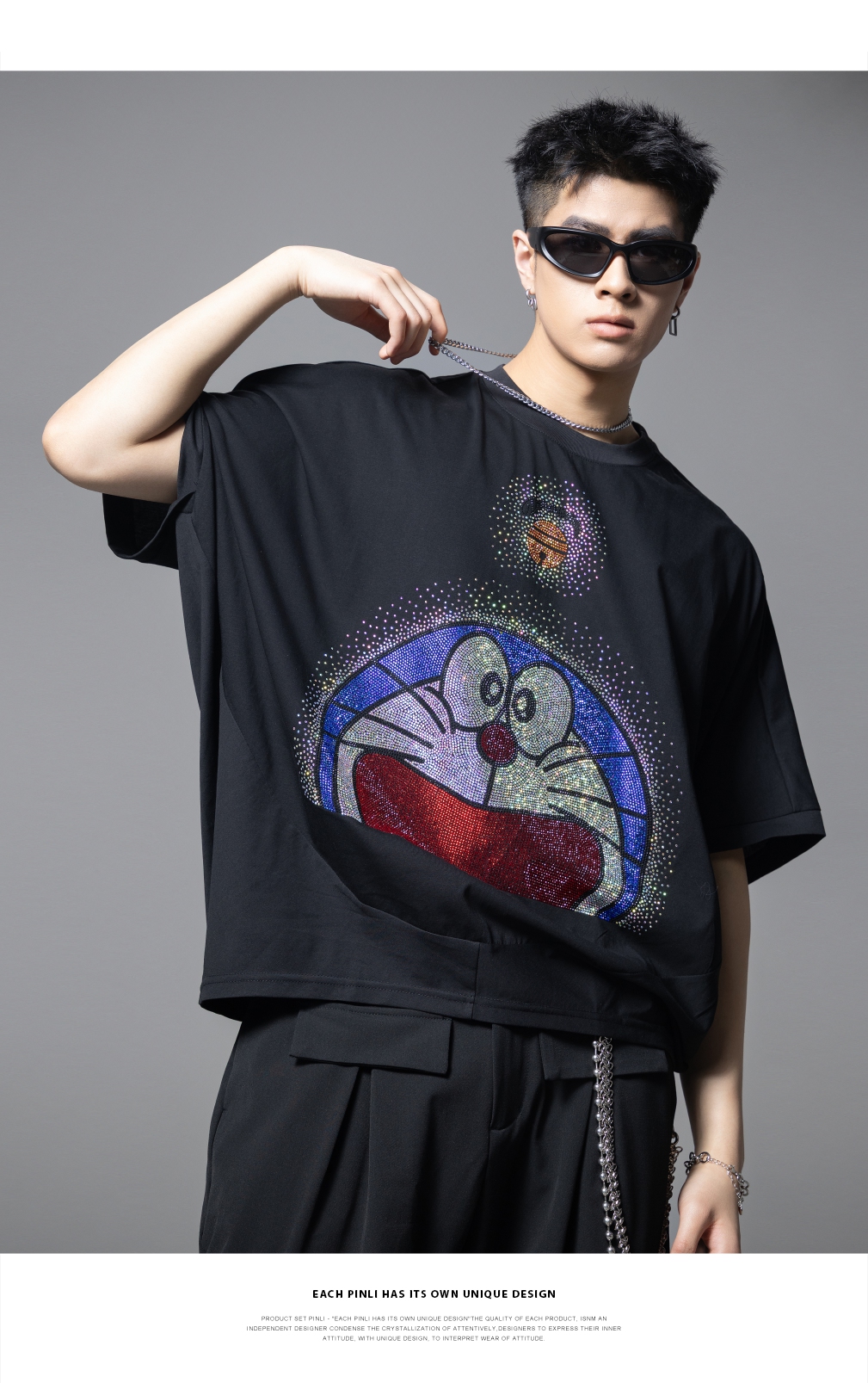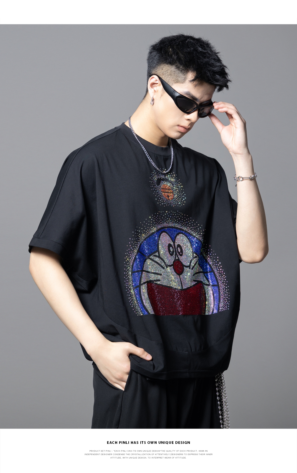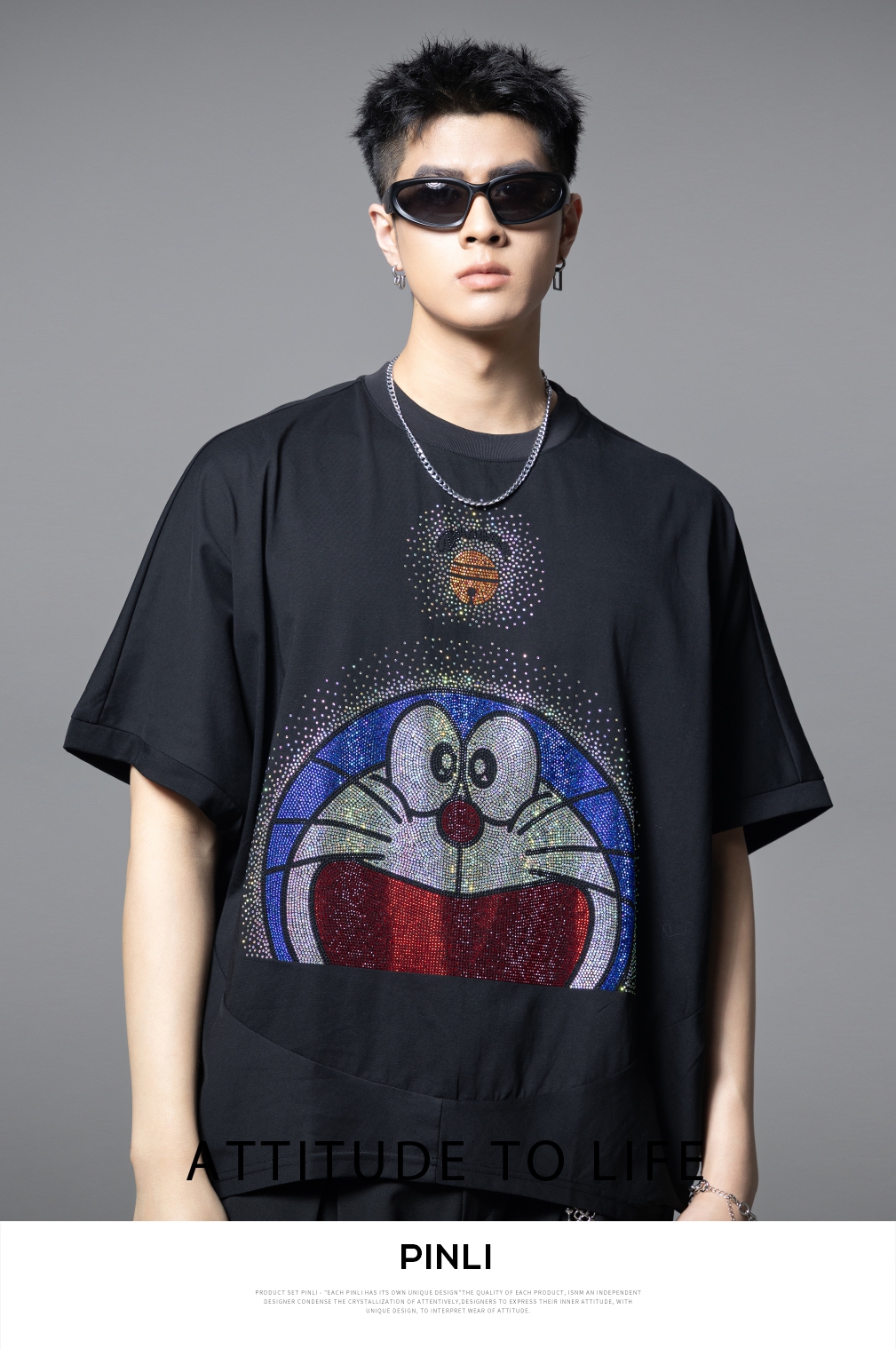 PINLI品立2025夏季新款男士宽松廓形哆啦A梦烫钻圆领短袖T恤上衣BG252111055